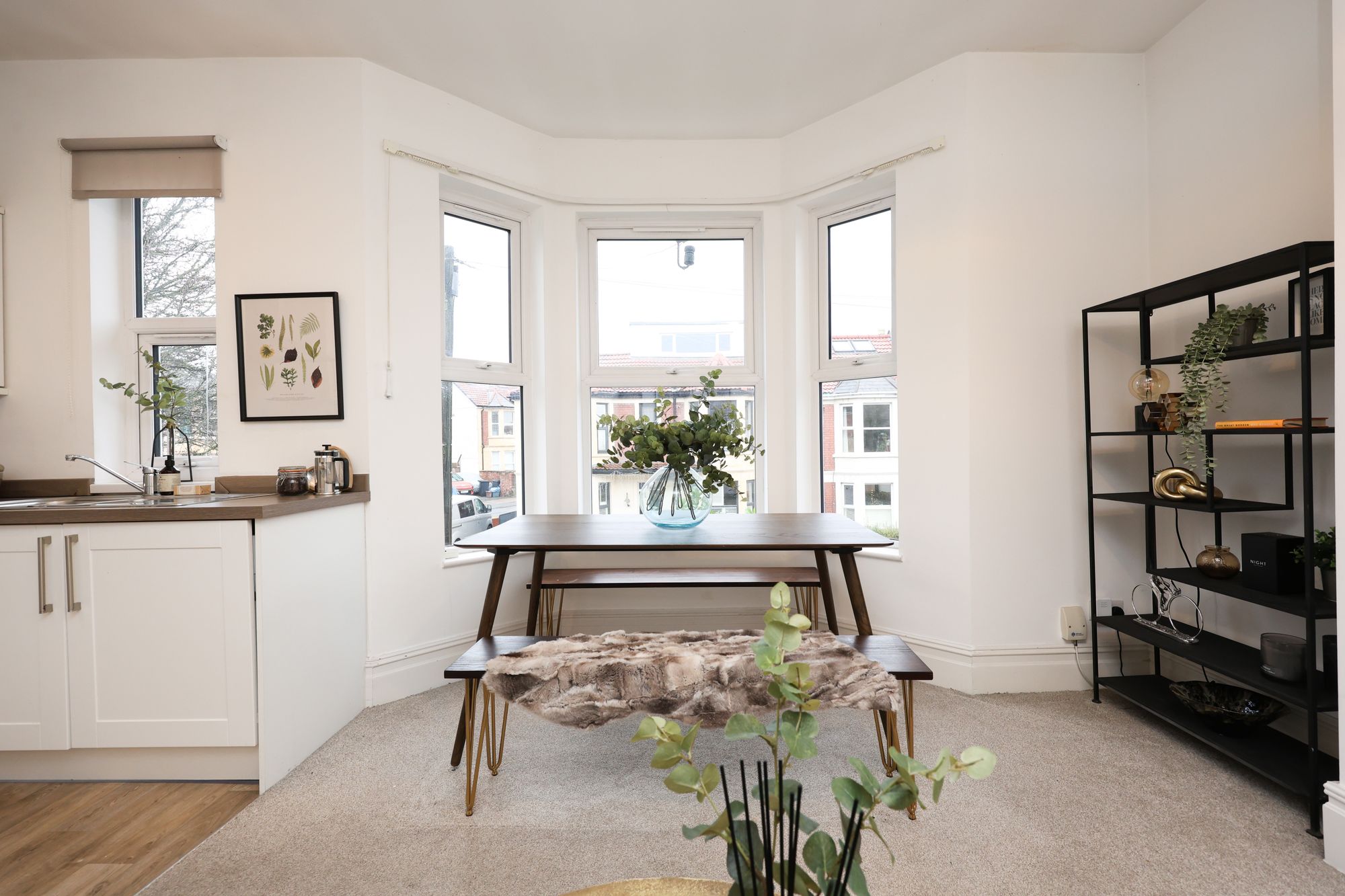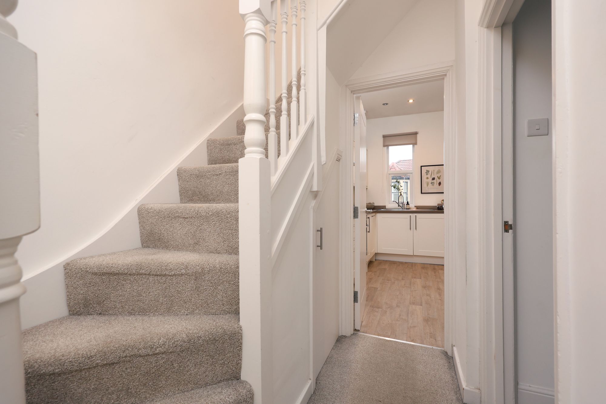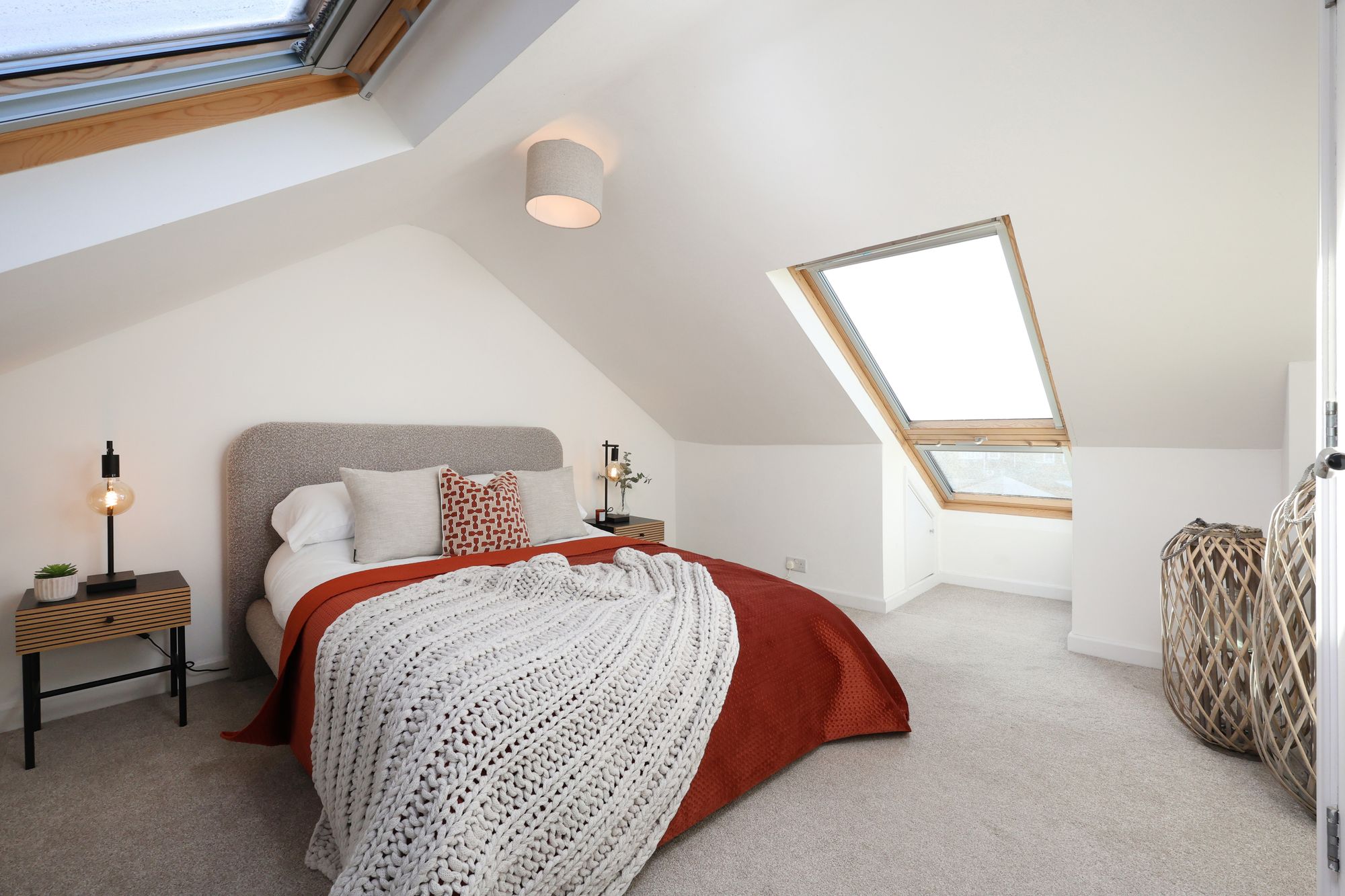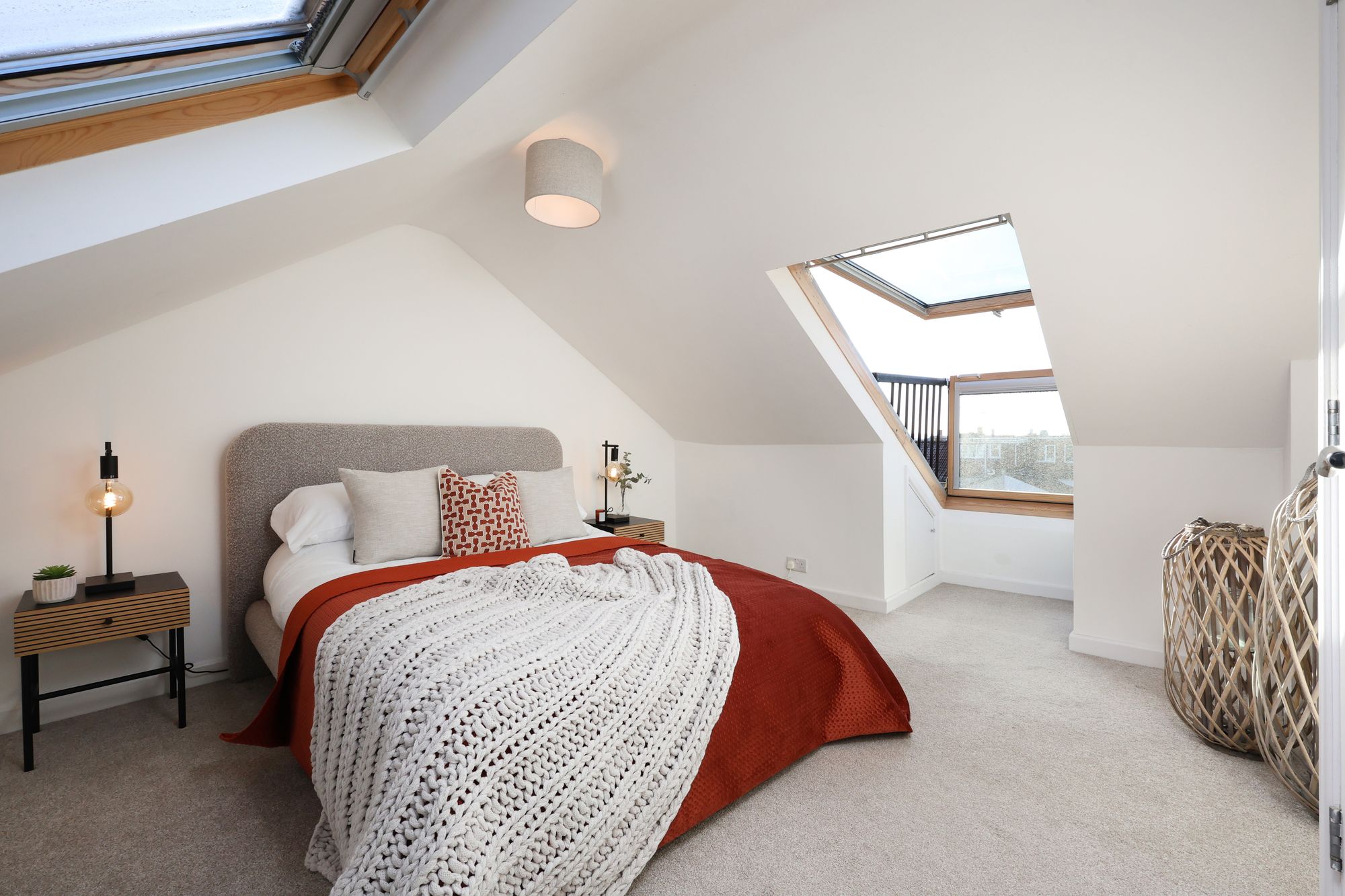 The property boasts a welcoming open-plan living and kitchen area, where modern kitchen units with integrated appliances and sleek cabinetry create a seamless blend of functionality and contemporary style. Large bay windows and additional expansive windows throughout flood the living spaces with natural light, enhancing the airy, open feel and highlighting the elegant, neutral decor. The reception room is a flexible space, ideally suited to relaxing or entertaining, with chic furnishings, decorative shelving, and tasteful artwork (not included in the sale) that showcase both the character and practicality on offer. The flat includes two generously sized bedrooms, each with plush carpeting and ample space for furniture, ensuring both comfort and convenience. Bedroom two on the top floor has access to eaves storage and features a large skylight/balcony, which provides far-reaching views from the rear.
