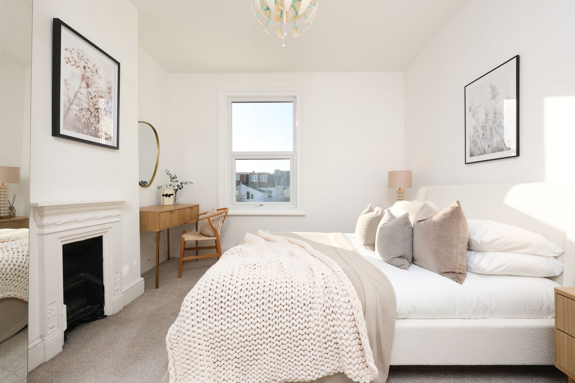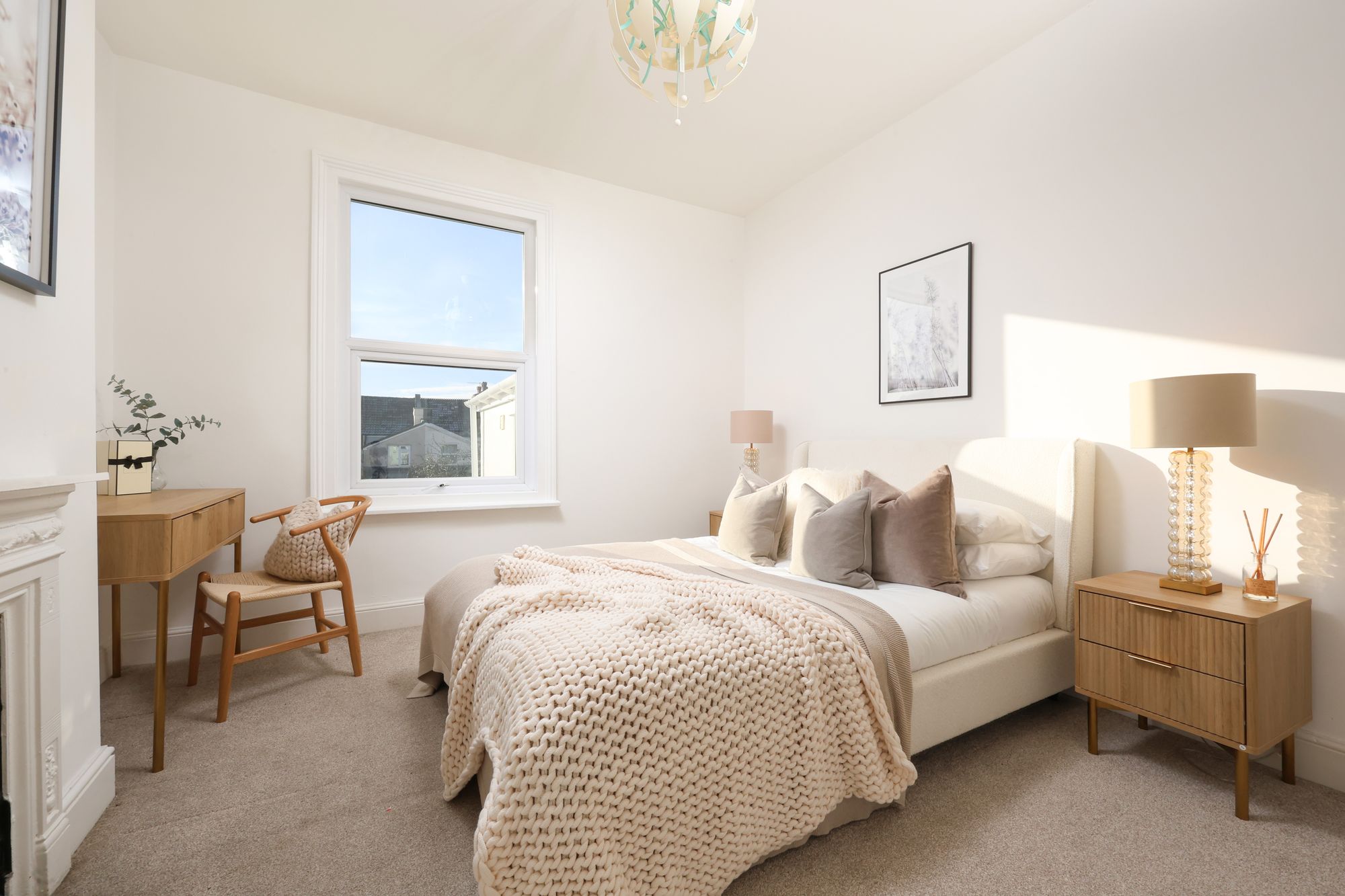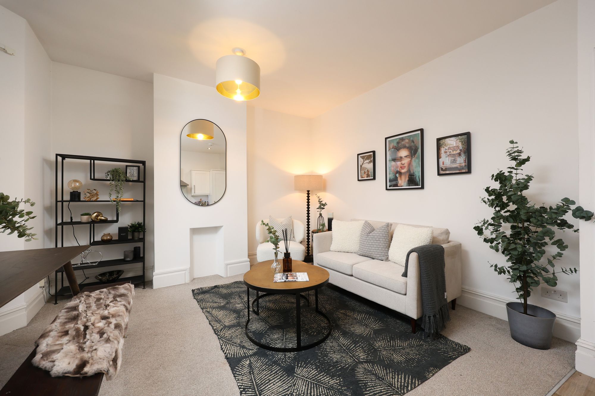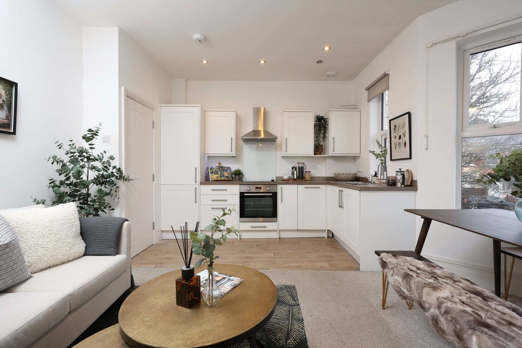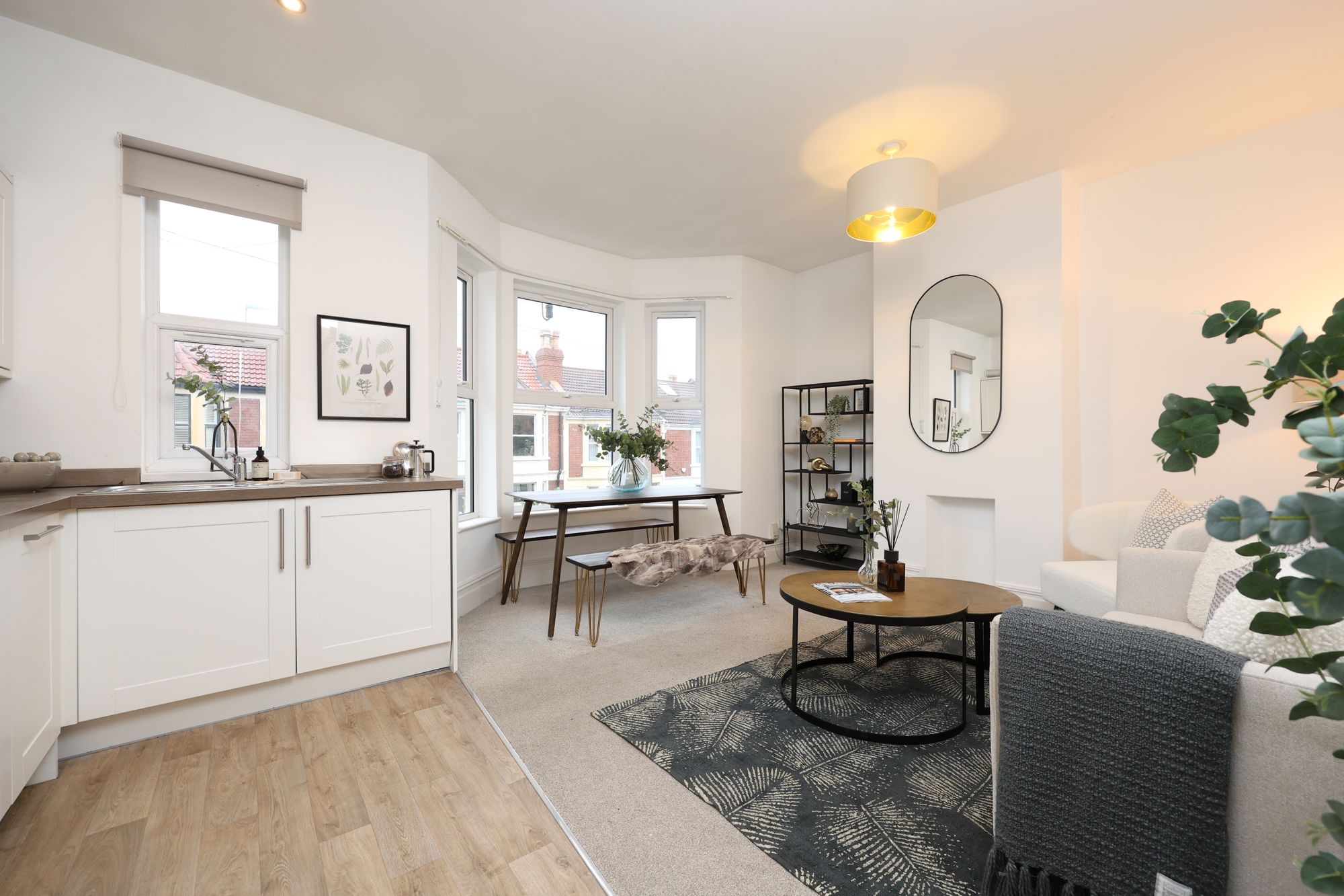 The property boasts a welcoming open-plan living and kitchen area, where modern kitchen units with integrated appliances and sleek cabinetry create a seamless blend of functionality and contemporary style. Large bay windows and additional expansive windows throughout flood the living spaces with natural light, enhancing the airy, open feel and highlighting the elegant, neutral decor. The reception room is a flexible space, ideally suited to relaxing or entertaining, with chic furnishings, decorative shelving, and tasteful artwork (not included in the sale) that showcase both the character and practicality on offer. The flat includes two generously sized bedrooms, each with plush carpeting and ample space for furniture, ensuring both comfort and convenience. Bedroom two on the top floor has access to eaves storage and features a large skylight/balcony, which provides far-reaching views from the rear.