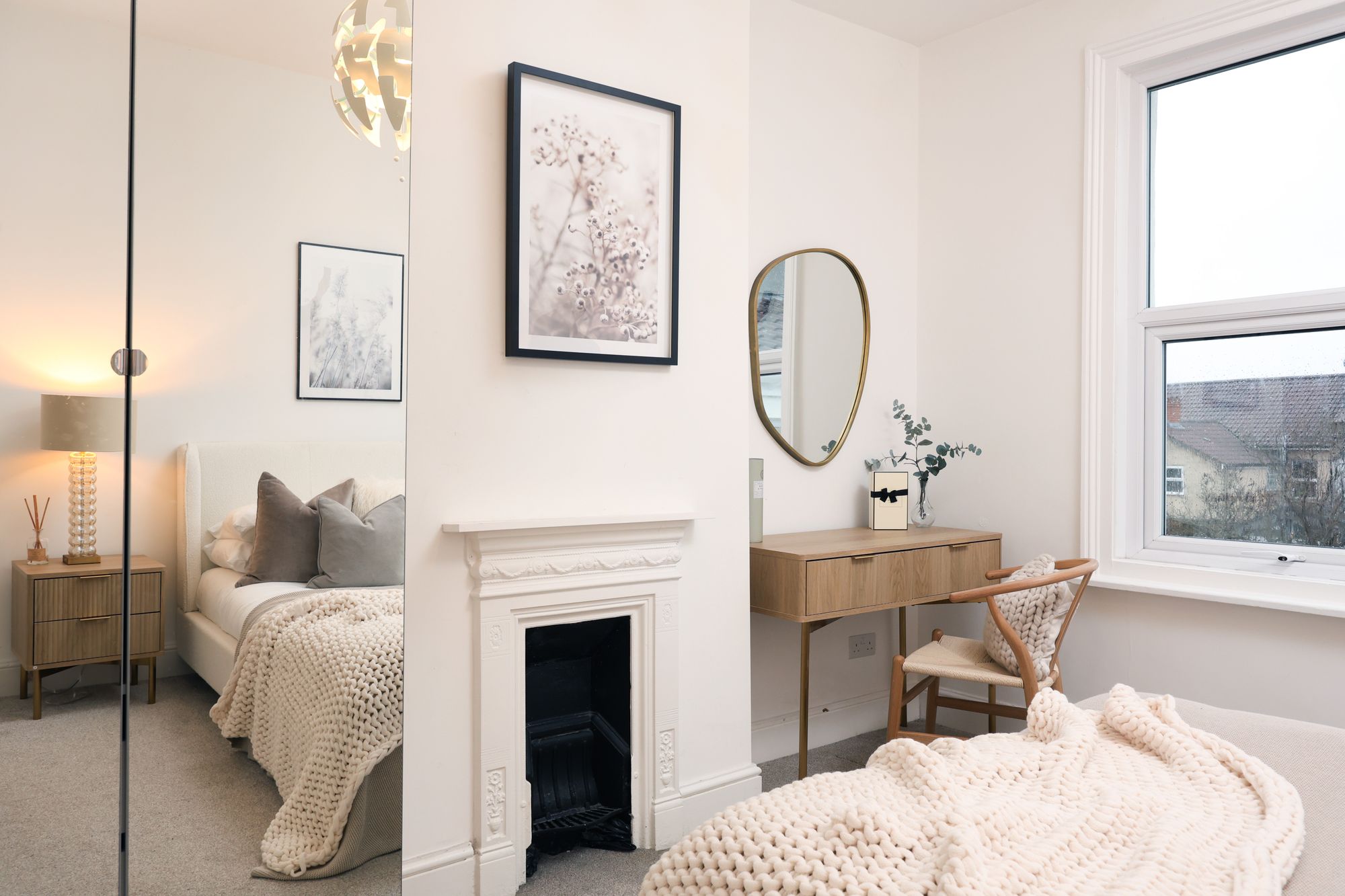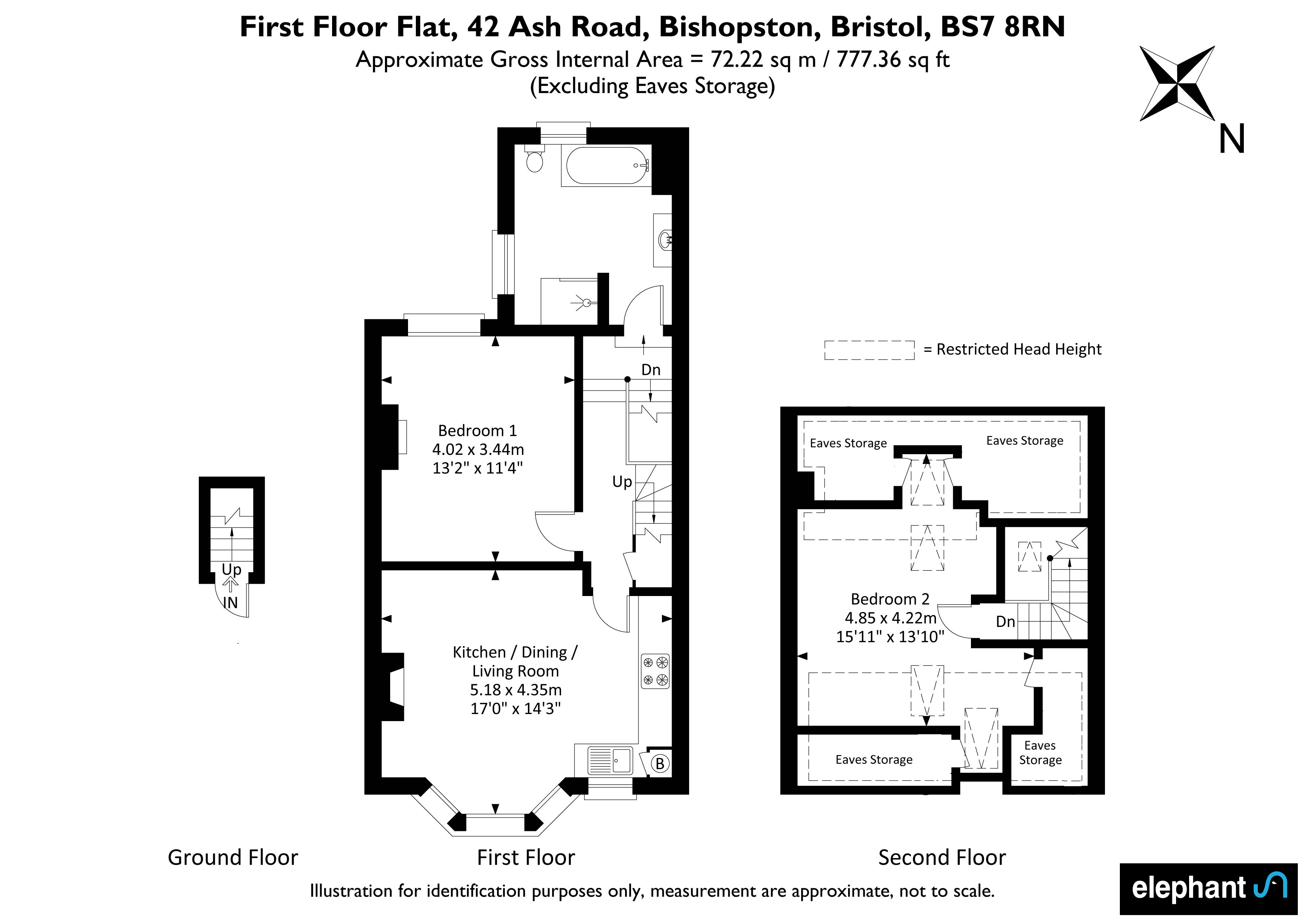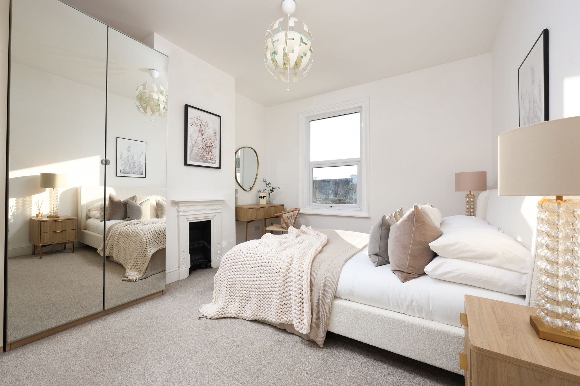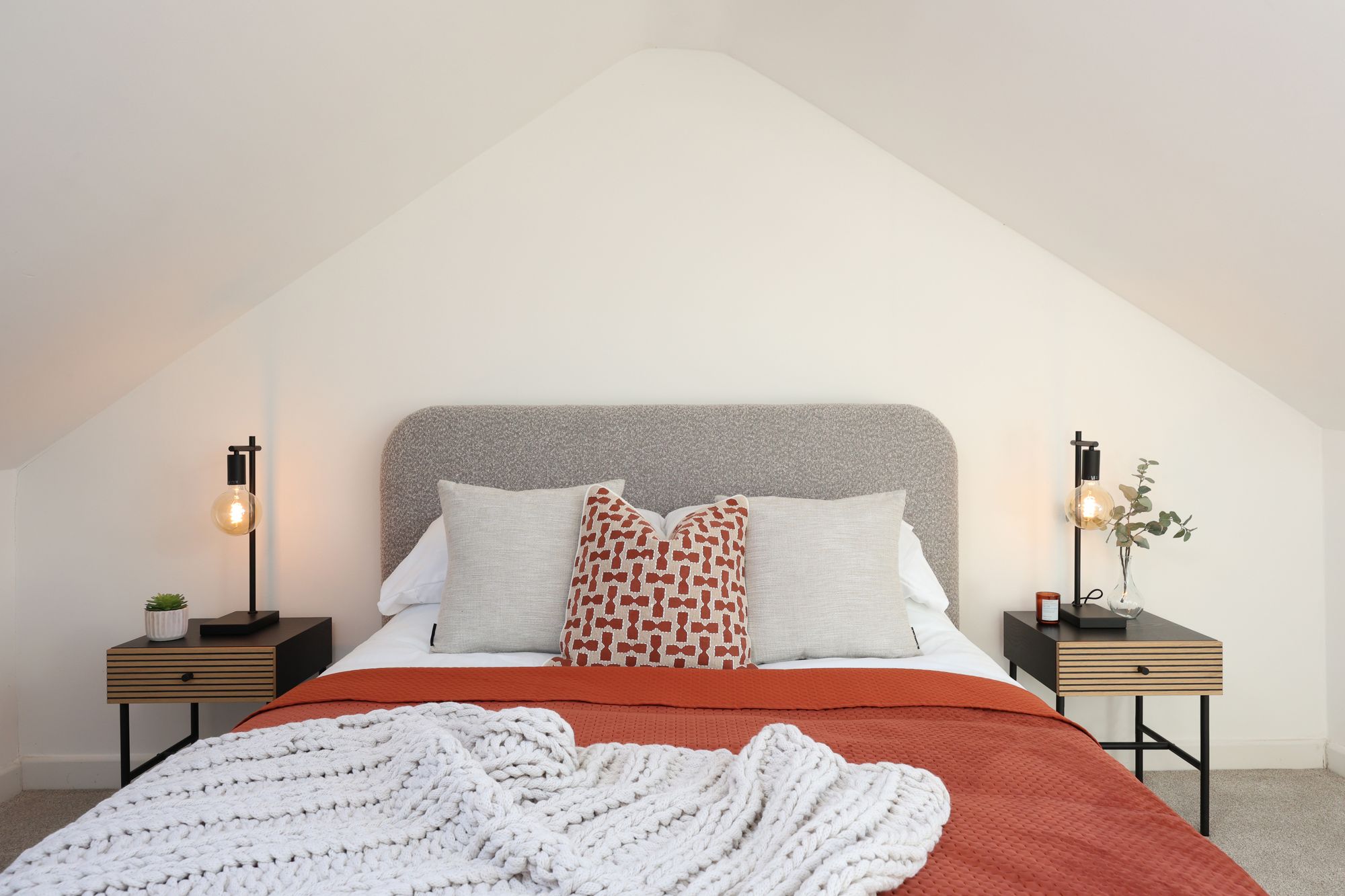 The property boasts a welcoming open-plan living and kitchen area, where modern kitchen units with integrated appliances and sleek cabinetry create a seamless blend of functionality and contemporary style. Large bay windows and additional expansive windows throughout flood the living spaces with natural light, enhancing the airy, open feel and highlighting the elegant, neutral decor. The reception room is a flexible space, ideally suited to relaxing or entertaining, with chic furnishings, decorative shelving, and tasteful artwork (not included in the sale) that showcase both the character and practicality on offer. The flat includes two generously sized bedrooms, each with plush carpeting and ample space for furniture, ensuring both comfort and convenience. Bedroom two on the top floor has access to eaves storage and features a large skylight/balcony, which provides far-reaching views from the rear.