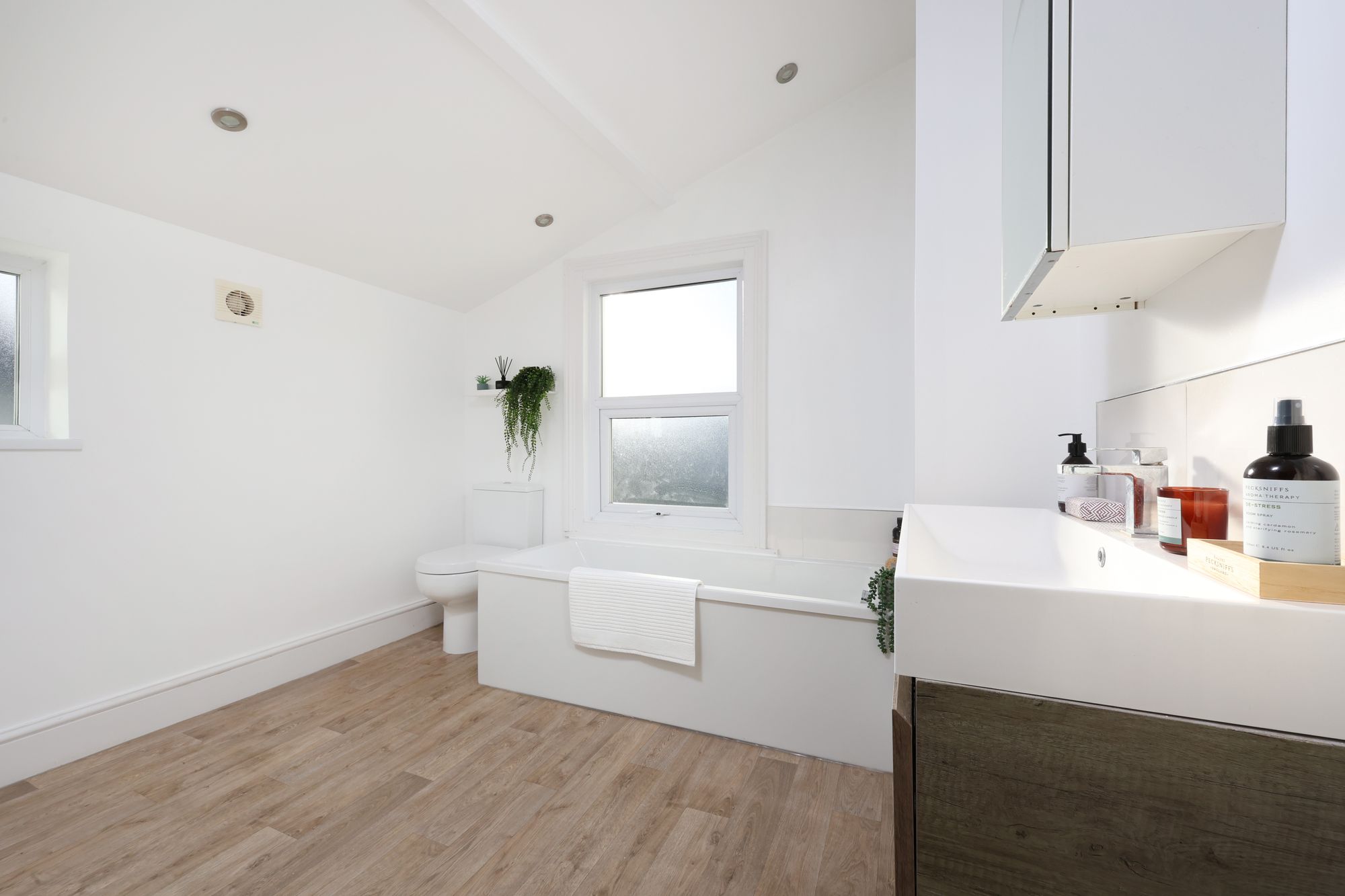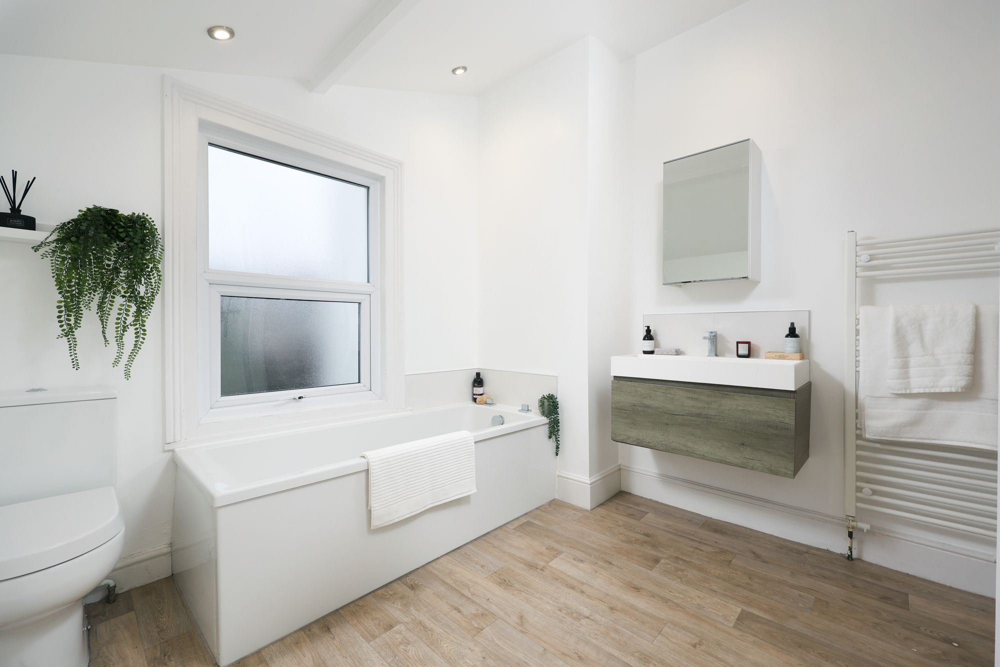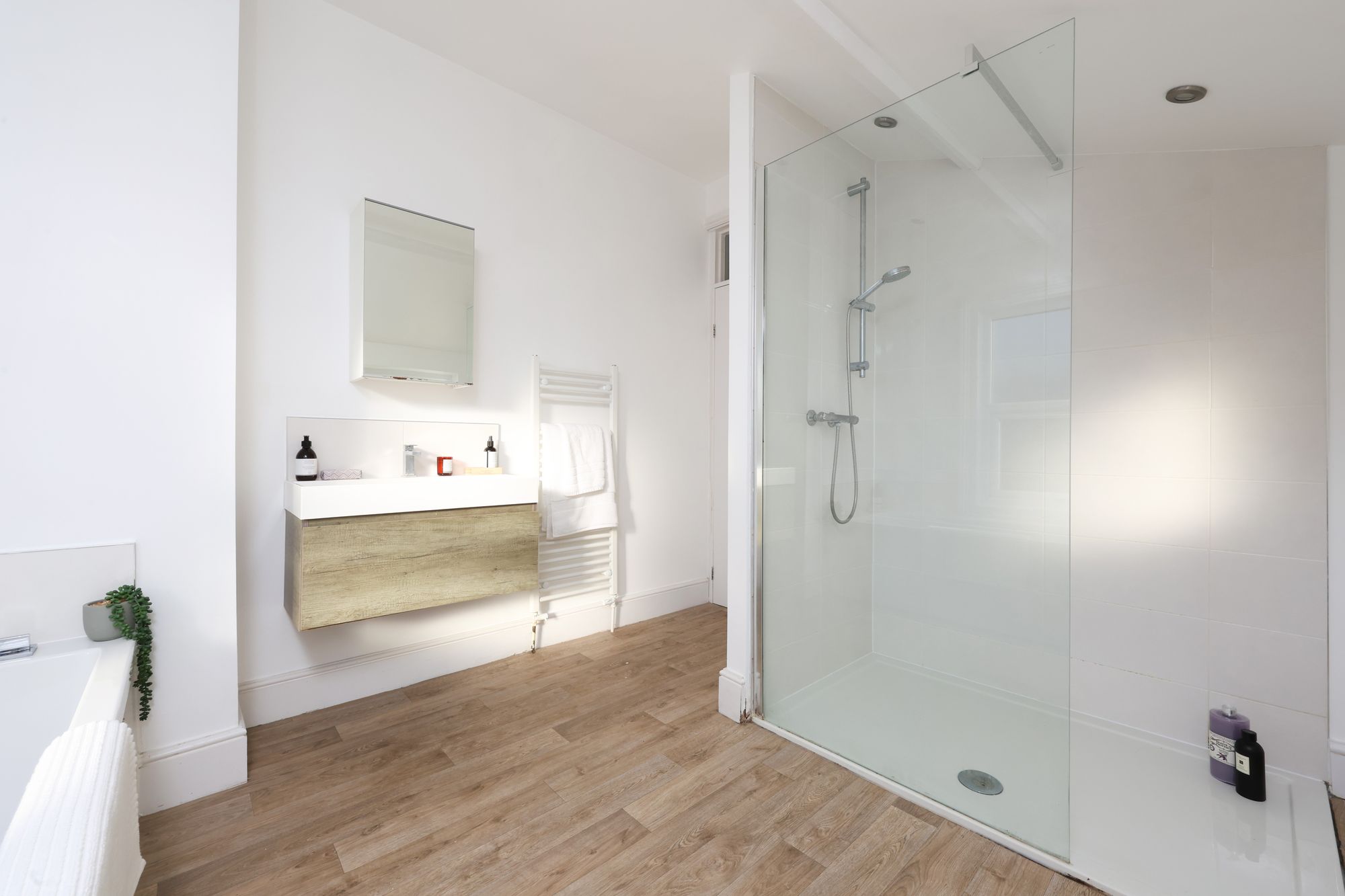 The modern bathroom features a large bathtub, a spacious walk-in shower, and a wall-mounted vanity unit with a wash-hand basin and storage. Contemporary fixtures, heated towel rails, and wood-effect or wooden flooring provide both comfort and sophistication, while frosted windows allow natural light without compromising privacy.
