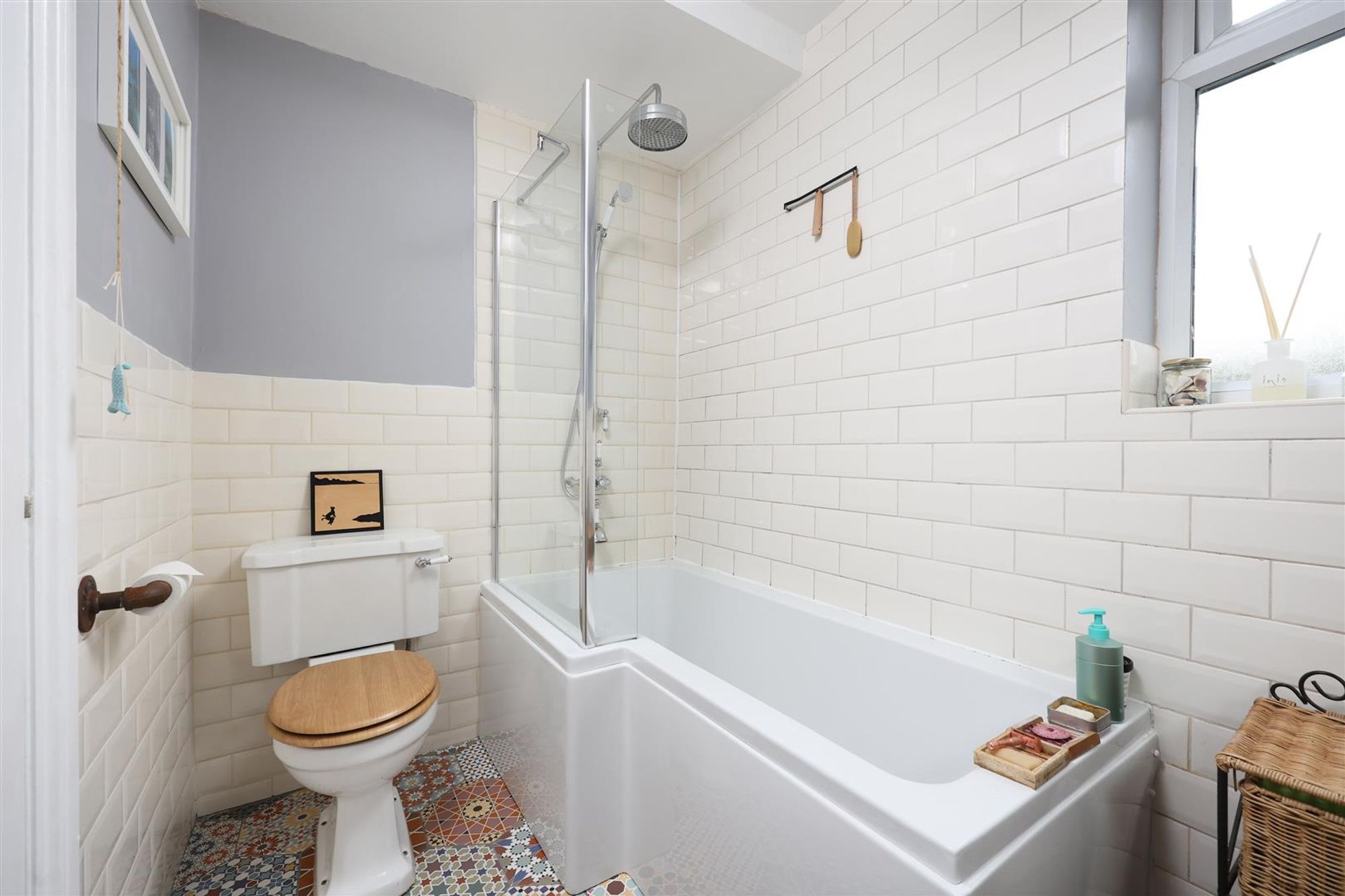 A hallway leads off the kitchen towards the rear of the flat that allows access to the family bathroom, which comprises tiled flooring, a bath with glazed panel screen and shower overhead, metro tiles to the walls, a w/c and wash basin.