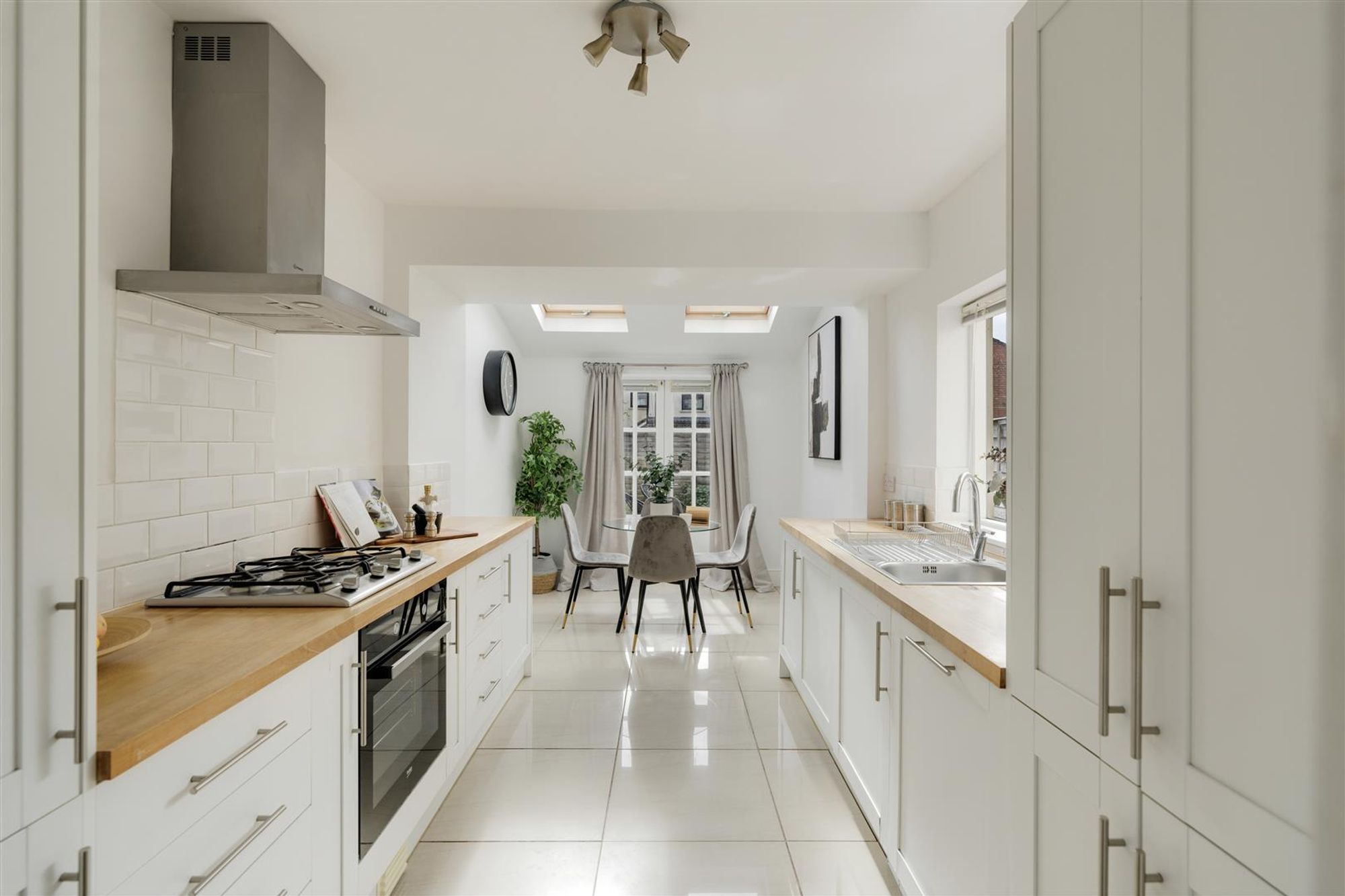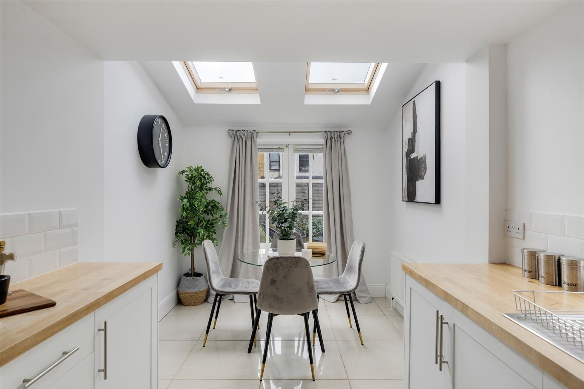 Further along the hallway sits the kitchen/breakfast room. This bright and airy space is fitted with cream shaker-style cabinetry and wooden worktops, offering plenty of storage and includes a range of appliances. White tiling underfoot adds a fresh finish, while skylights and French doors at the rear ensure the room is bathed in natural light. A dining table fits neatly at the far end, making this a perfect space for relaxed family meals. A useful w/c is also tucked beneath the stairs.