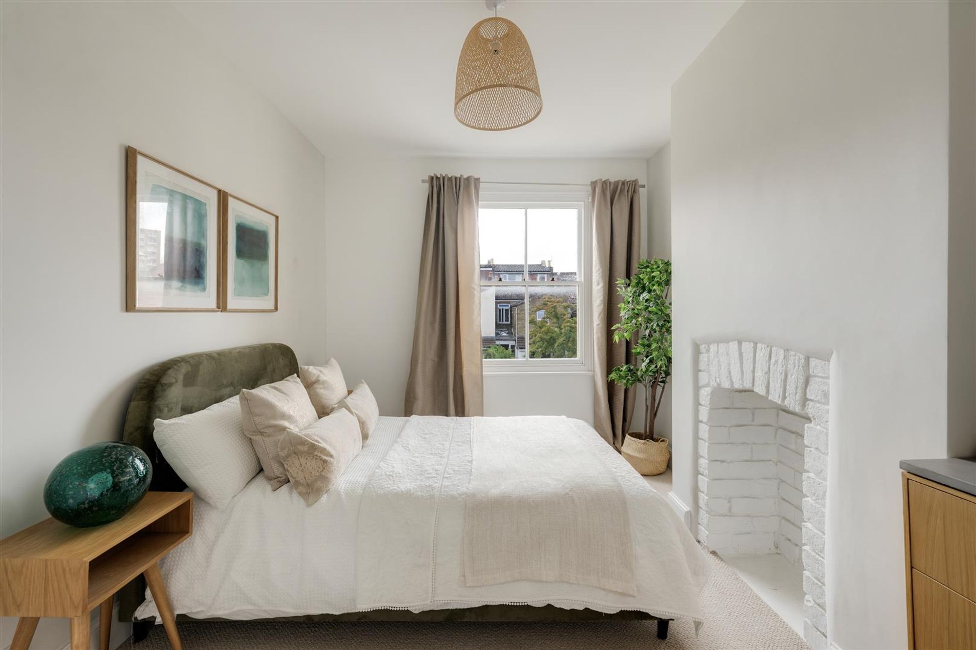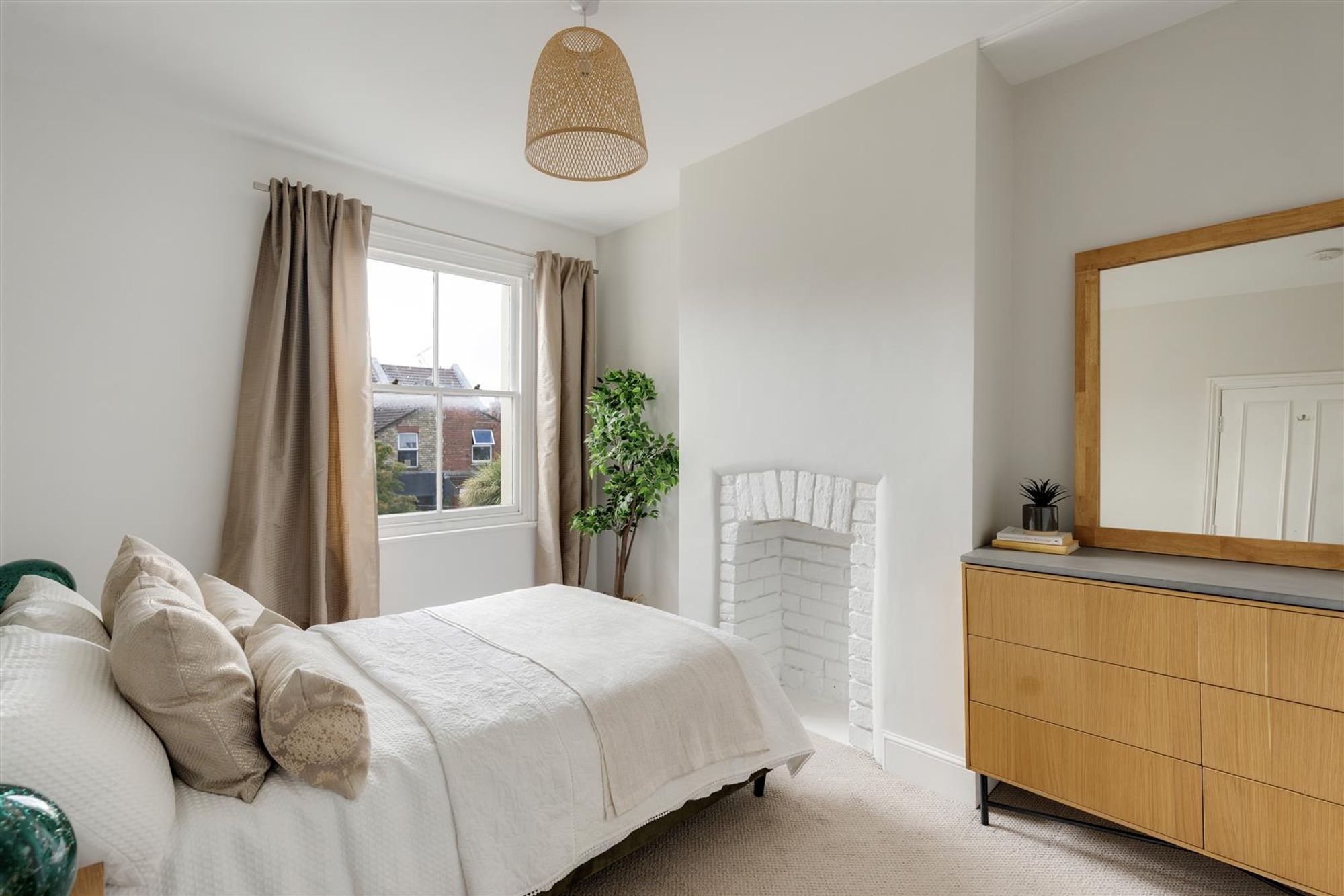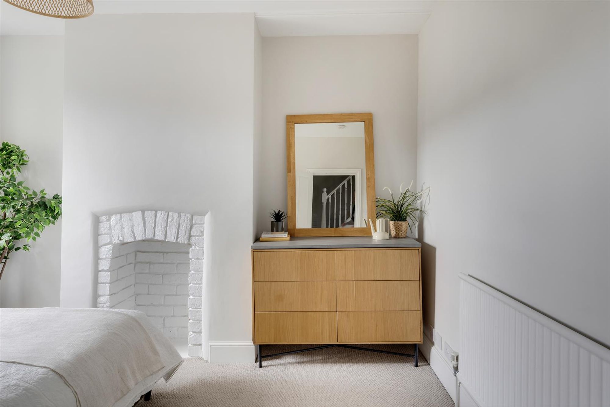 The first floor is home to two bedrooms and a family bathroom. Both bedrooms are easily large enough to accommodate a double bed and storage furniture, with the primary bedroom at the front of the home being especially spacious. Both bedrooms feature sash windows and enjoy the character of a brick fireplace. The bathroom is thoughtfully designed, with a freestanding bath, corner shower, sink and toilet, and a sash window overlooking the garden.