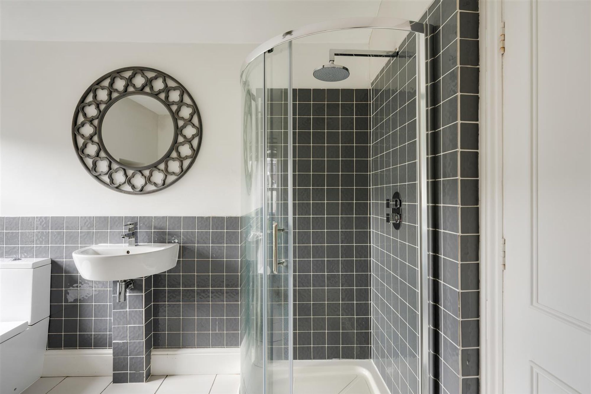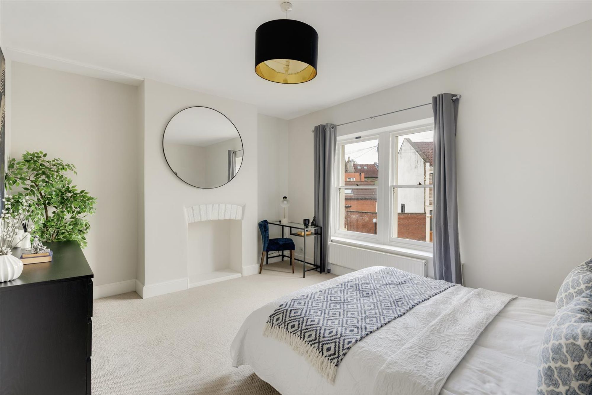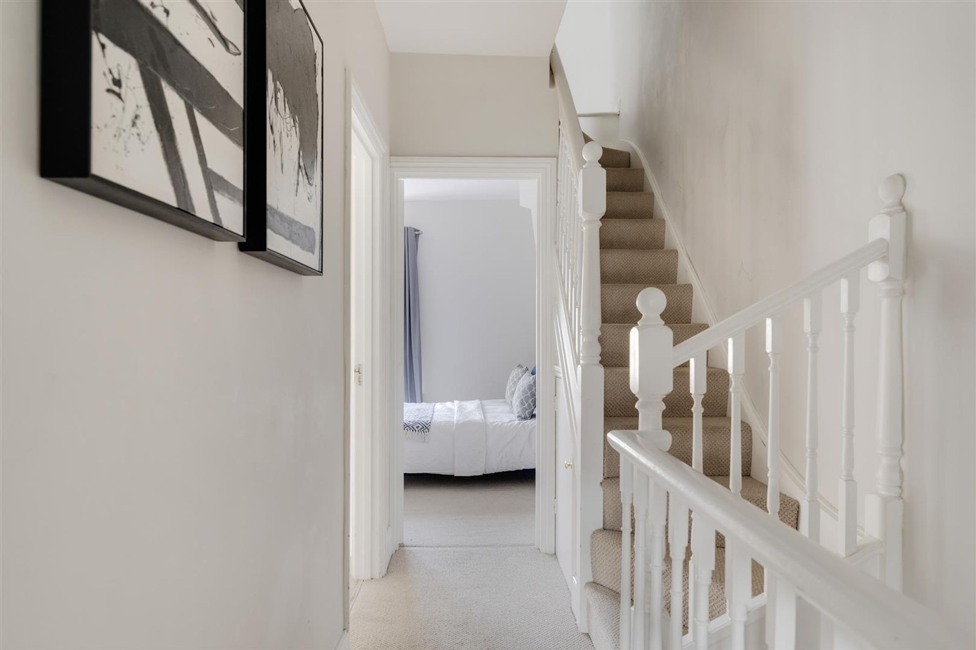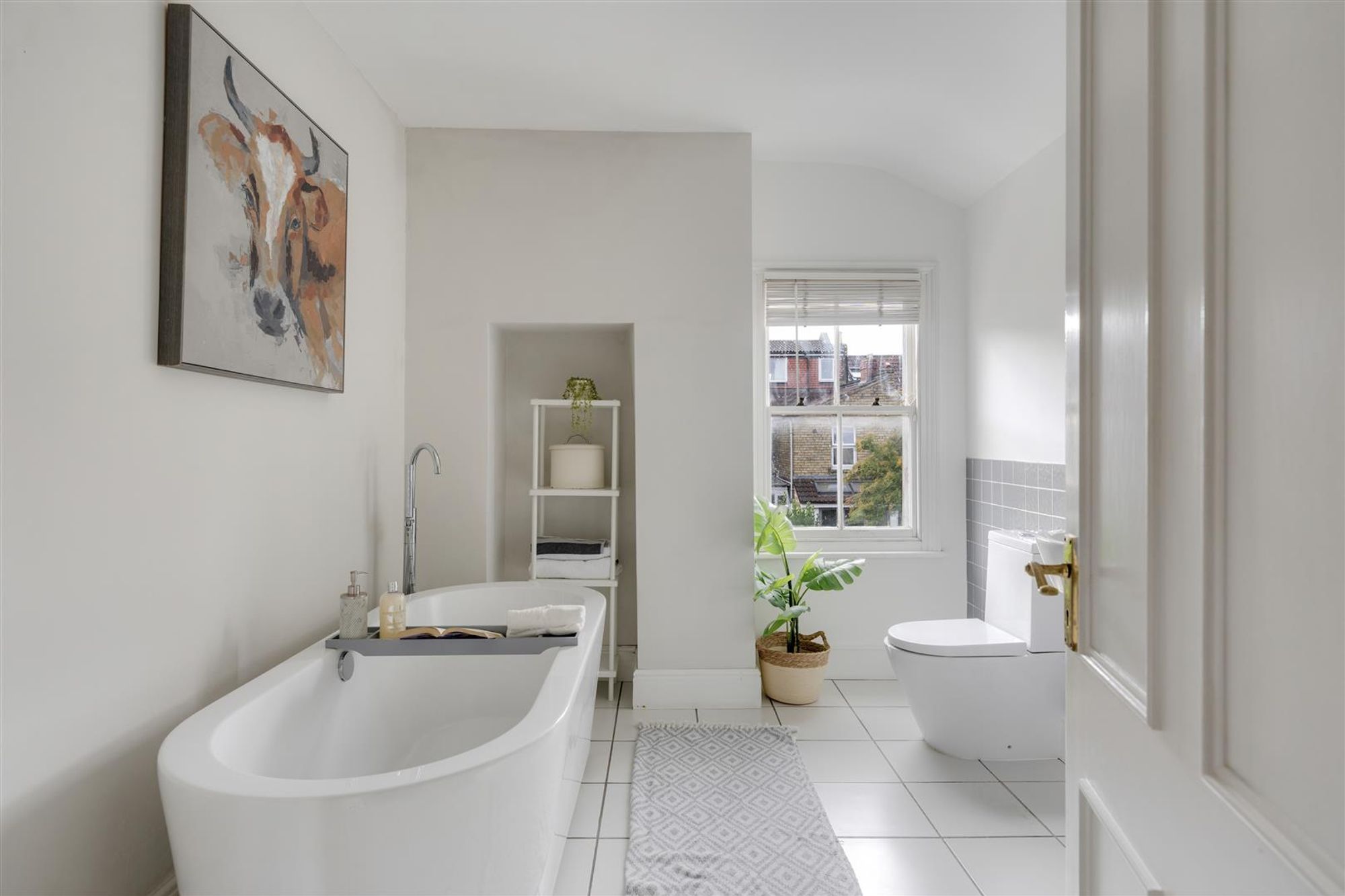 The first floor is home to two bedrooms and a family bathroom. Both bedrooms are easily large enough to accommodate a double bed and storage furniture, with the primary bedroom at the front of the home being especially spacious. Both bedrooms feature sash windows and enjoy the character of a brick fireplace. The bathroom is thoughtfully designed, with a freestanding bath, corner shower, sink and toilet, and a sash window overlooking the garden.
