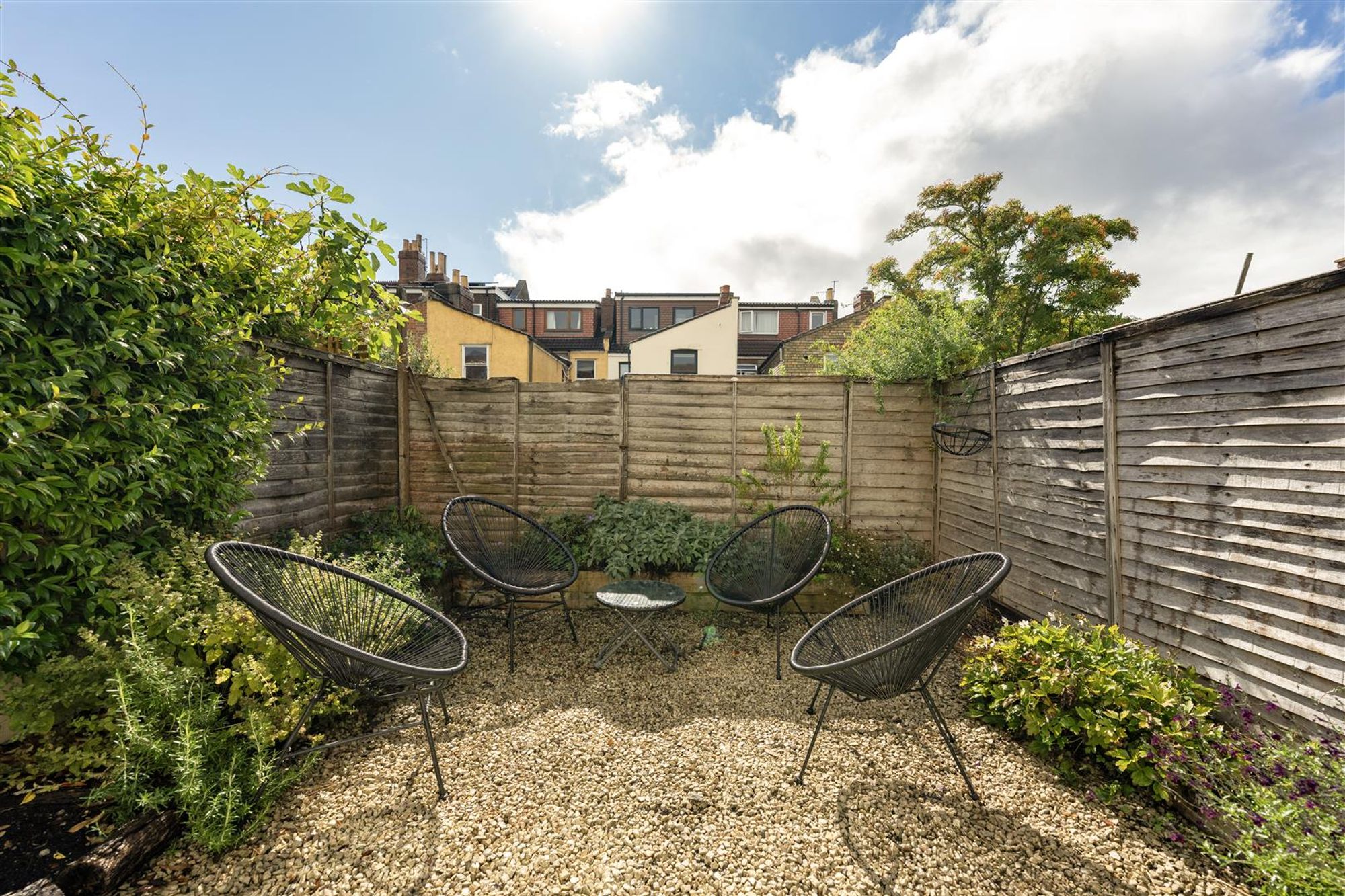 Externally, the rear garden begins with a paved courtyard bordered by a flowerbed, leading to a gravelled area that provides plenty of room for outdoor furniture. Surrounded by mature planting, it is a private and flexible space for entertaining or unwinding outdoors.