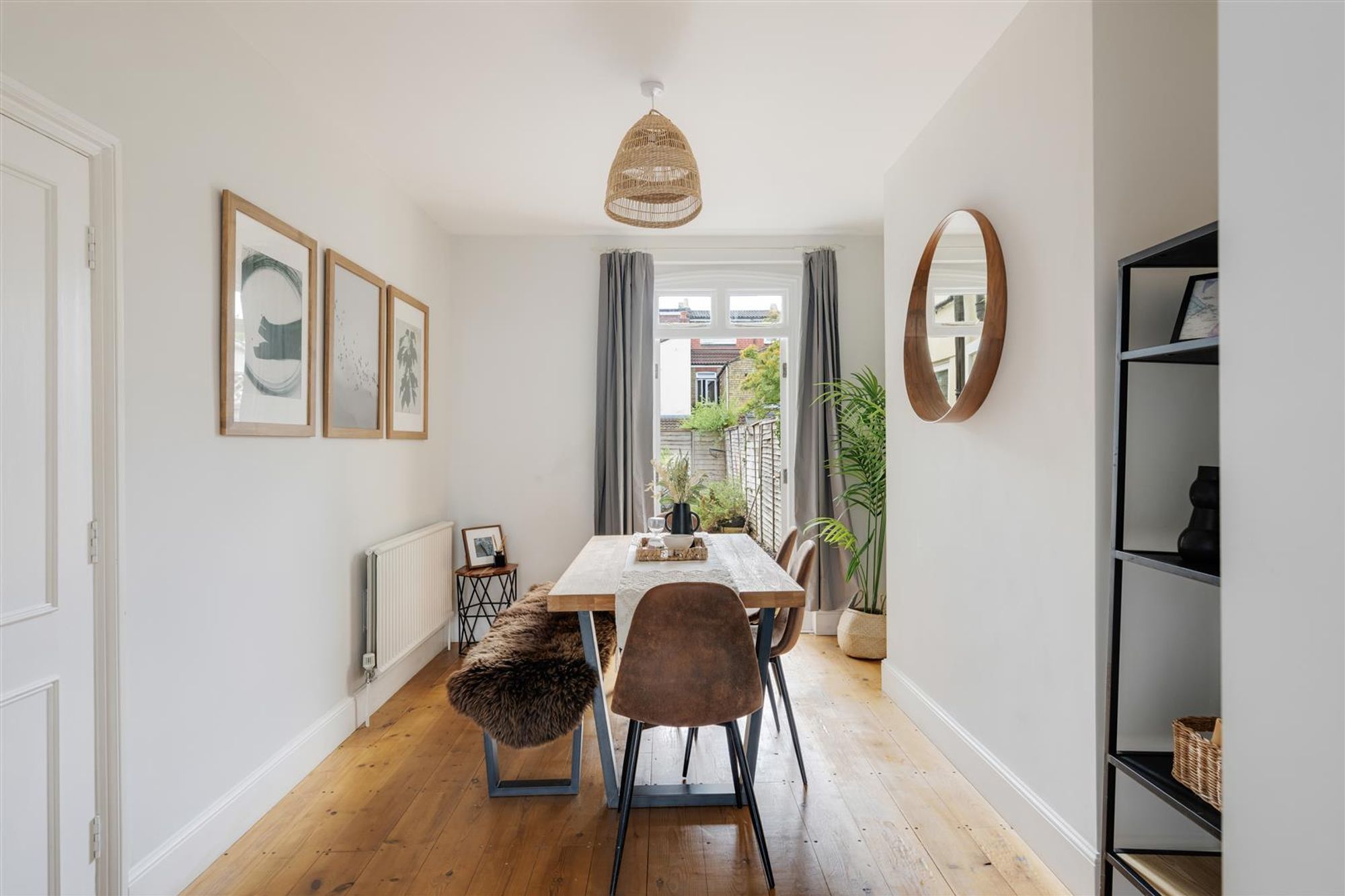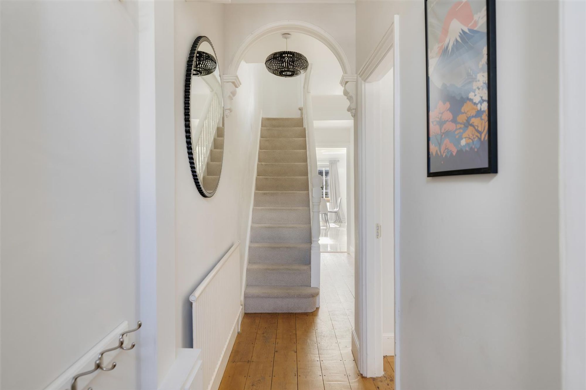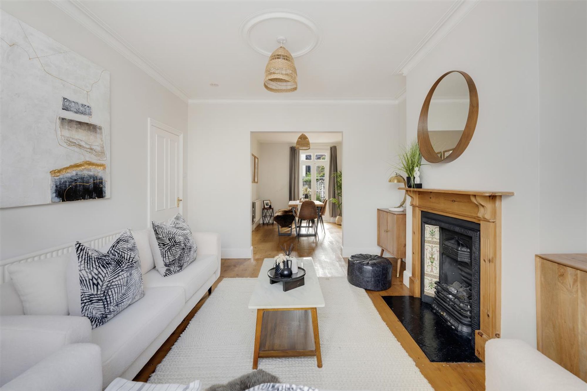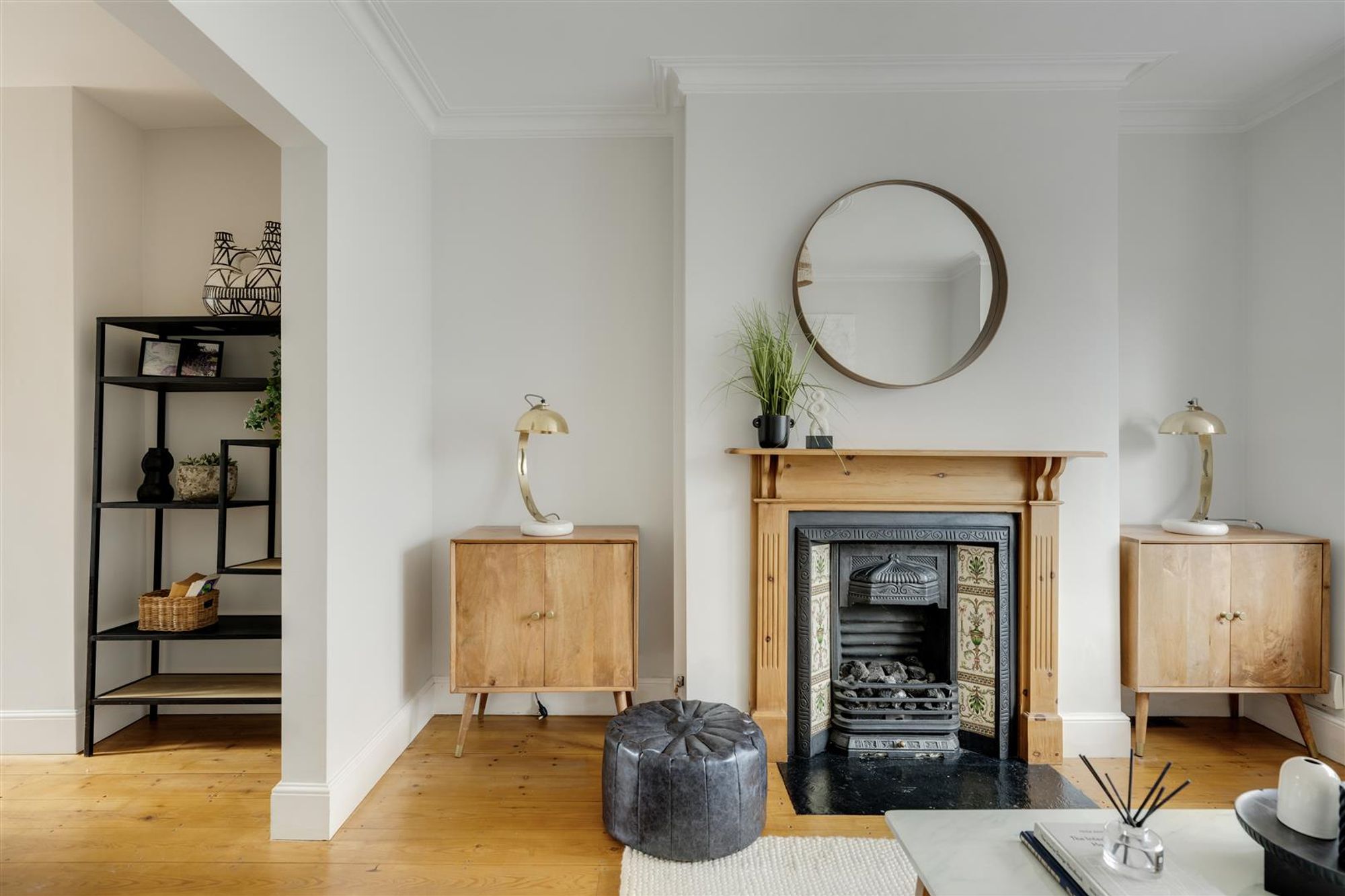 Stepping into the hallway, the plaster arch overhead sets the tone for the period features that run throughout the home. Stripped wooden floorboards extend into the open-plan living and dining room, which stretches the length of the house. At the front, the living area centres around an ornate fireplace, with a sash bay window flooding the space with light and ornate cornicing adding detail. The room flows seamlessly into the dining area, where French doors open directly onto the garden.