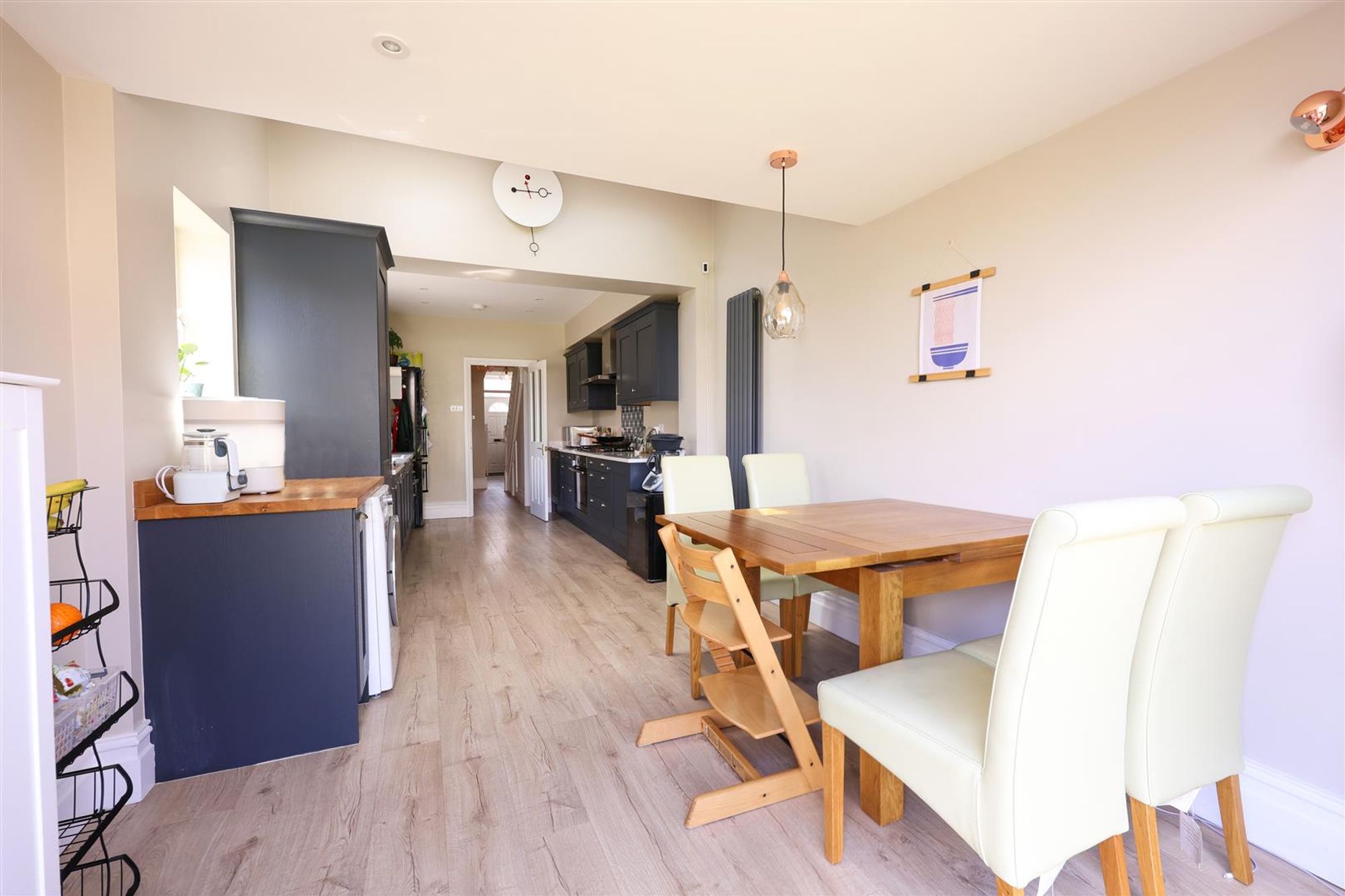 The accommodation comprises: main entrance leading into a hallway which provides access to all ground floor rooms and incorporates a w/c underneath the staircase. The ground floor accommodation consists of two open plan reception rooms allowing for plenty of natural light. The front room features a double glazed bay window, ceiling cornice and a cast-iron fireplace with period surround. The rear of the two receptions is used as a sitting room with timber French doors leading onto a lean-to storage area. Along the hallway to the rear of the property is a recently refurbished open plan kitchen/diner featuring bi-folding doors that provide a seamless connection to the rear garden. The kitchen has been fitted with a range striking midnight blue wall and base units with contrasting quartz work surfaces, brushed chrome fittings and an array of integrated appliances. Recessed spot-lights and an oak coloured laminate floor complete the overall look. Beyond, the dining area has plenty of space for a large table and is bathed in natural light thanks to two large Velux windows.