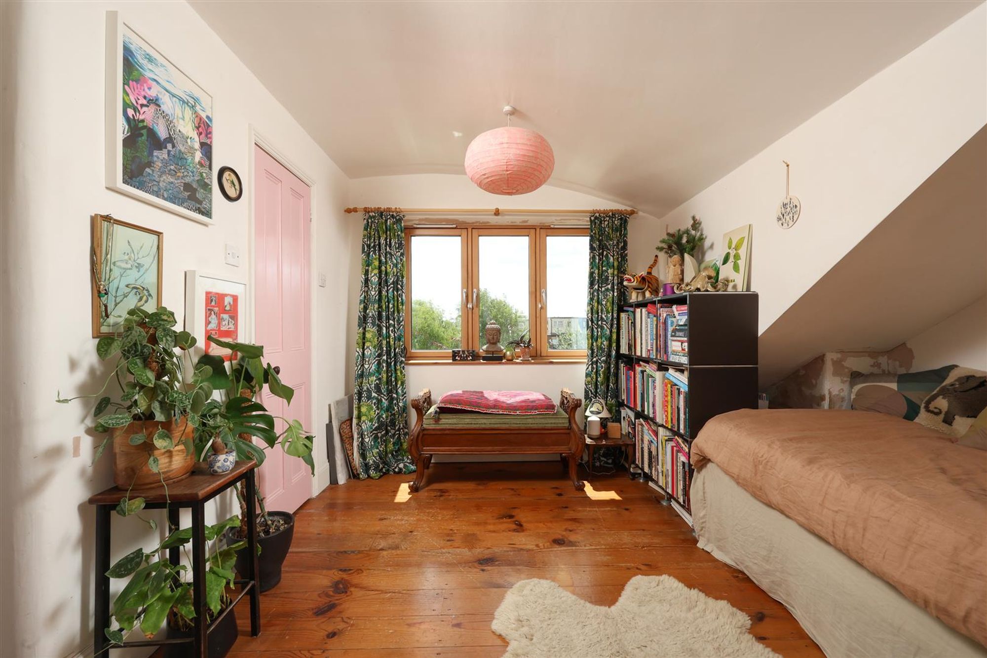 Further stairs lead to the master bedroom, which features an en-suite. The bedroom has dormer windows overlooking the rear garden, and two skylight windows to the front, under eaves storage with reclaimed doors, and wooden floorboards. The ensuite comprises a shower cubicle, a toilet and a wash basin.