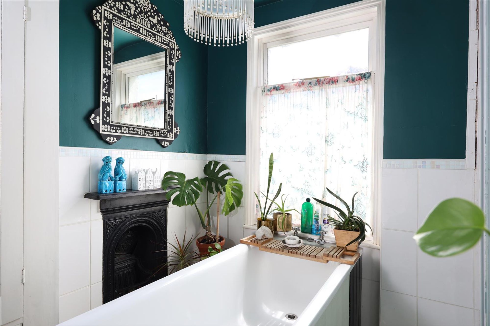On the ground floor, you’ll find a classically proportioned Victorian living room with bay windows, coving, stripped floorboards, alcove shelving and a period fireplace. The second reception room is currently used as an office and features coving and original cabinetry, with an opening onto the covered courtyard.