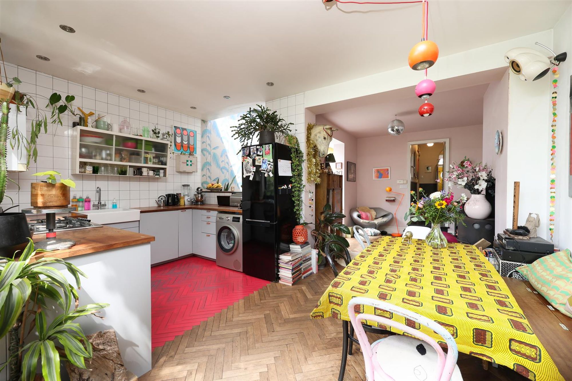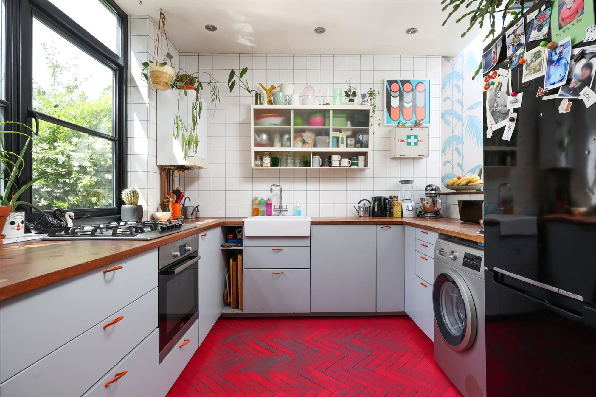 An impressive, modern kitchen/living space, with 2.73m high ceilings, is located at the rear. The kitchen/living area has large, floor-to-ceiling double-opening doors to the garden, big windows, and a reclaimed herringbone oak floor, bringing contemporary style to this well-considered space. The kitchen has a range of base units with a reclaimed chemistry lab hardwood worktop, over an integrated Belfast sink, dishwasher, gas hob and an electric oven. This light and bright space flows into the cosy courtyard, which features custom-made encaustic floor tiles and a large glass roof.