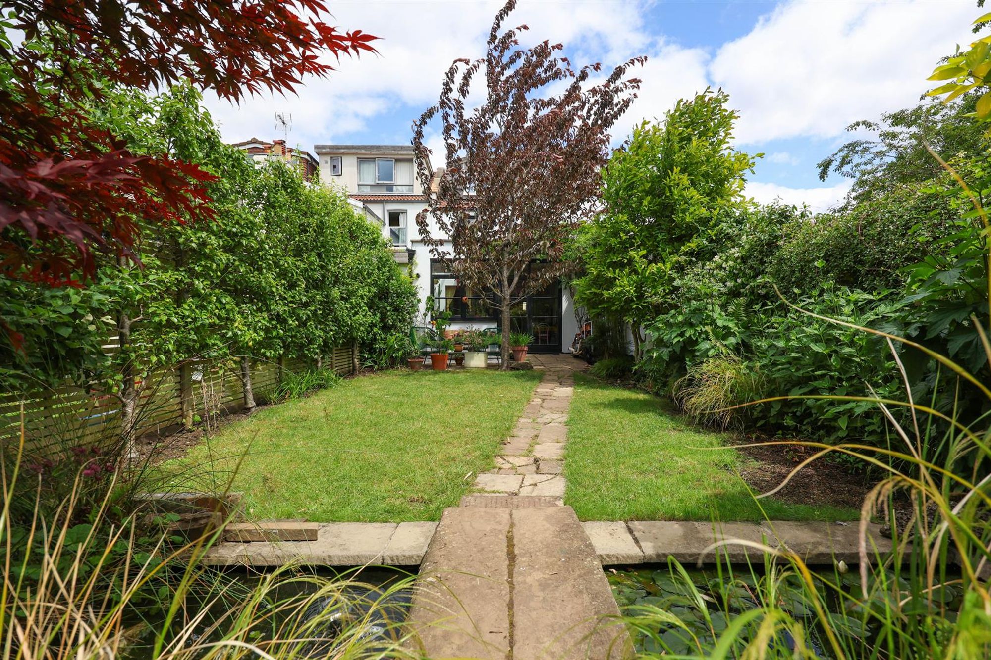 Externally, at the rear is a large south-facing garden. A paved patio, shaded by a mature Prunus Royal Burgundy, leads onto a lawn, flanked by a long-flowering summer border on one side, and trained pear and apple trees on the other. The garden has a mature Magnolia, red Acer, a Dogwood, ferns and evergreen climbers such as Star Jasmine and Clematis. At the bottom of the garden is a pond with a white water lily, goldfish and Orfe, and a small bridge which leads to the workshop and sheds. The workshop has an insulated roof, electricity, large windows, double doors, and extra storage sheds on either side. The 10 m² workshop could be repurposed as a studio or exercise room.