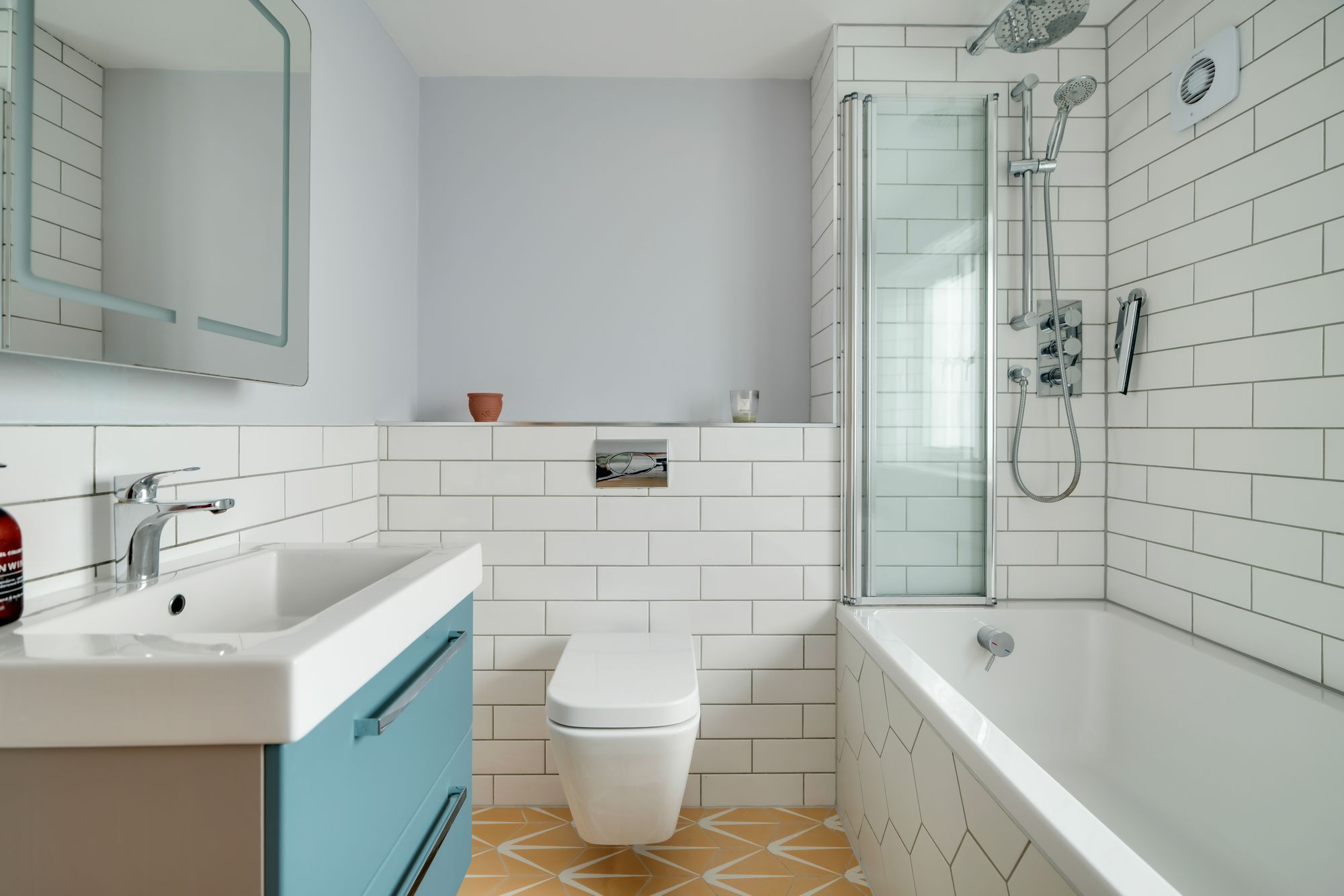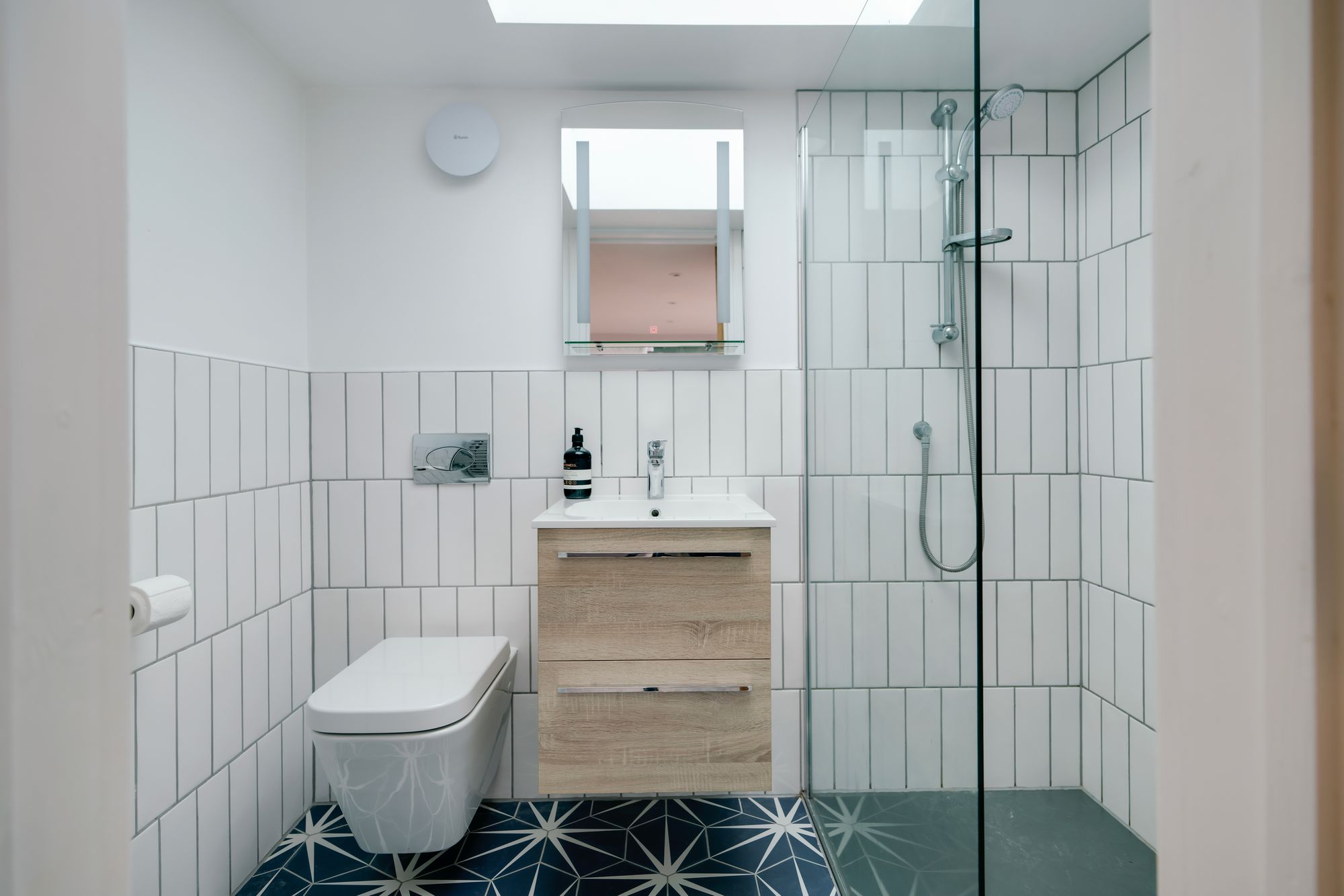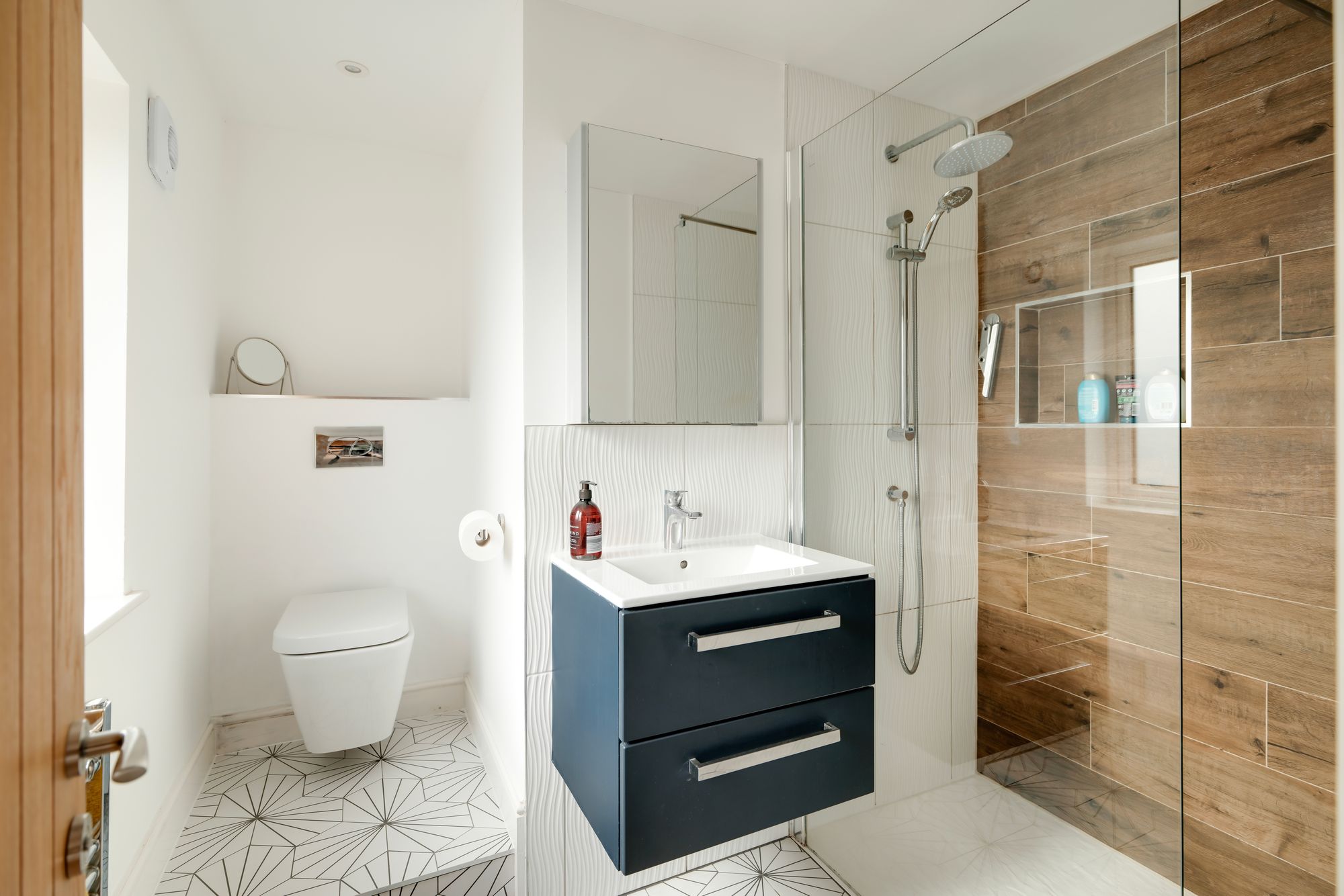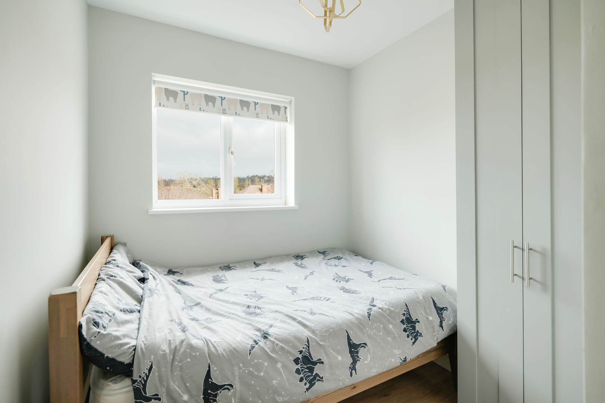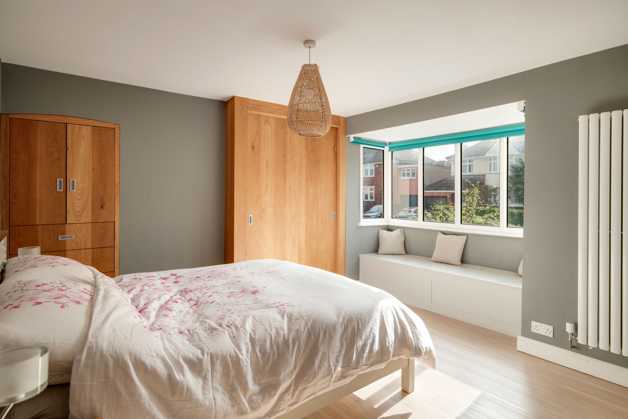 Upstairs, the first floor offers four bedrooms. The principal bedroom sits at the front of the home and features a bay window with window seat, automated blinds, built-in storage and en suite bathroom with a walk-in shower and patterned tiling. A second bedroom also benefits from built-in storage, while two further bedrooms provide flexible space for family living or working from home. The family bathroom completes this floor, with a modern finish and shower over bath arrangement.