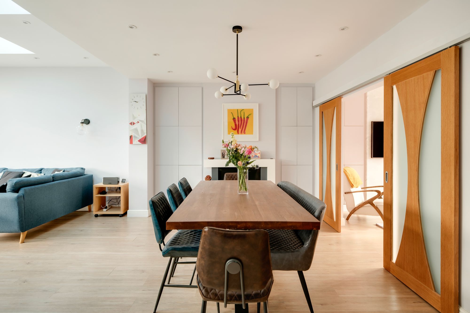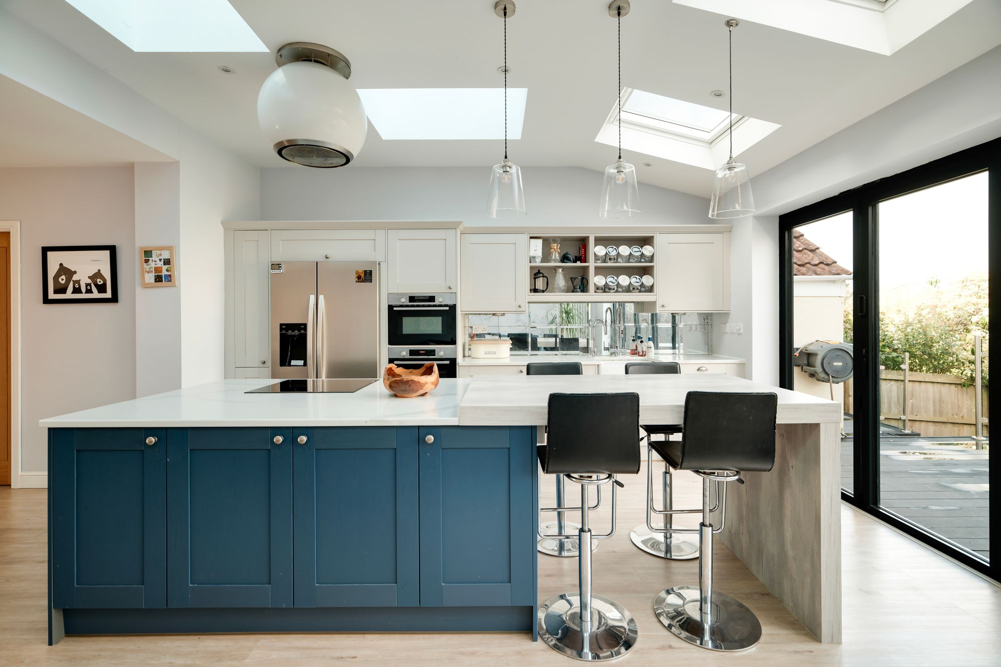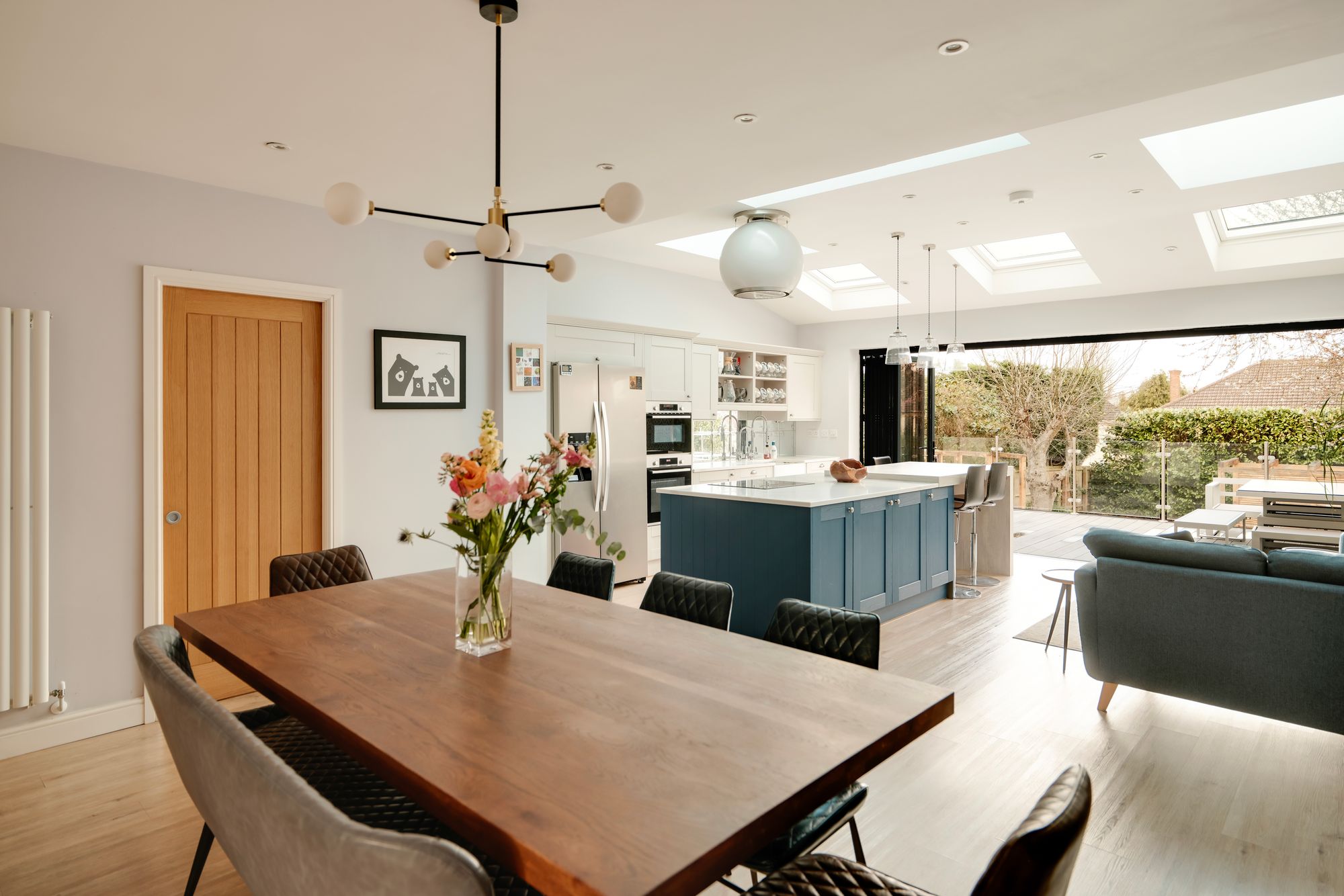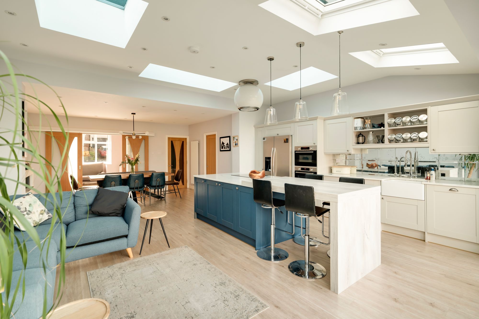Sliding doors open through to the rear of the house, where a generous open plan kitchen and dining space has been created. The dining area features an electric fireplace with built-in storage within the alcoves, while the kitchen is filled with natural light from skylights above. Cream shaker style cabinetry is paired with marble worktops, offering ample storage and housing integrated appliances. A central island adds further preparation space and breakfast bar seating. Bi-fold doors open directly onto the garden, creating a seamless connection between inside and out.