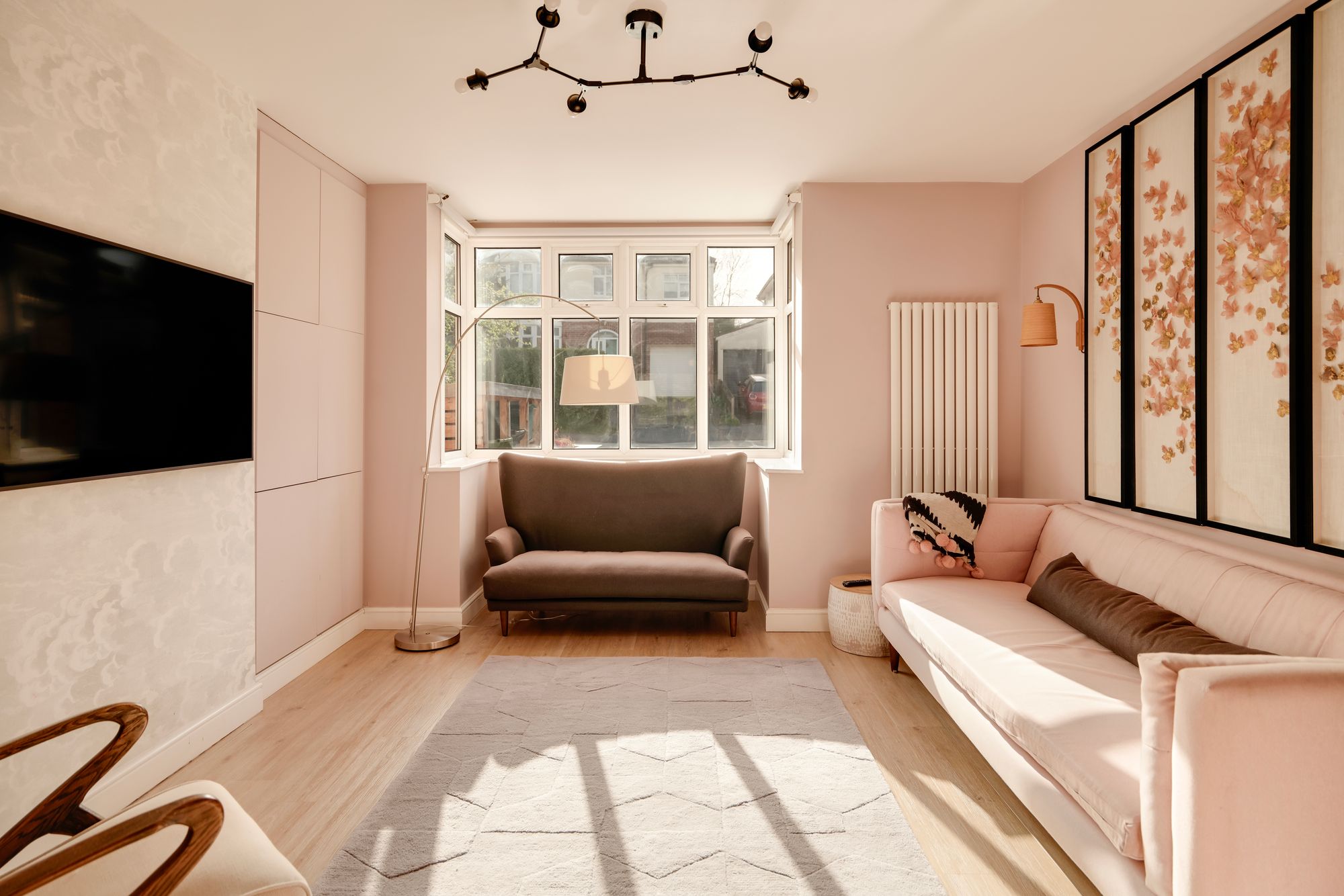 Stepping inside the home, a practical porch provides space for coats and shoes before leading into the central hallway. At the front of the home, the living room is a bright and comfortable space, a large bay window fitted with automated blinds linked to the smart system. An integrated television sits centrally, with built-in storage to either side, while Sonos speakers are installed throughout the home.