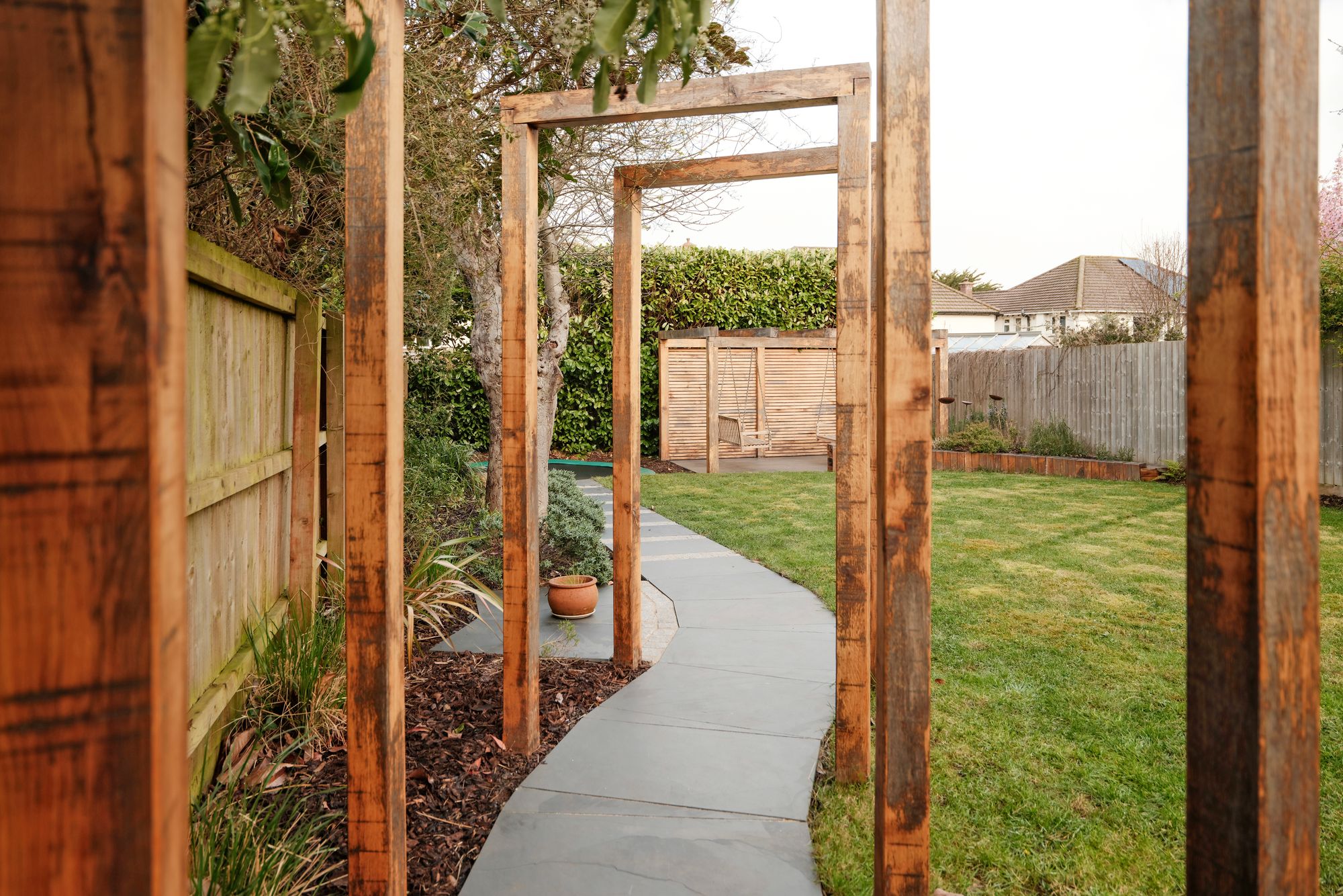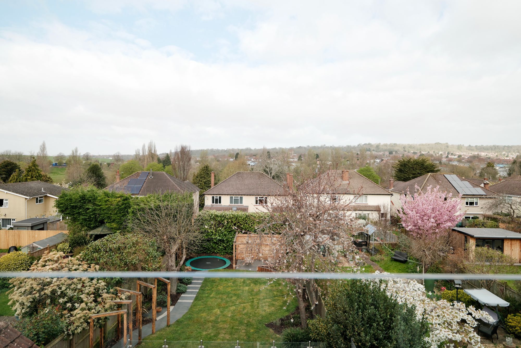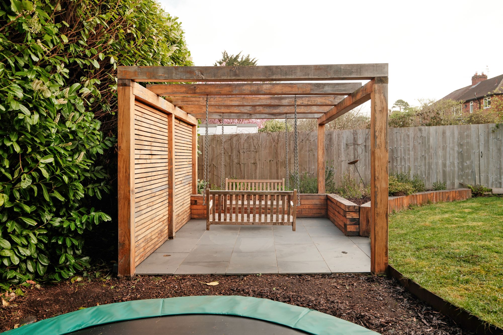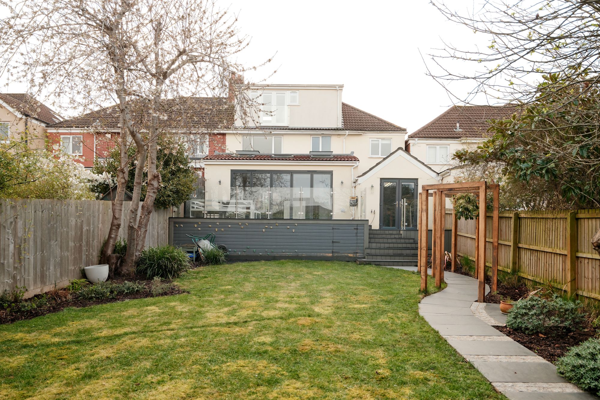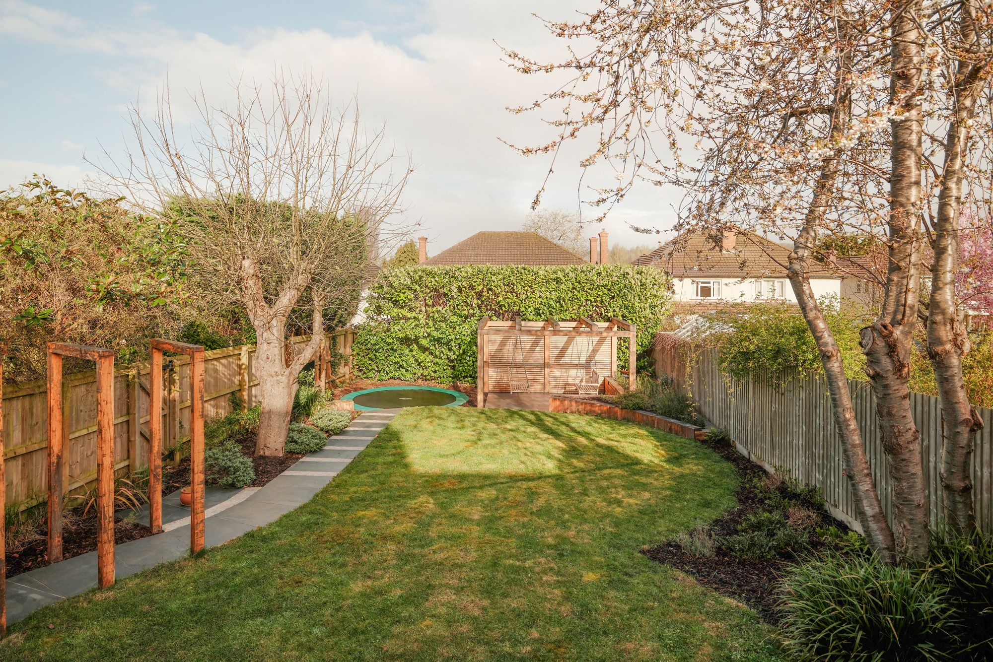 The rear garden has been recently landscaped and is arranged for both relaxation and entertaining. A large decked area sits closest to the house, ideal for outdoor dining. On the side of the raised decking is a bouldering wall with rubberised bonded bark safety flooring below. Beyond, a generous lawn is bordered by flower beds. A paved pathway continues to a pergola with hanging seating, while an in-ground trampoline adds an additional family friendly touch.