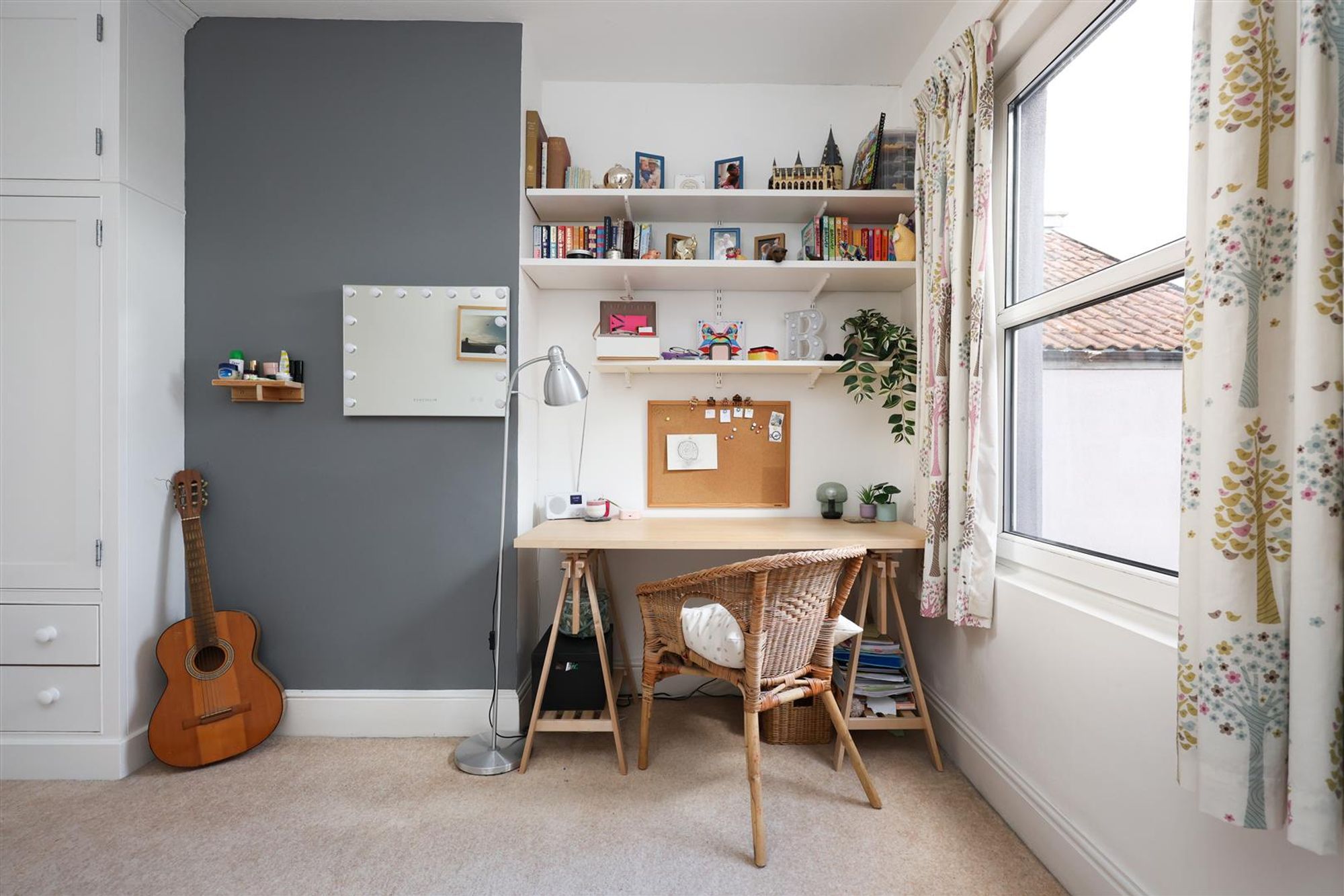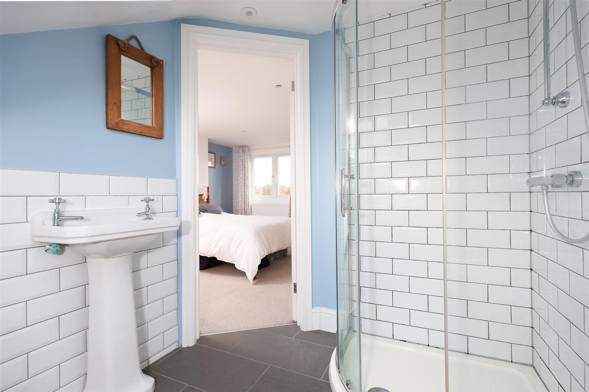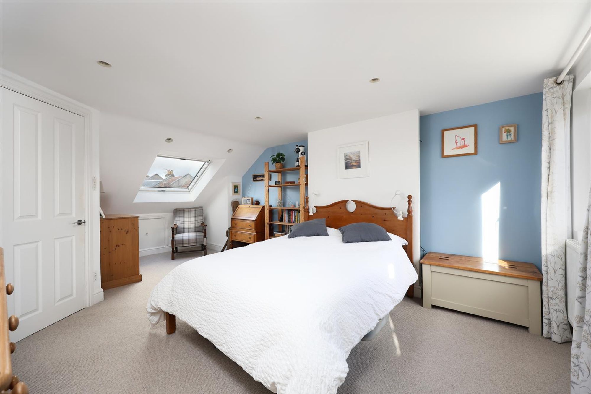 A staircase leads to the master bedroom which spans the full depth and width of the property with a charming Juliet balcony offering fantastic views. The bedroom benefits from a skylight window to the front, eaves storage and a three-piece modern en-suite shower room.