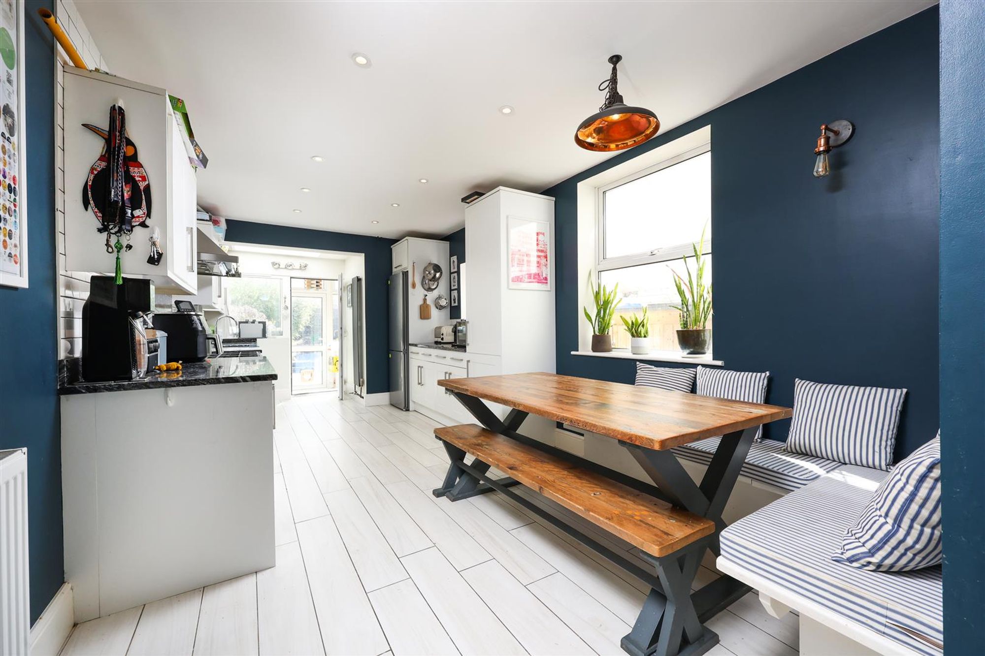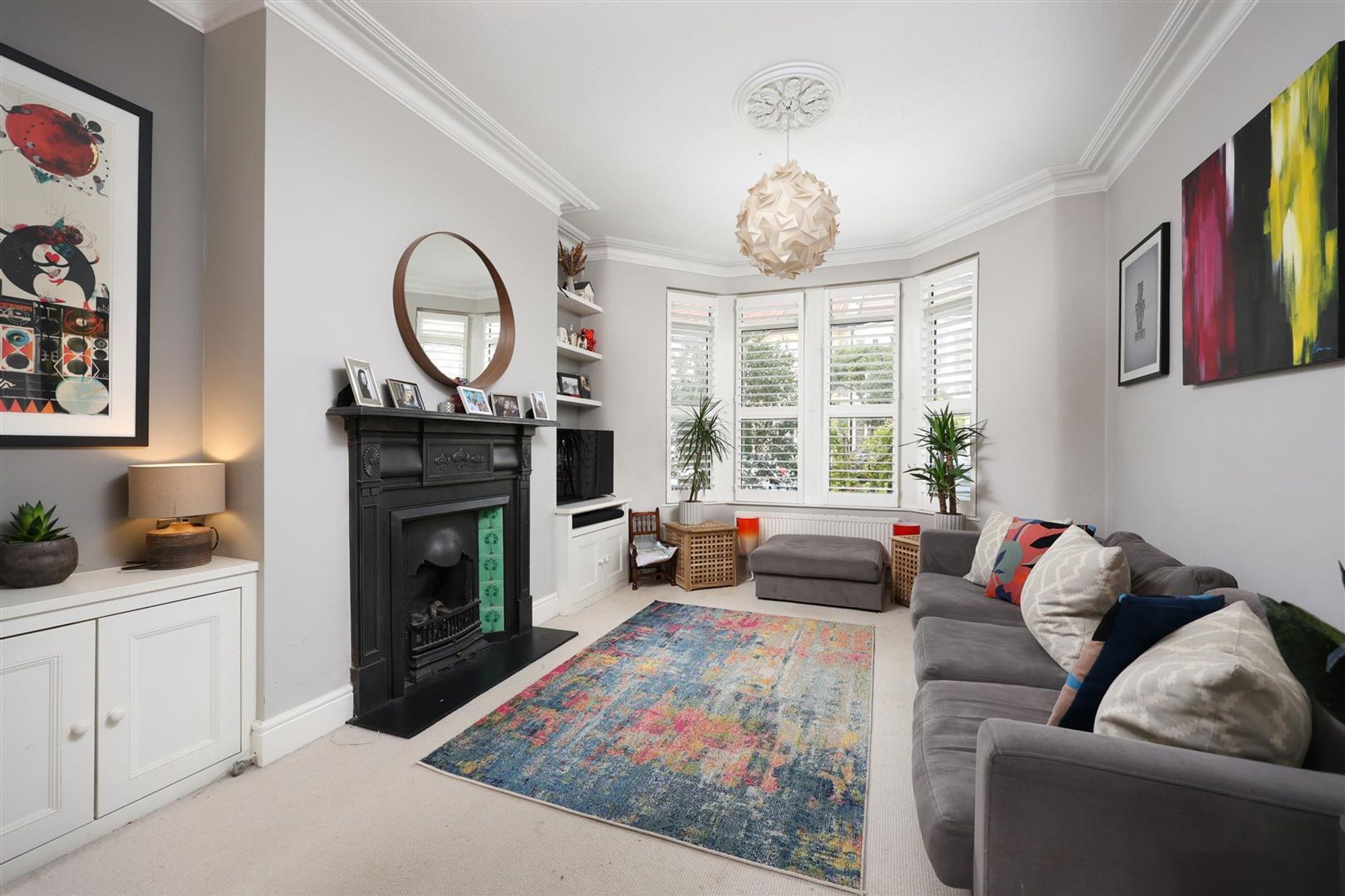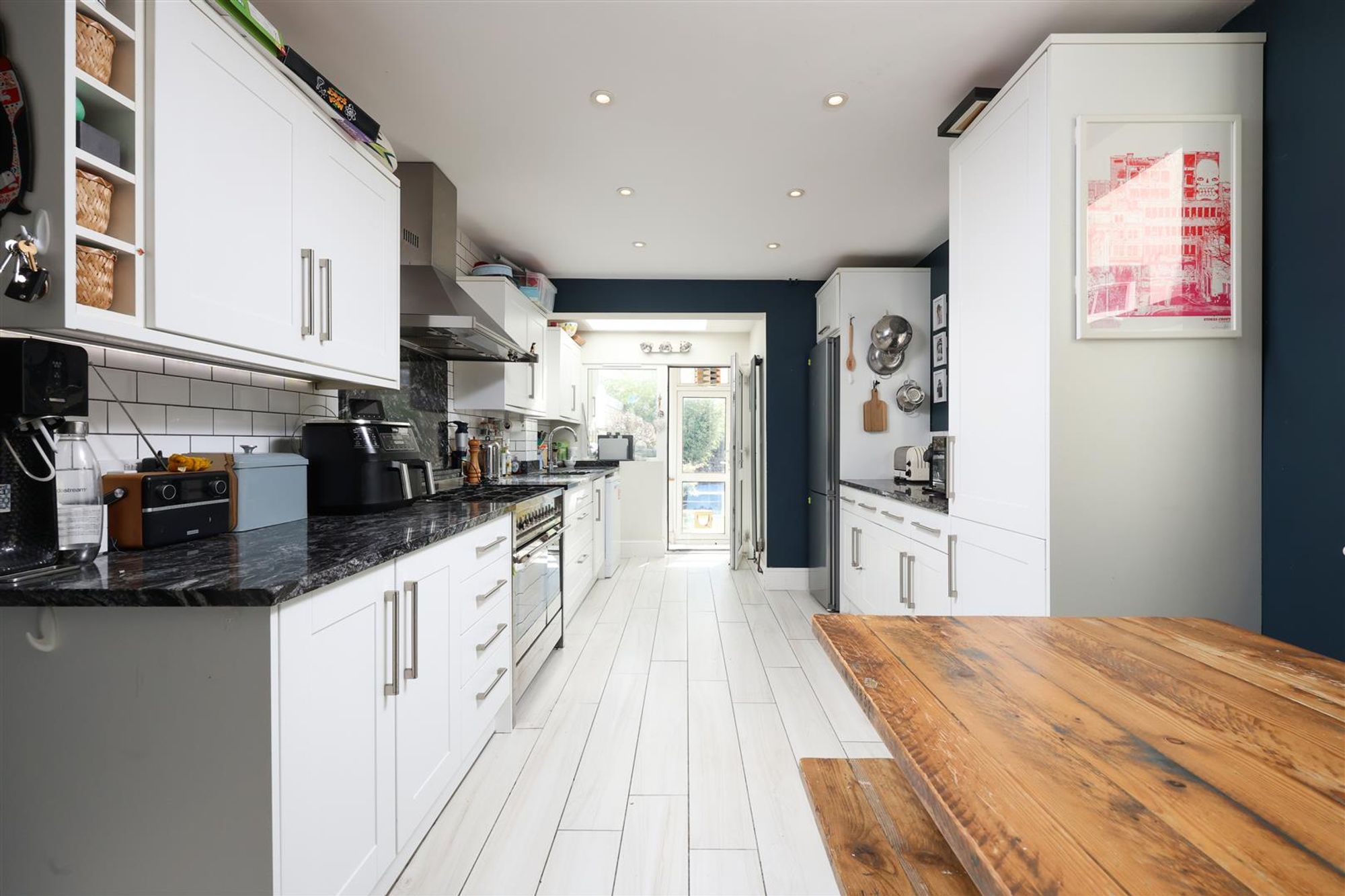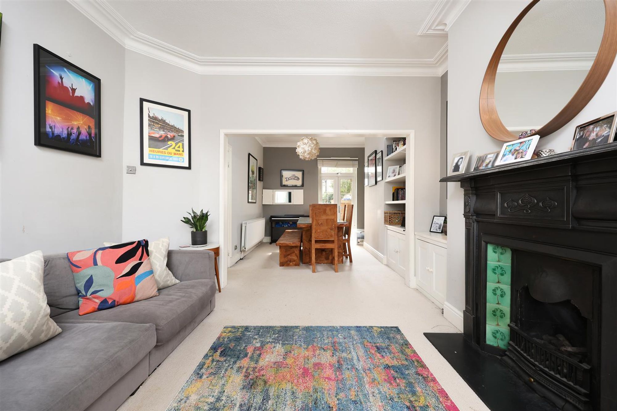 The accommodation on the ground floor comprises the open-plan reception rooms at the front with dual aspect windows front and rear, flooding the space with natural light. To the front, the living room with a bay and uPVC windows, shutters, a cast iron fireplace, ceiling cornice and rose, picture rail, and built-in storage in the alcoves. Sitting centrally and overlooking the side return garden via French doors is a versatile second reception, which offers a range of uses and is currently setup as a dining area. At the rear of the house is the impressive open-plan kitchen/dining room fitted with contemporary units, white splashback tiles, bespoke seating area and glazed doors leading into a utility room with downstairs W/C and then out onto the garden.