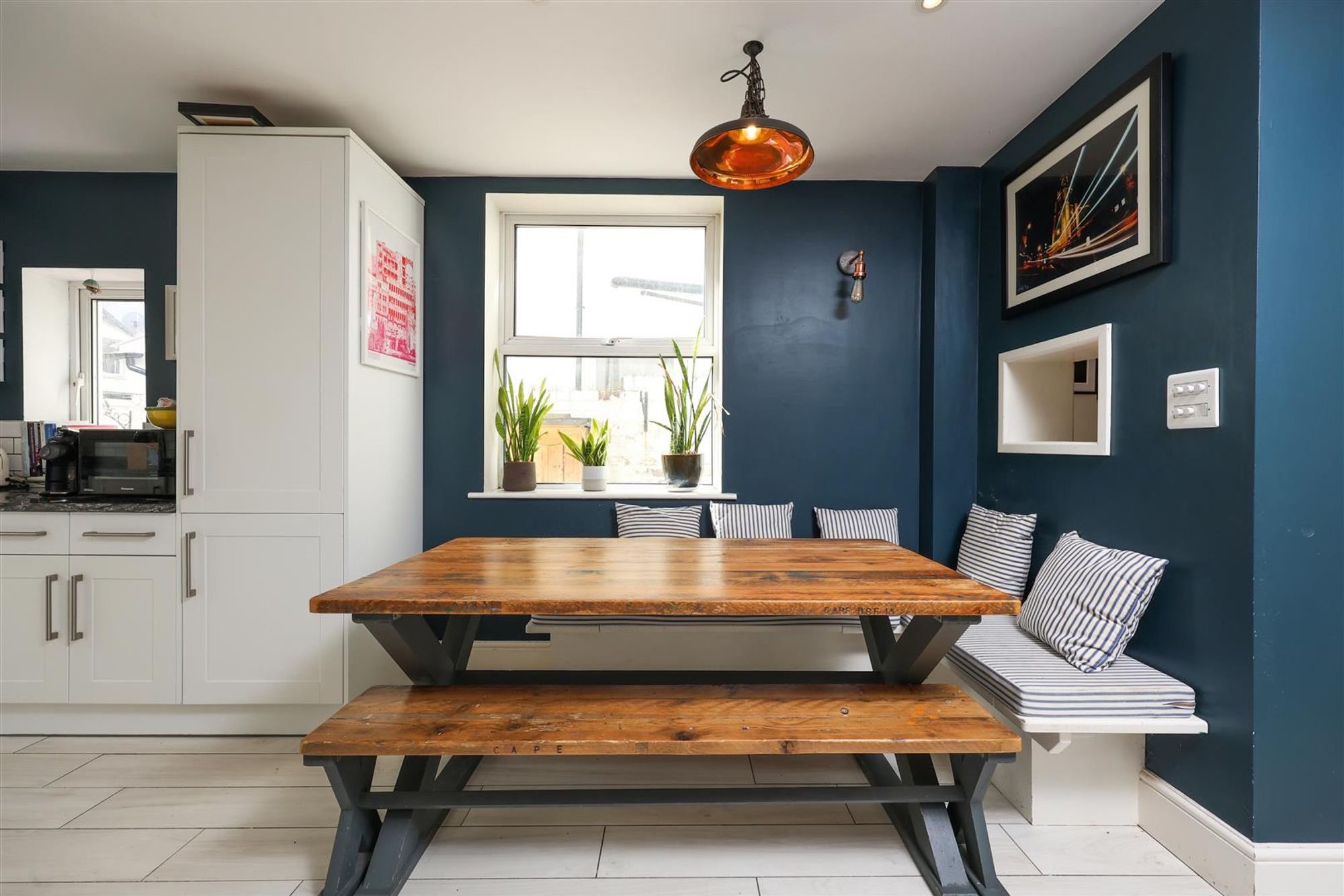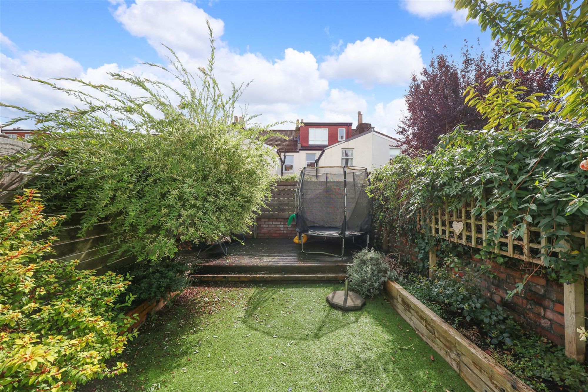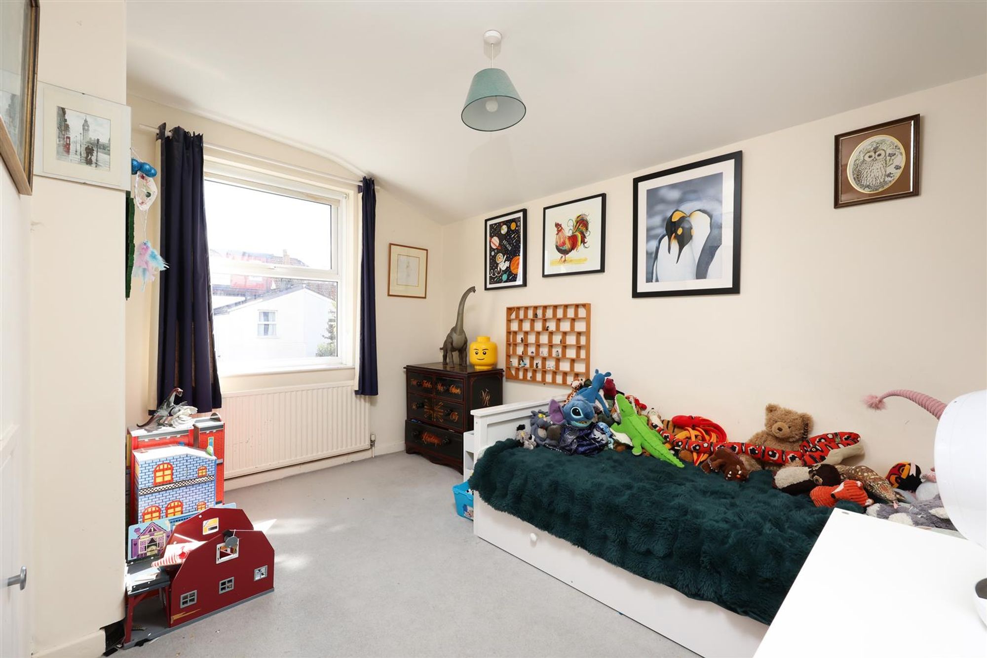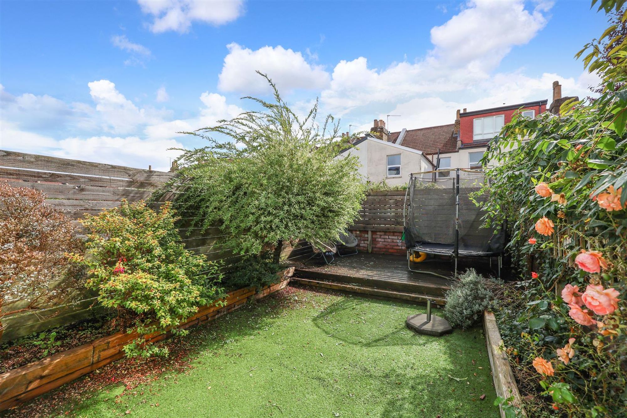 The accommodation on the ground floor comprises the open-plan reception rooms at the front with dual aspect windows front and rear, flooding the space with natural light. To the front, the living room with a bay and uPVC windows, shutters, a cast iron fireplace, ceiling cornice and rose, picture rail, and built-in storage in the alcoves. Sitting centrally and overlooking the side return garden via French doors is a versatile second reception, which offers a range of uses and is currently setup as a dining area. At the rear of the house is the impressive open-plan kitchen/dining room fitted with contemporary units, white splashback tiles, bespoke seating area and glazed doors leading into a utility room with downstairs W/C and then out onto the garden.