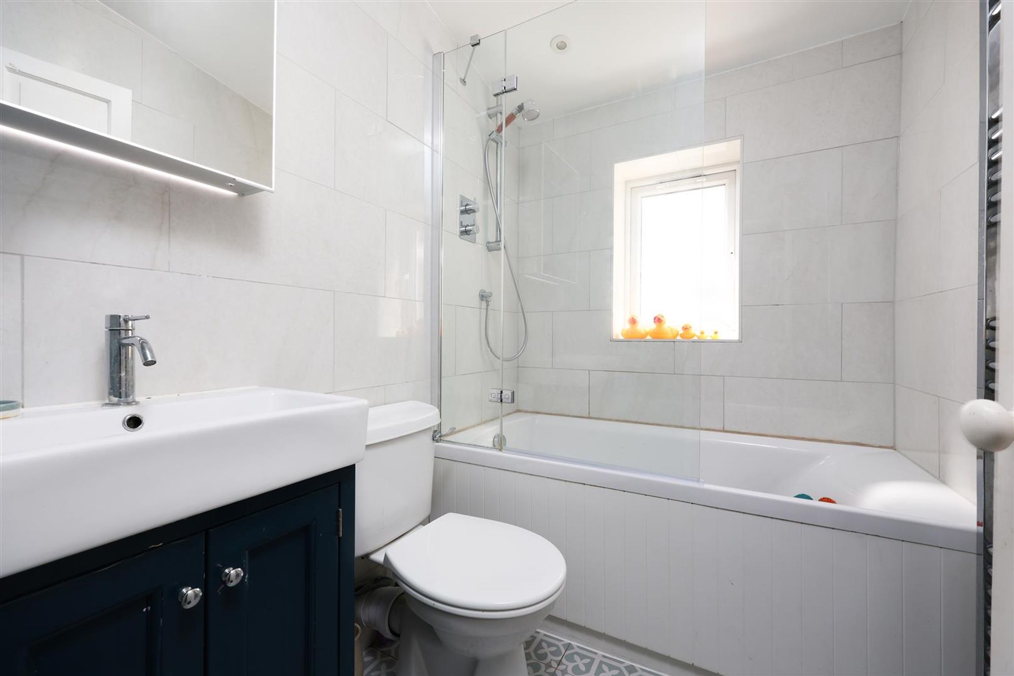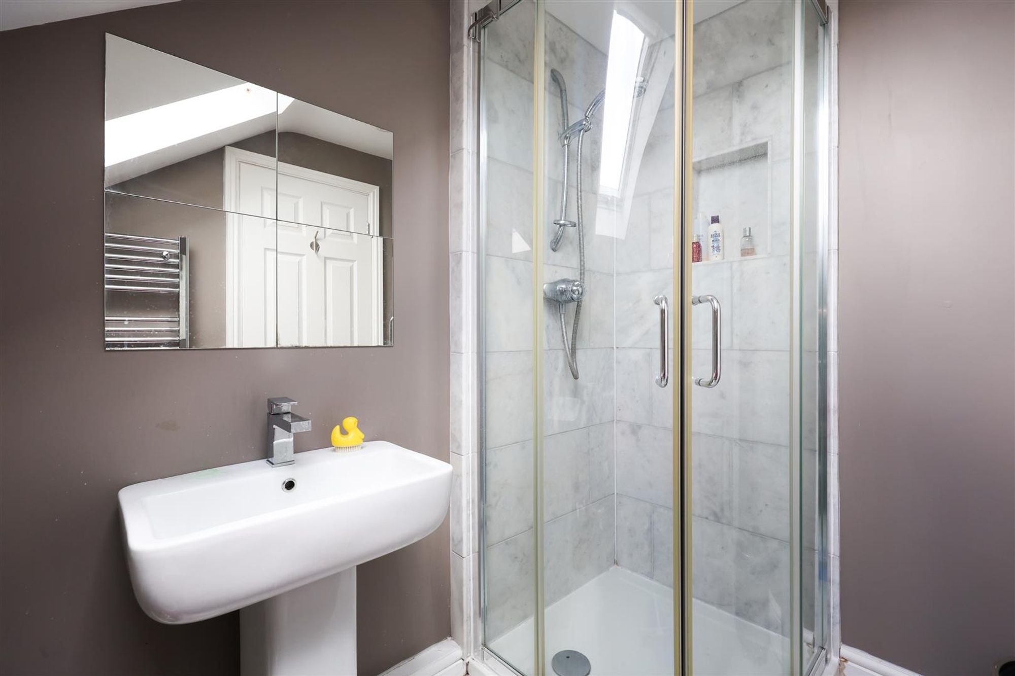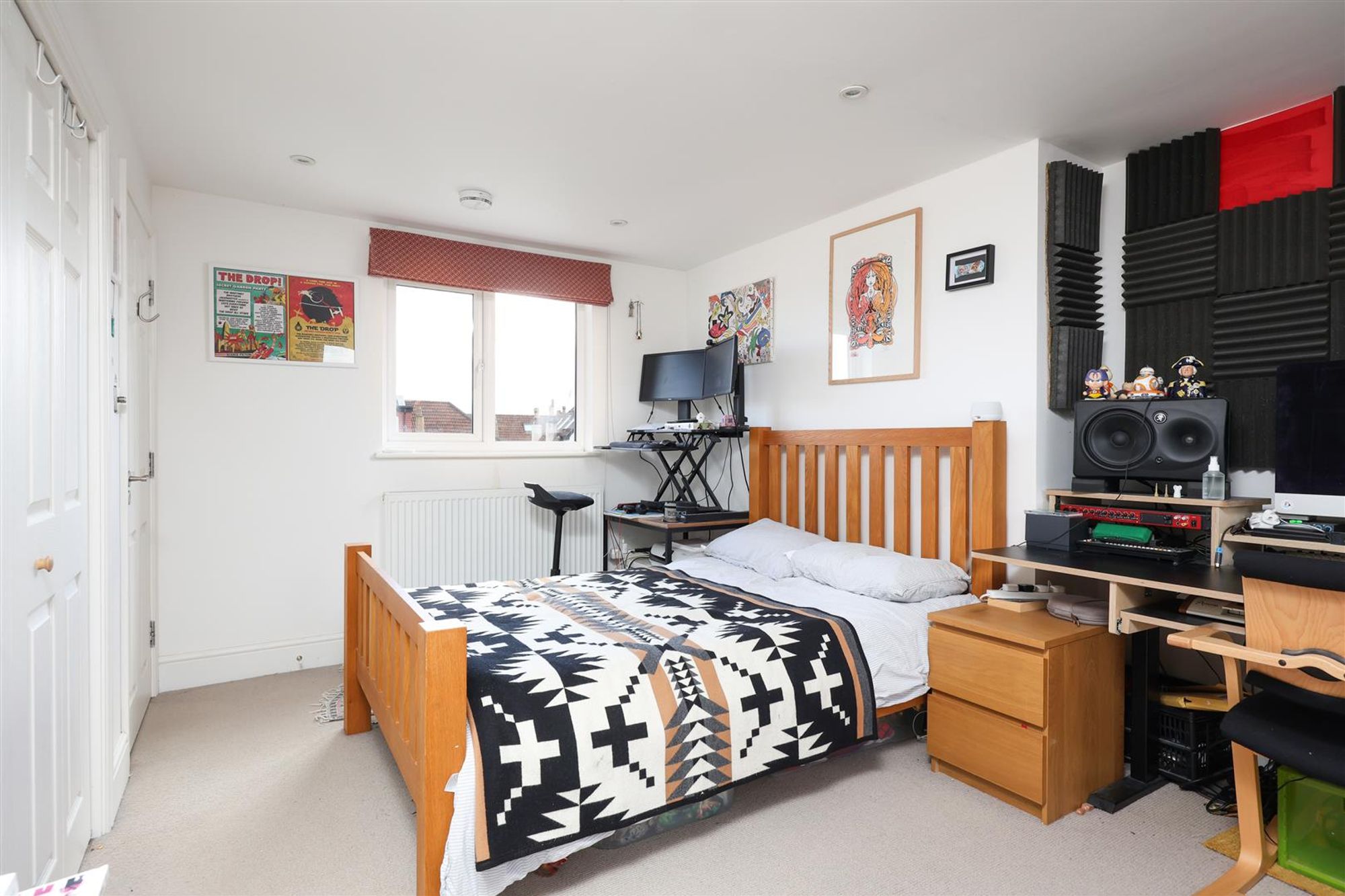 A staircase then leads up to the principal bedroom in the converted roof space spanning the full depth of the property. The loft bedroom with Velux windows at the front and a dormer window to the rear, this room further benefits from built-in storage and a separate en-suite bathroom with a shower unit.