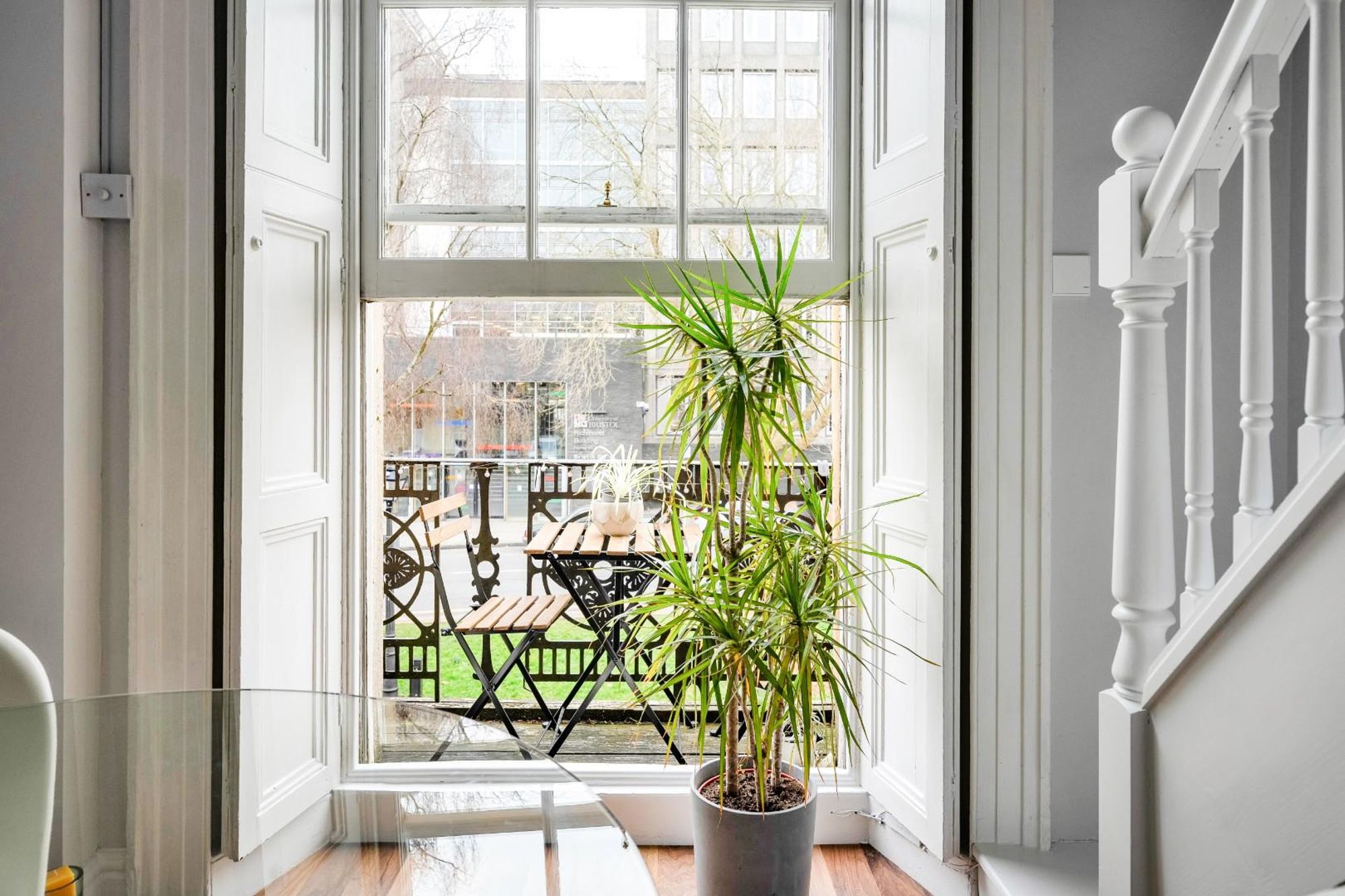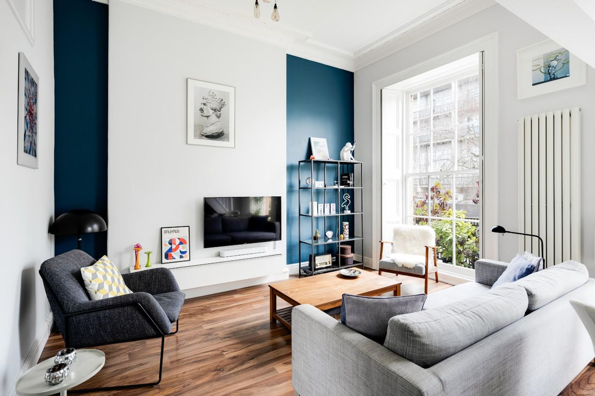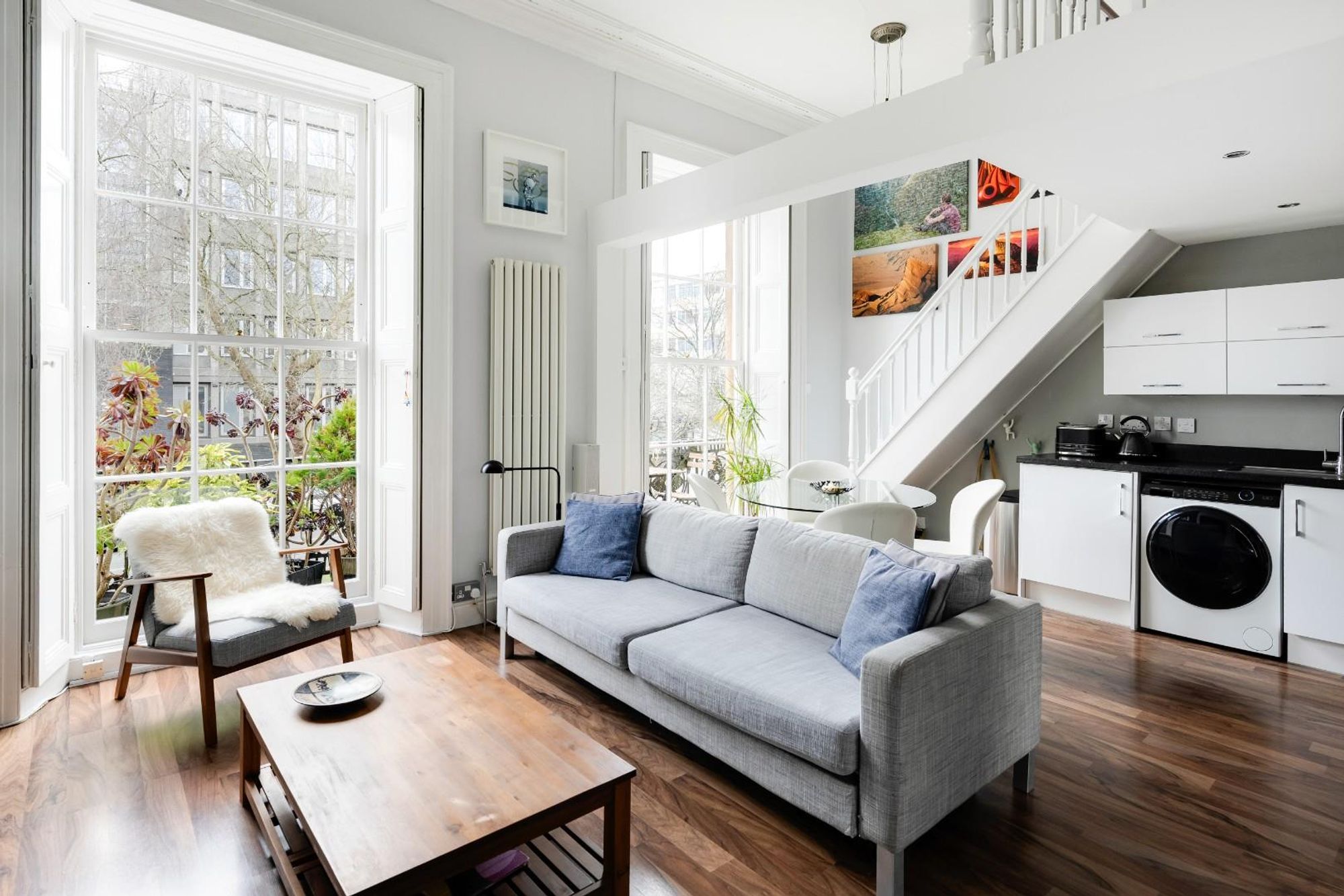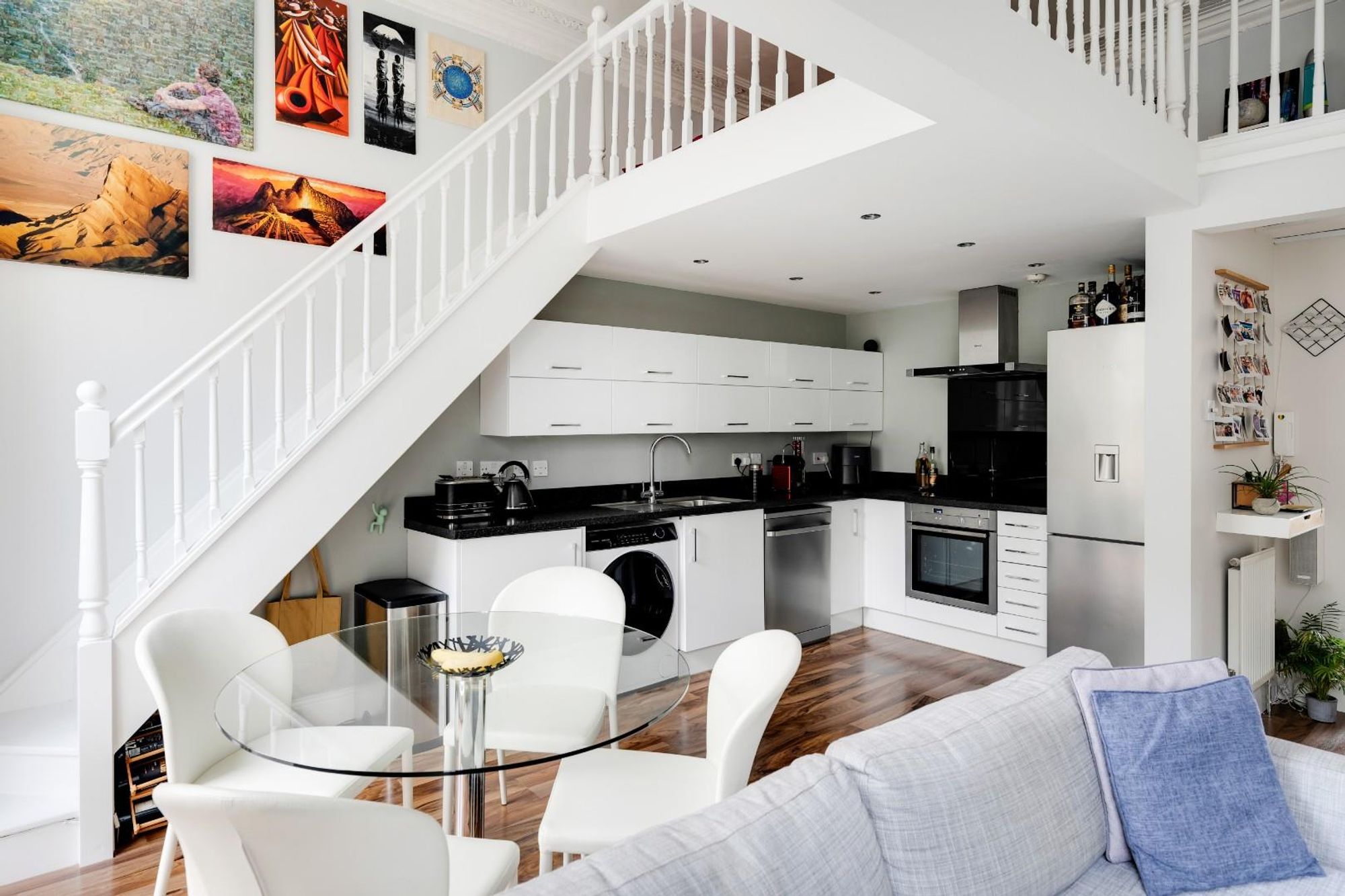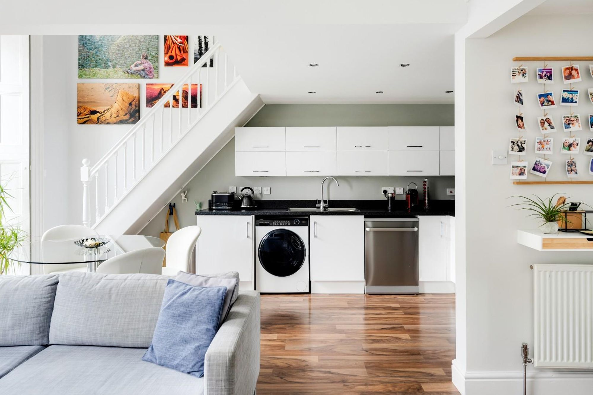 The apartment features many modern comforts and finishes that complements the original period character. A particular highlight is the impressive open-plan drawing room and kitchen/breakfast area, where two large front-facing sash windows open onto a full-width timber balcony. The fitted kitchen is well-appointed with integrated Neff appliances, including an oven, induction hob, and extractor hood, alongside a designated space for a washing machine, tumble dryer, dishwasher, and full-sized fridge freezer.