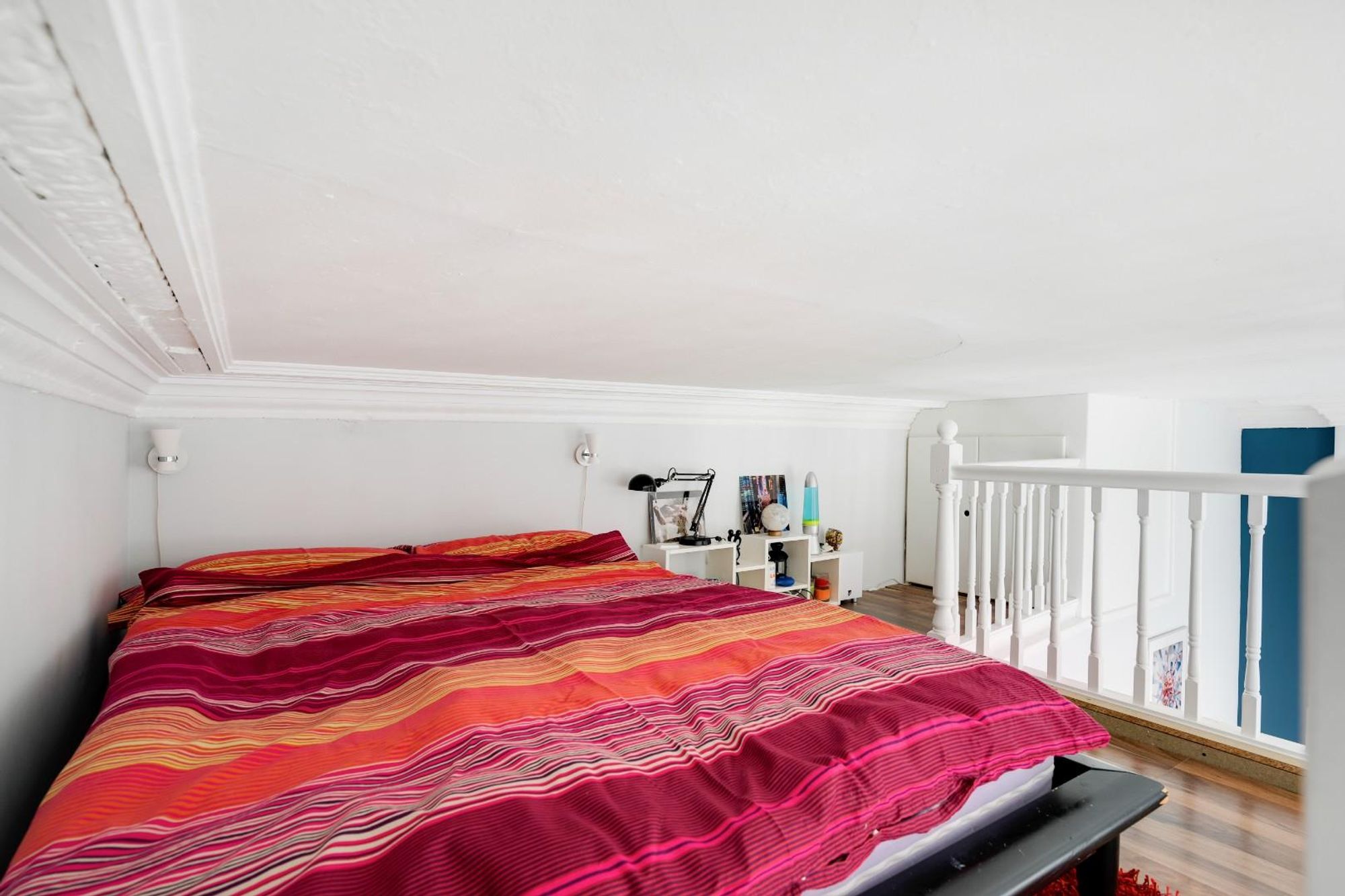 Fine period cornicing remains intact, complementing the generous proportions of the space. A discreet set of steps leads to a mezzanine level, currently used for guest accommodation, featuring wooden flooring, a storage cupboard and power points.