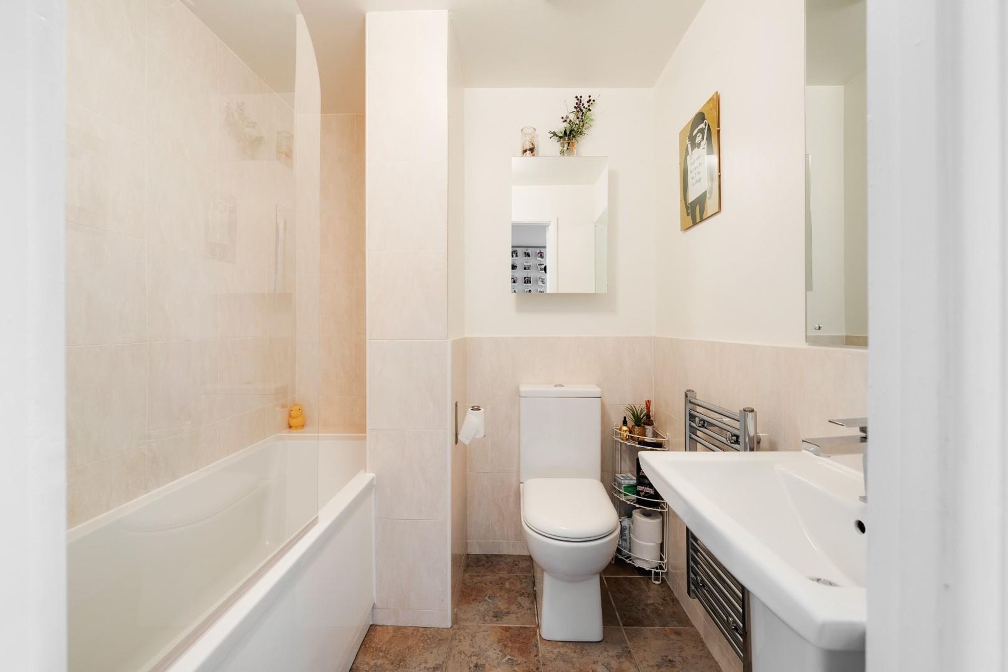 Centrally positioned, the stylishly finished bathroom features contemporary tiling, while to the rear, a spacious and light-filled bedroom enjoys views over the well-kept gardens of Buckingham Place and features mezzanine storage.