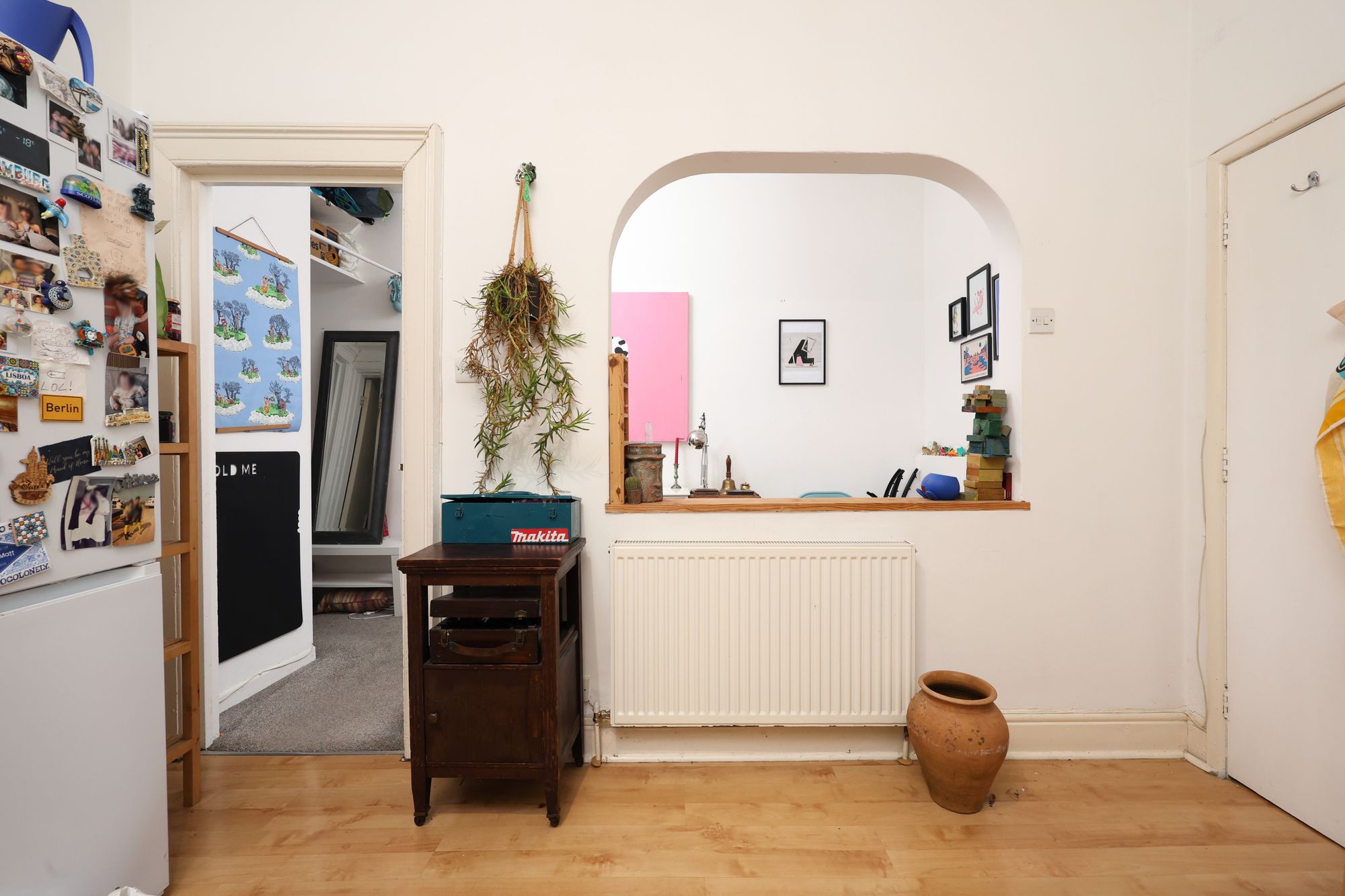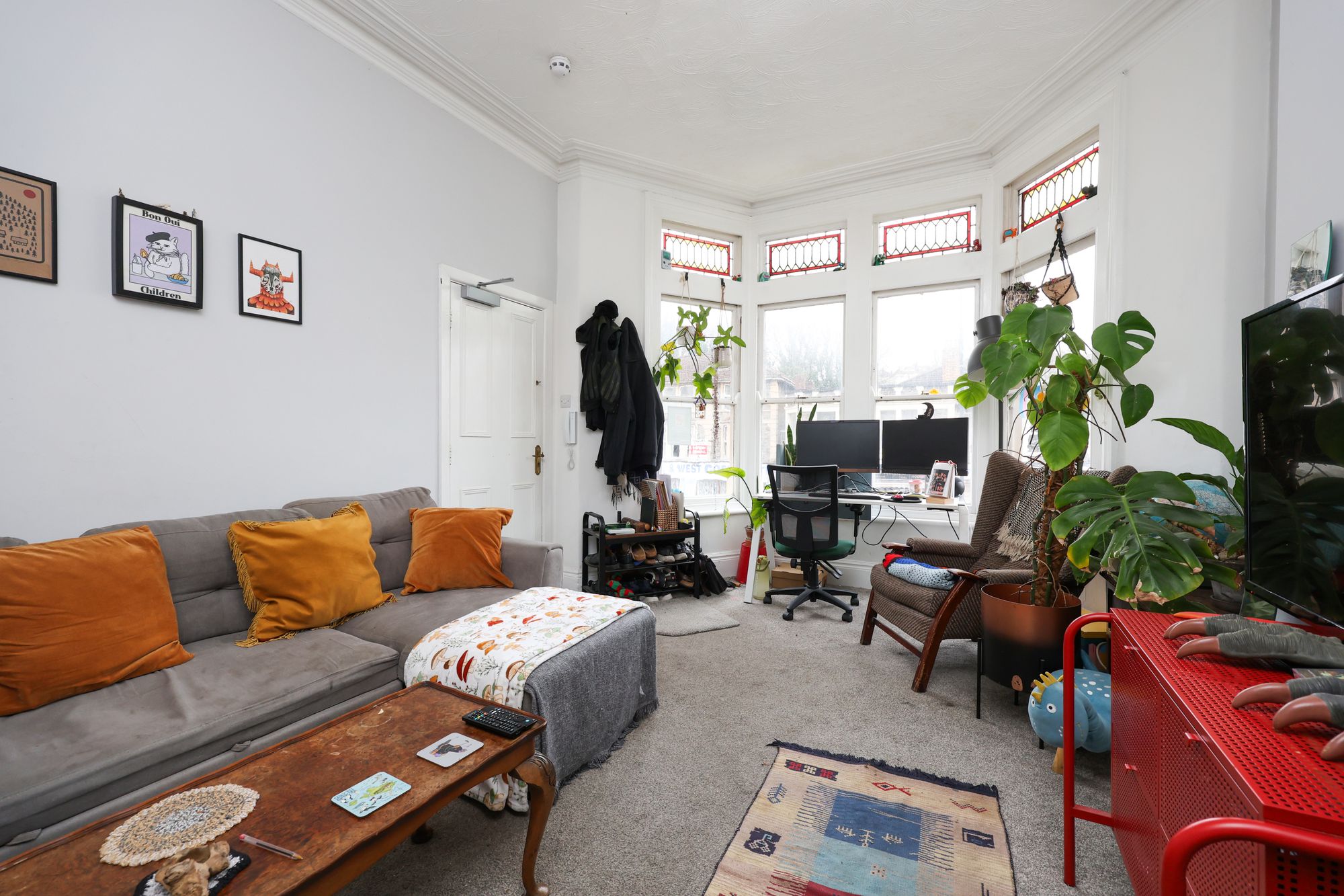 Once through the main entrance, a communal corridor leads to the flat’s front door. At the front of the property is a large reception room with bay, sash windows, period cornice and original stained glass which reflect the natural light beautifully.
