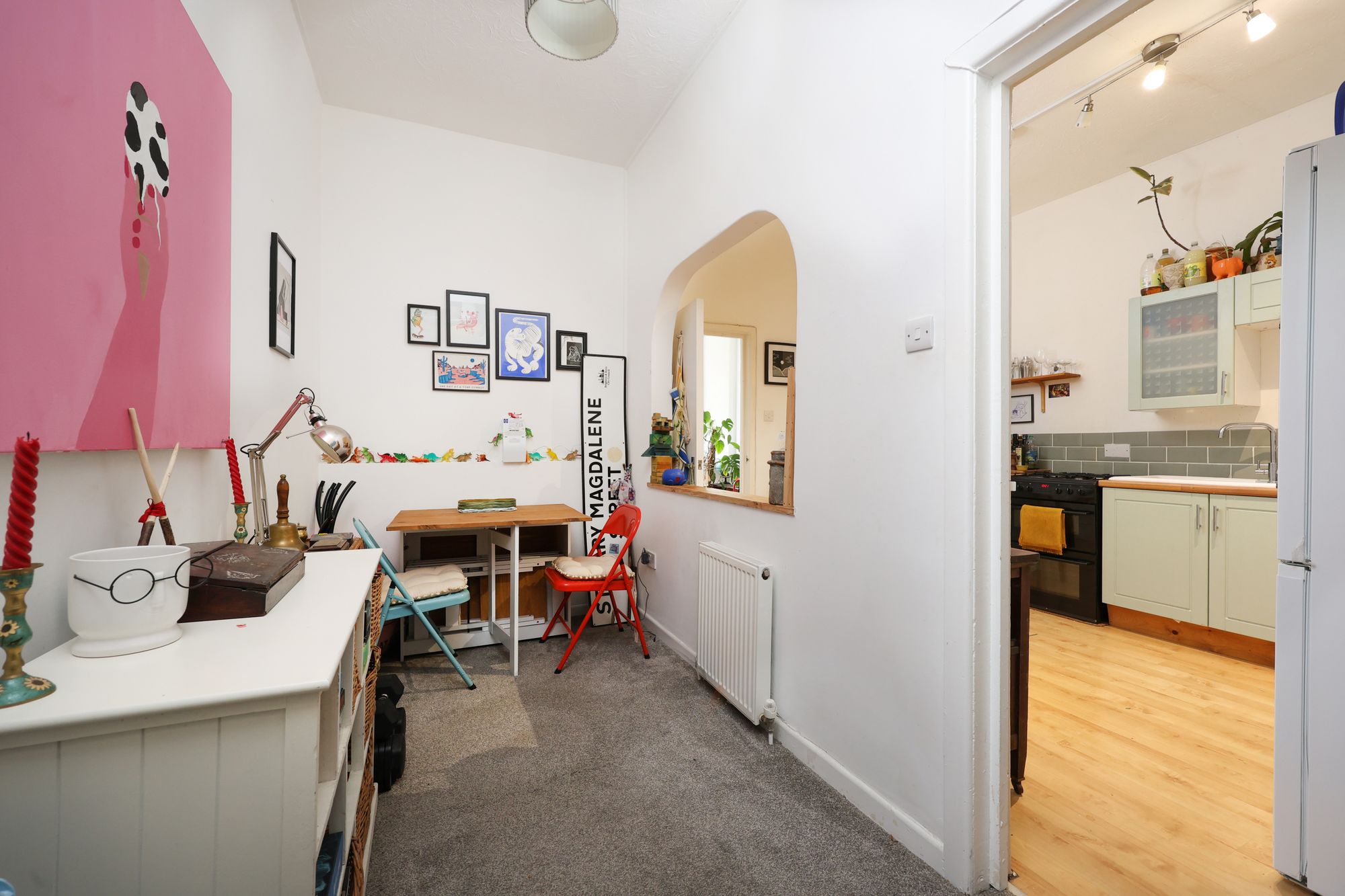 A doorway then leads into a large, stylish kitchen with duck-egg green units, solid wood worktop, grey metro-brick tiled splash back and a window which looks out onto the rear of the property. Off the kitchen is a dining/study space, a real bonus area for buyers.