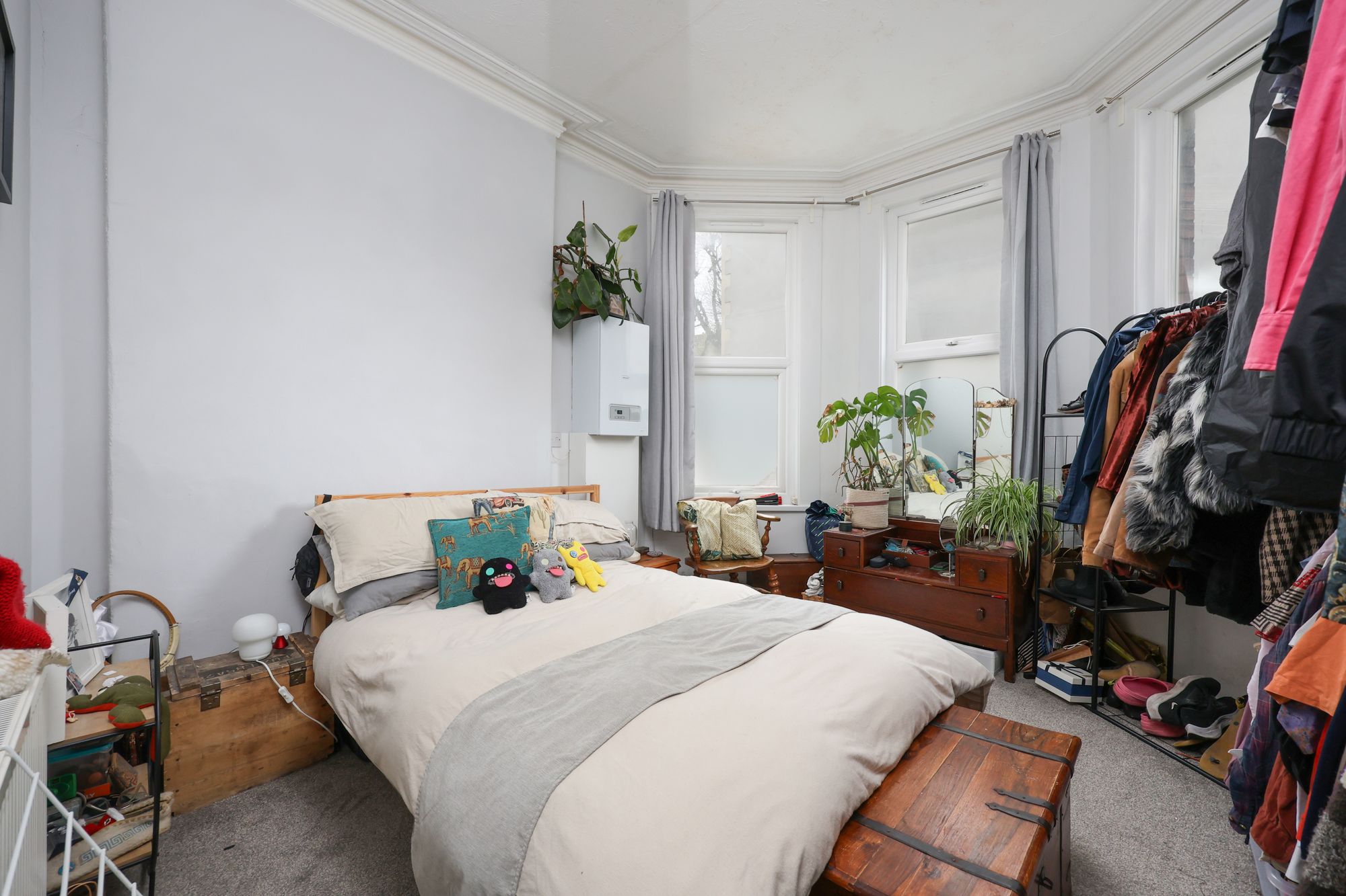 Beyond the bathroom is a large double bedroom, finished in neutral tones, featuring bay window, period cornice and an outlook onto the communal courtyard.