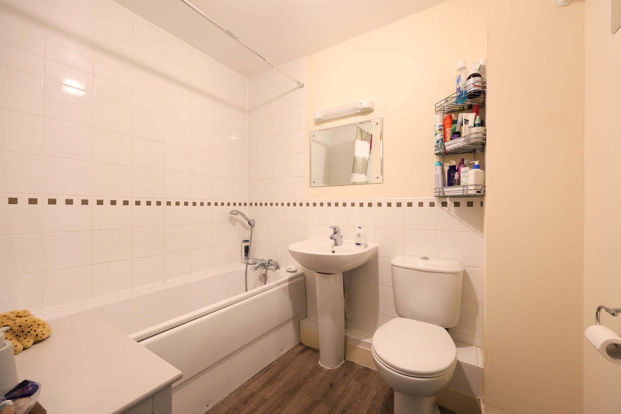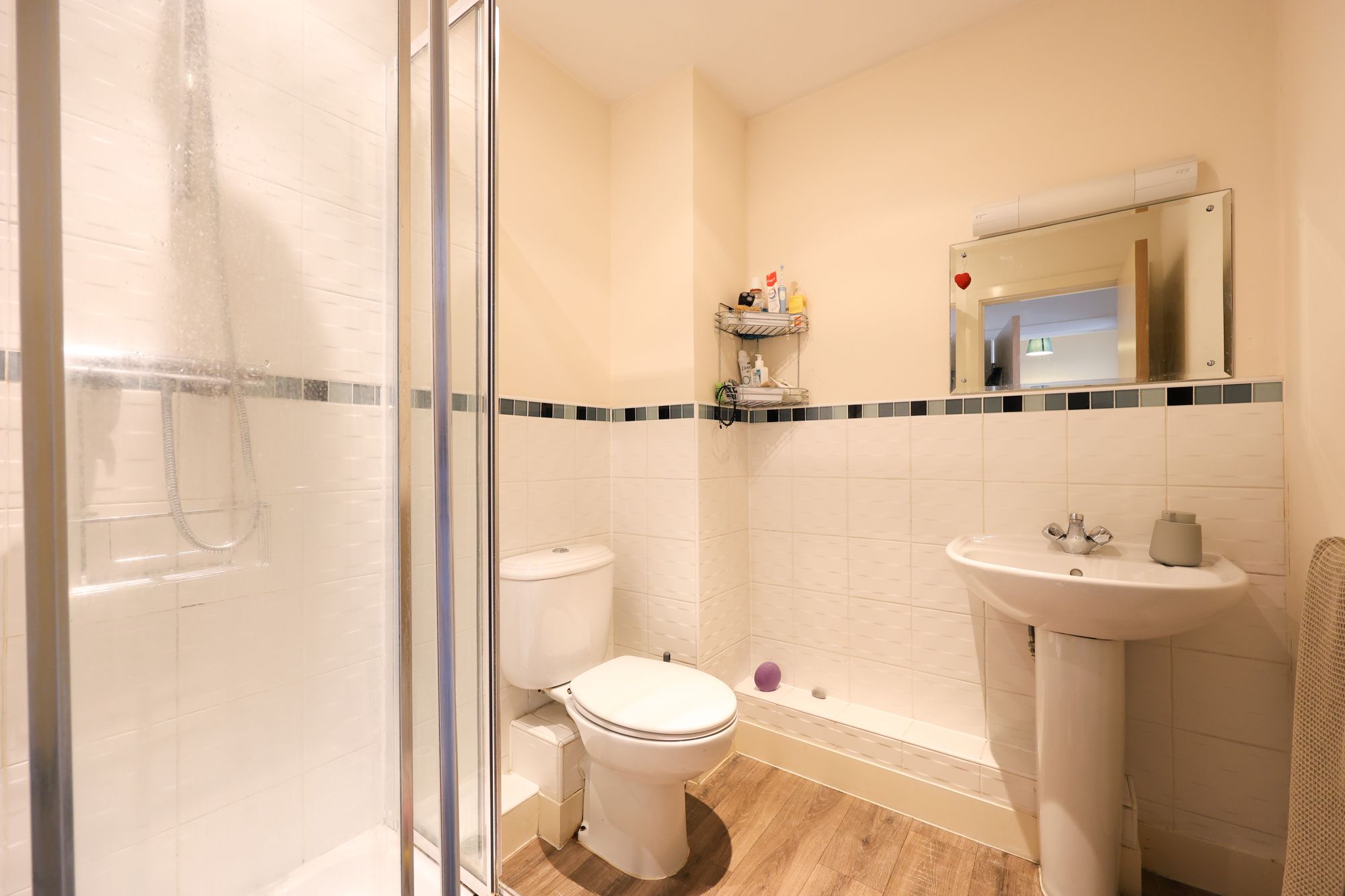 The principal bedroom benefits from a stylish en-suite shower room, offering a private retreat, while the second double bedroom is generously proportioned and ideal for guests, family members or as a home office. A well-presented three-piece bathroom sits centrally and serves the apartment, finished with modern fittings and neutral decor.