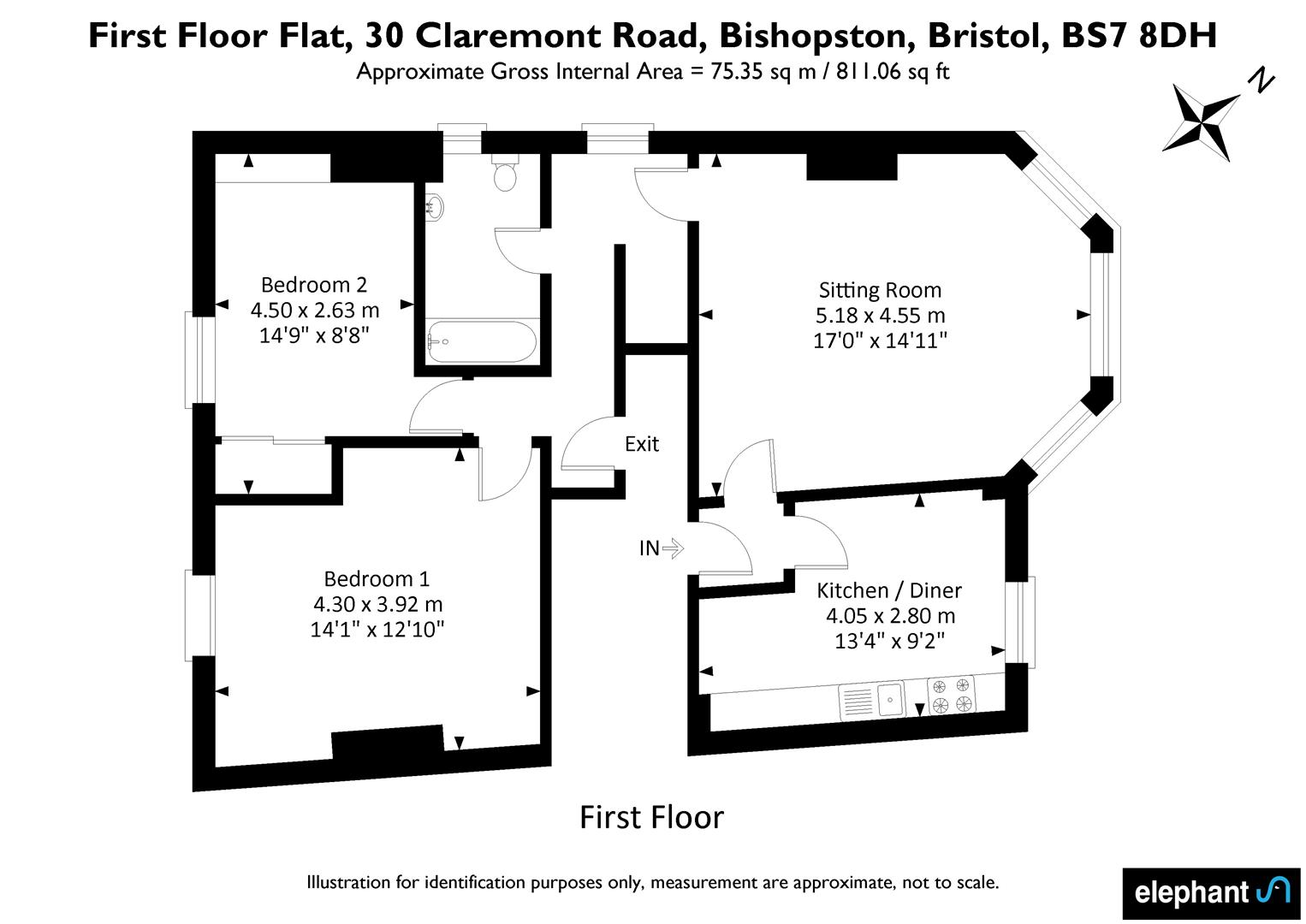 The spacious flat is accessed via a communal entrance, with stairs that lead to the first floor. Entering the flat, there is an entrance hall with access to the kitchen and the sitting room. The kitchen/diner is located to the front, which benefits a sash window to the front aspect. The kitchen is fitted with a range of wall and base units with wood worktops over, an integrated oven, gas hob and extractor, while also providing space for washing machine and fridge/freezer. Adjacent is the sitting room, benefitting a bay with sash windows providing a pleasant outlook onto the neighbouring homes of Claremont Road. The sitting room provides ample space for furnishing.