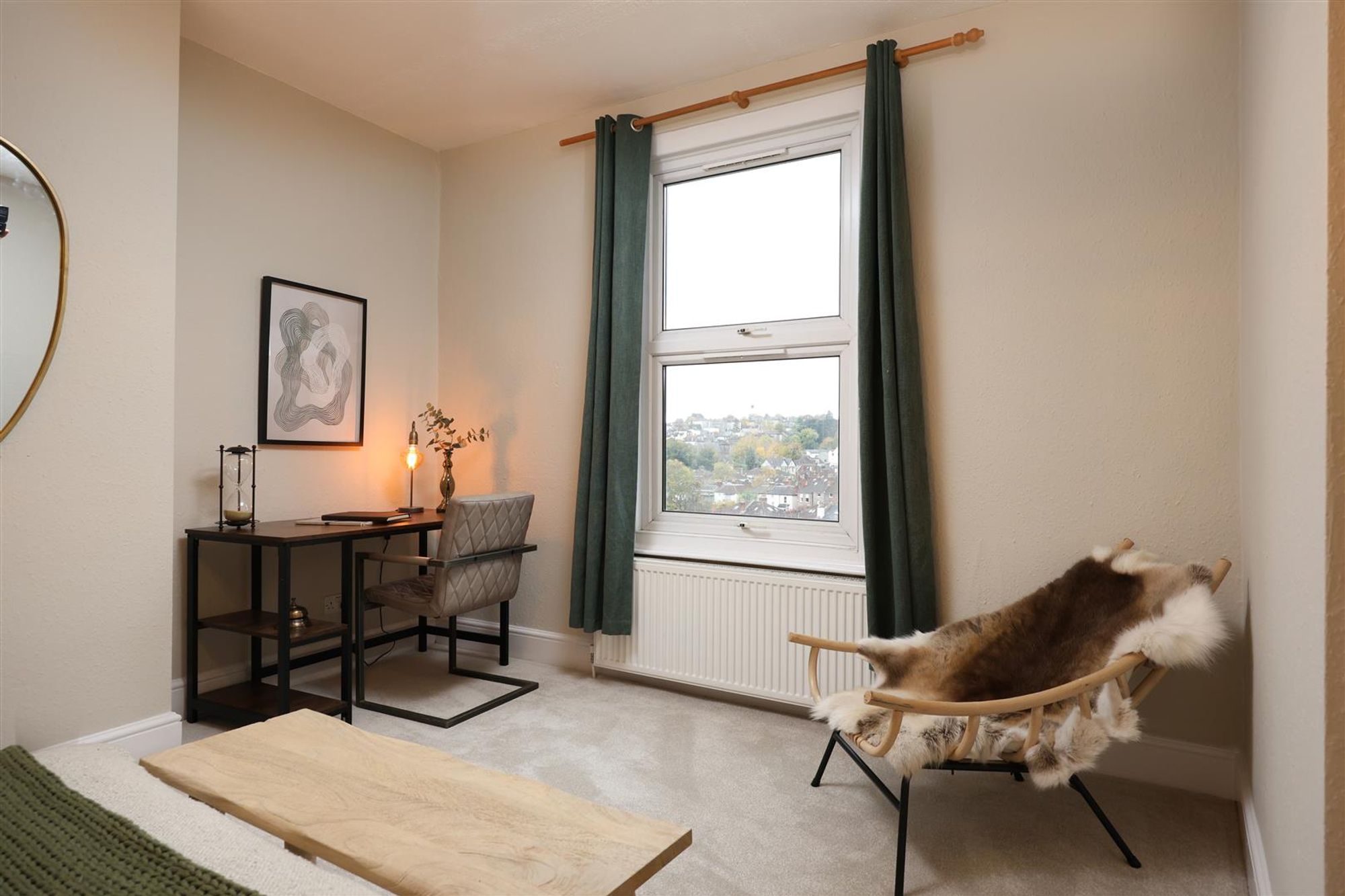 To the rear, the principal bedroom features a double-glazed window to the rear with far-reaching rooftop views. Adjacent is the second double bedroom, sharing the same elevated views to the rear via a double-glazed window and benefiting a built in wardrobe. Sitting centrally is the three piece bathroom with bath and shower over, wash hand basin, W/C, and an obscured window to the side aspect.
