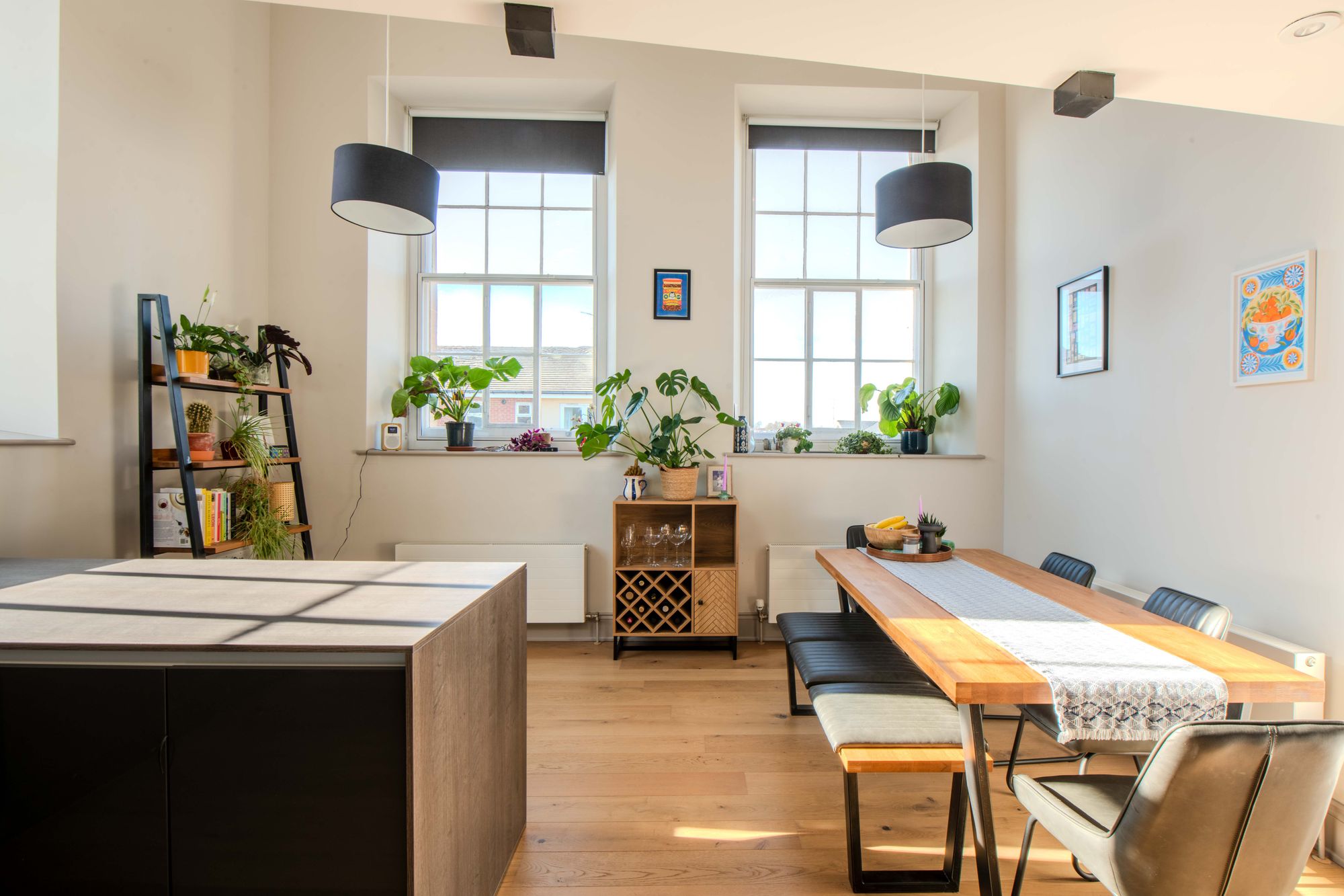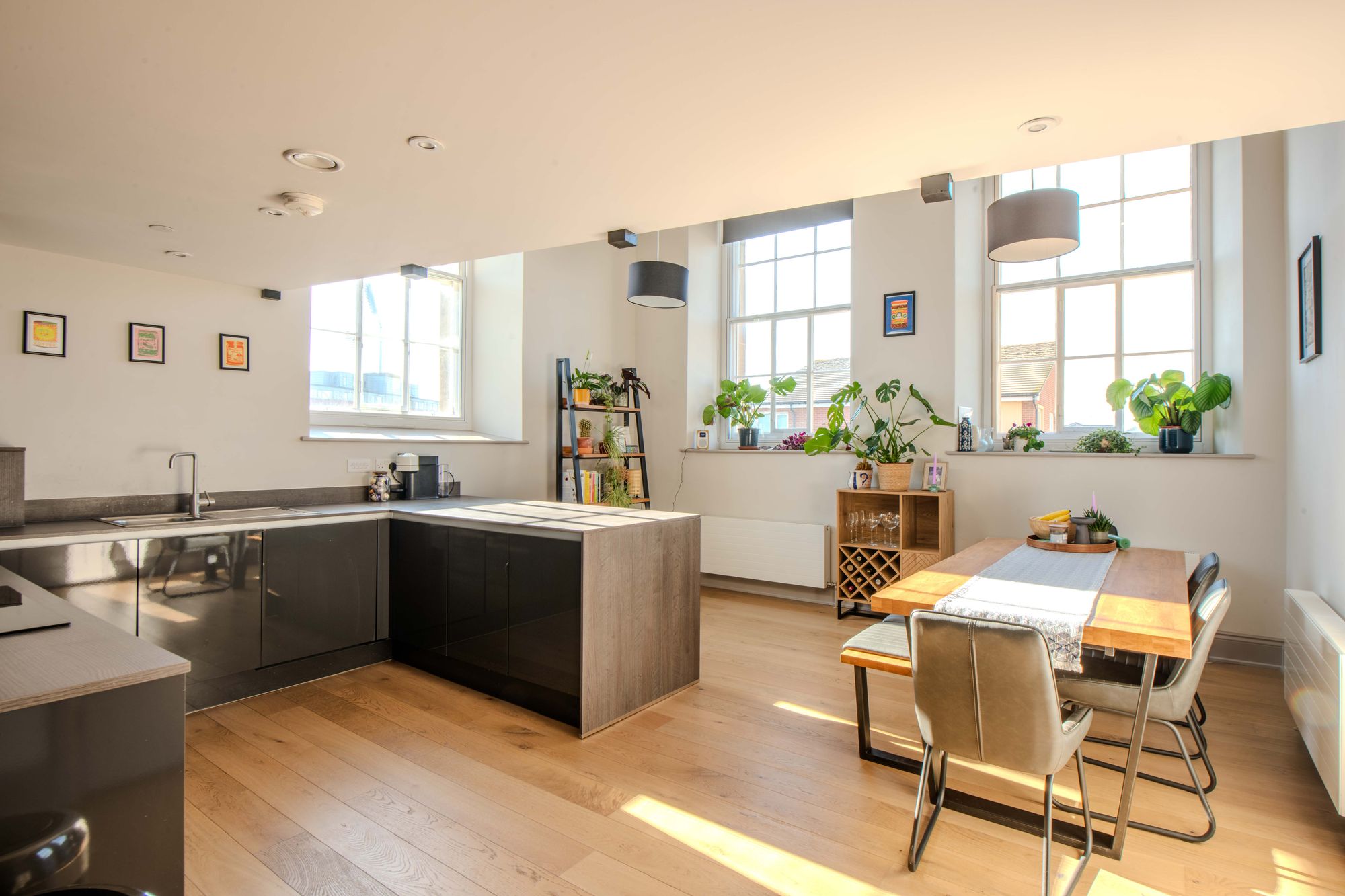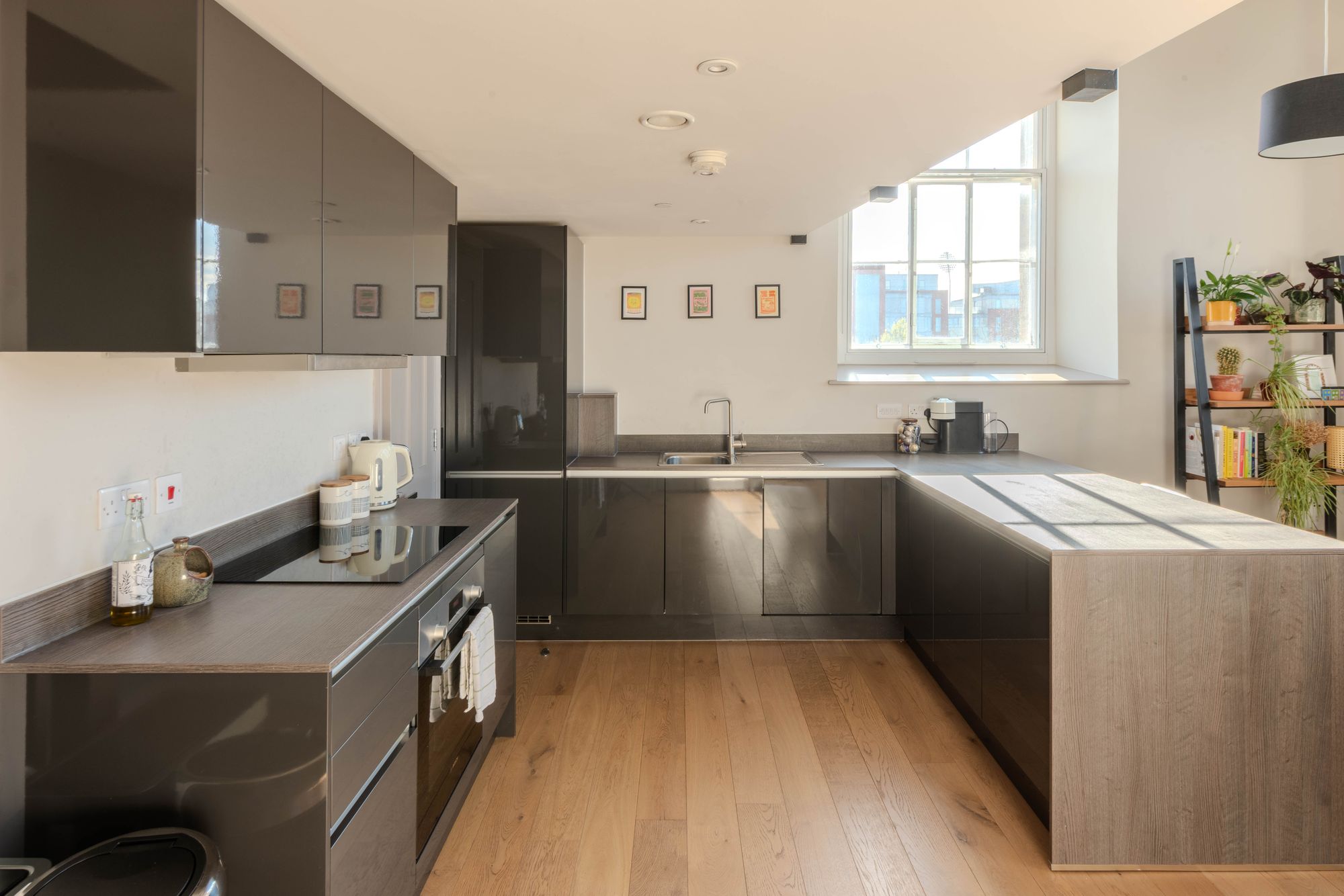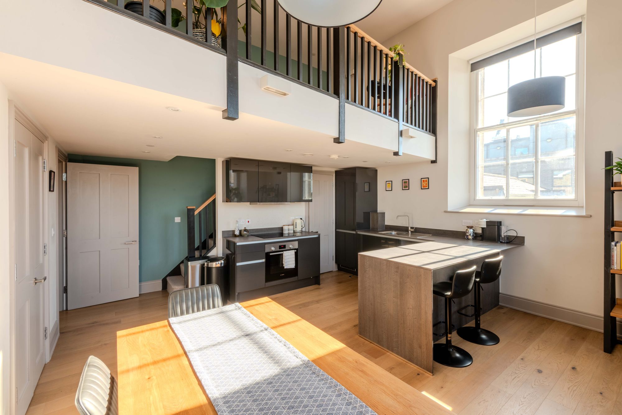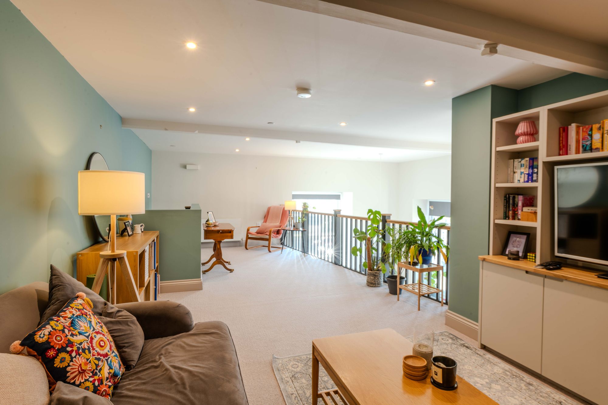 The heart of the home is the open-plan kitchen diner, a generous space ideal for both everyday living and entertaining. Here, you’ll find sleek cabinetry, integrated appliances, ample worktop space and a large pantry hidden away, while the dining area allows for relaxed meals with family or friends. The elevated living room on the mezzanine floor sits above the kitchen/diner, and offers a unique vantage point and a cosy retreat for relaxation, with large windows framing the space and flooding it with natural light. Both bedrooms are spacious doubles, each offering a tranquil sanctuary at the end of the day, with plenty of room for wardrobes and additional furnishings. The principal bedroom benefits from its own en-suite bathroom, which is finished to a high standard with modern fittings, while the second bathroom is conveniently positioned to serve both guests and the second bedroom.