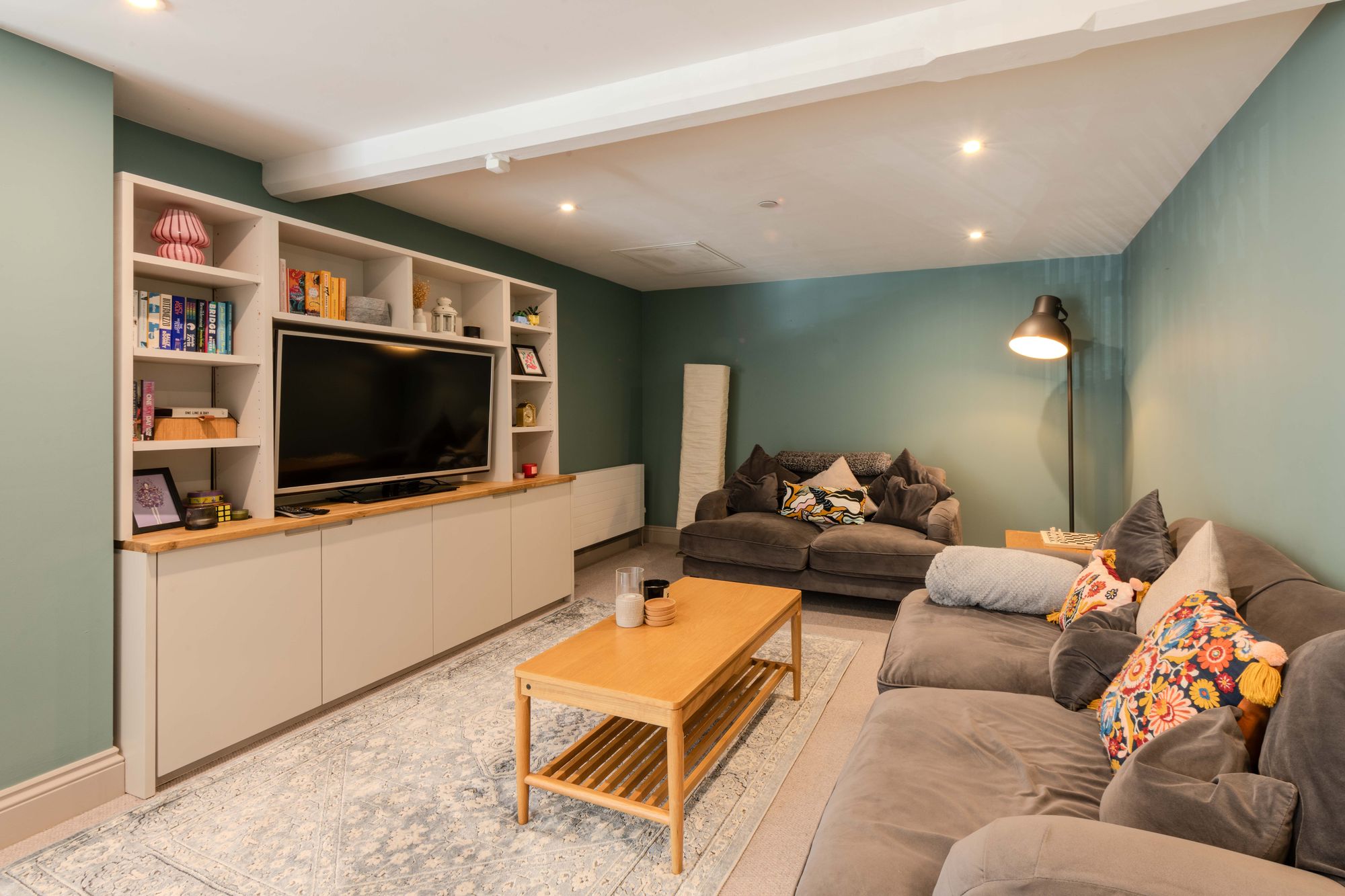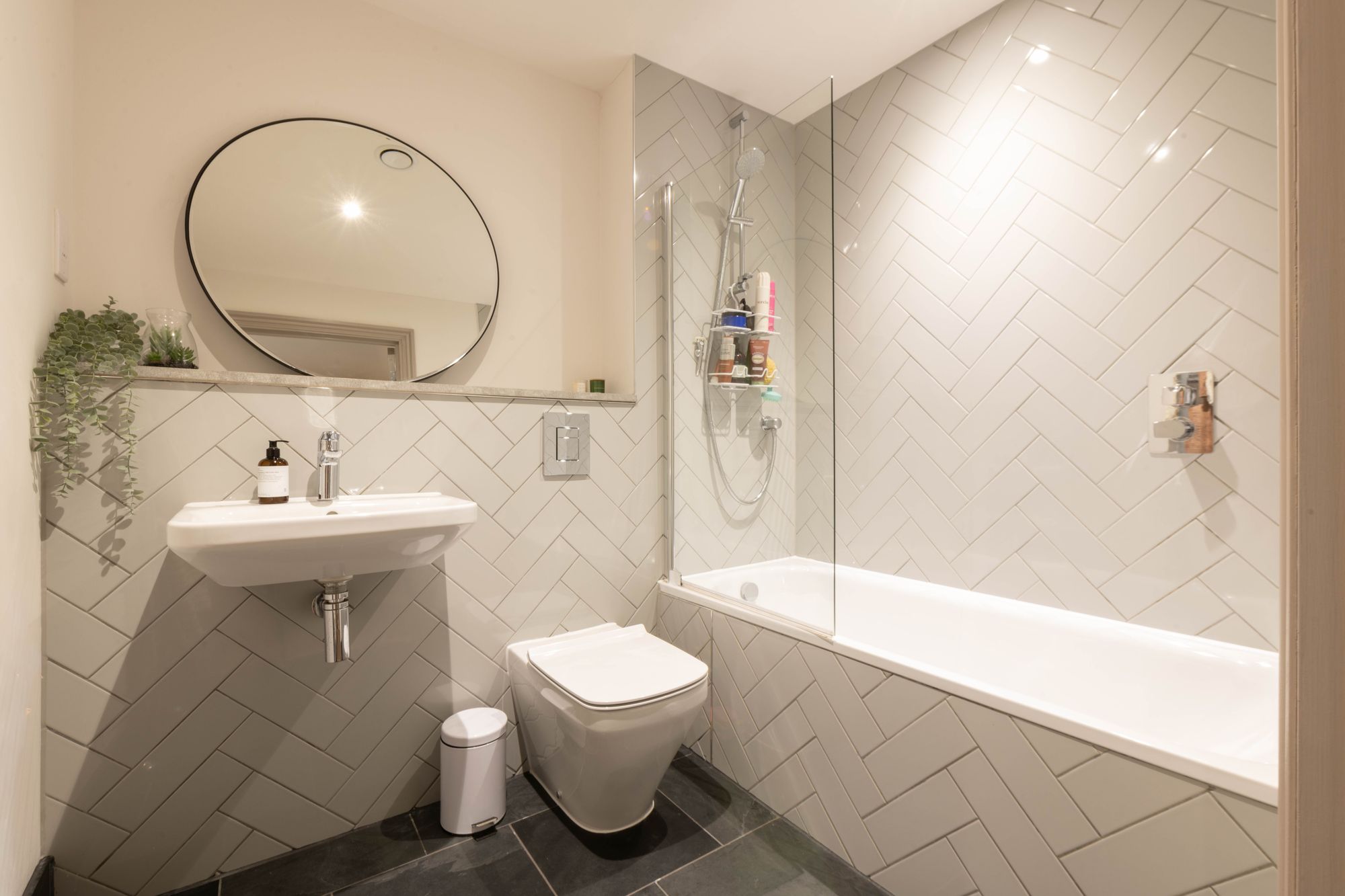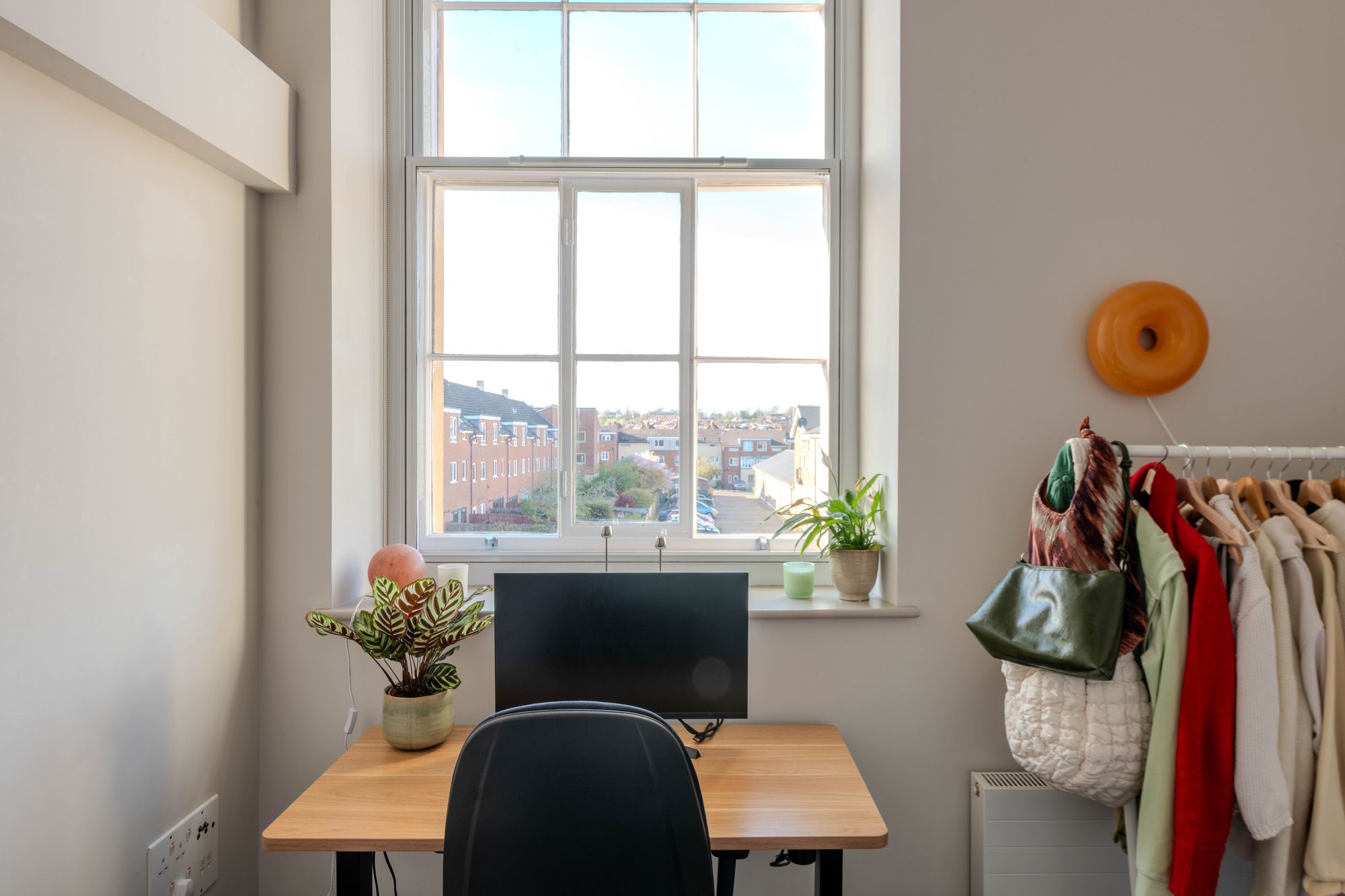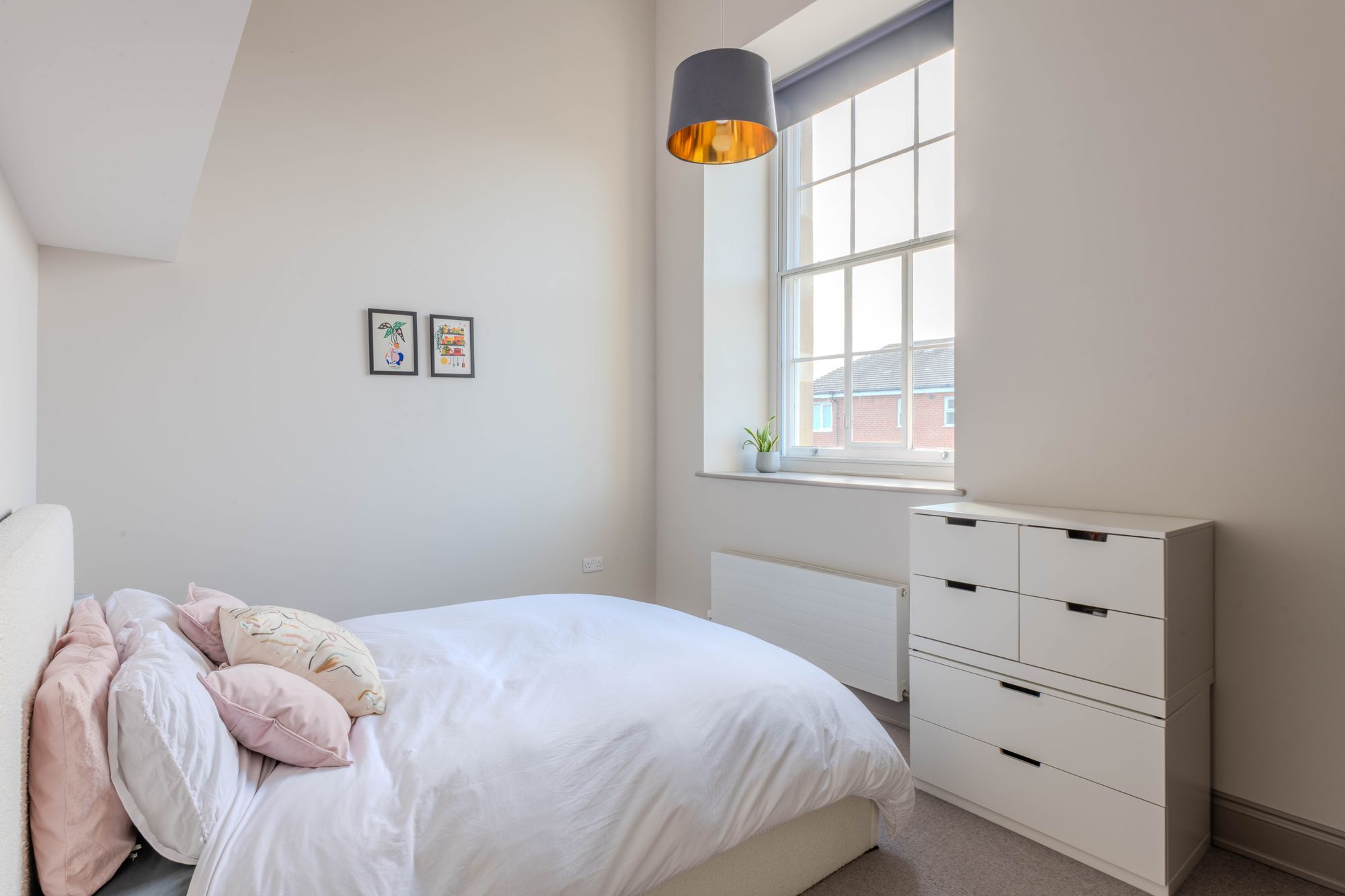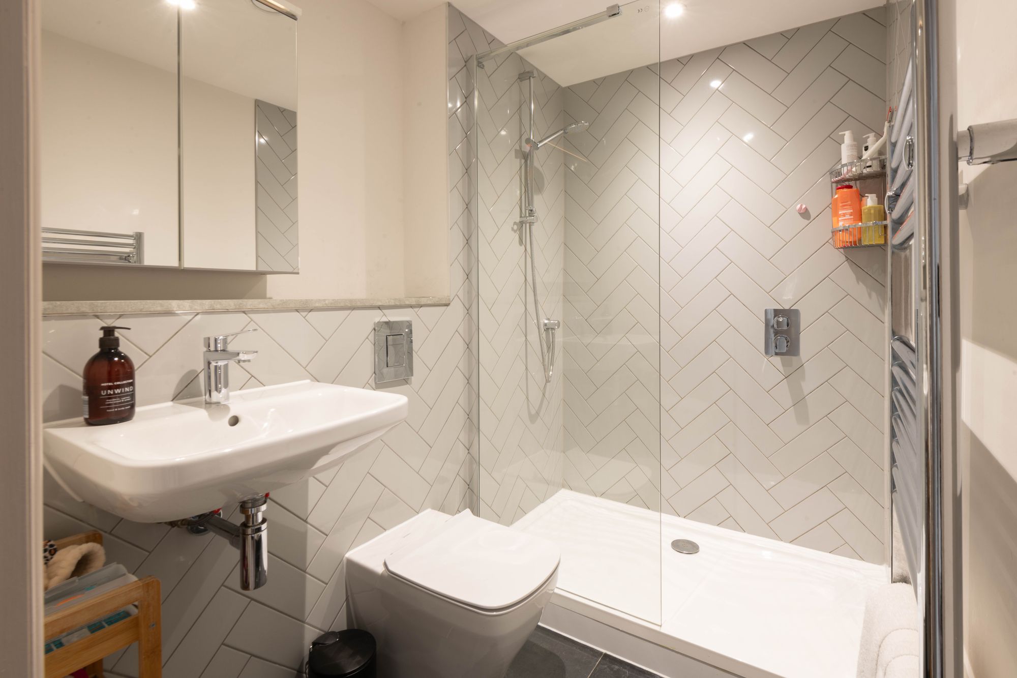 The heart of the home is the open-plan kitchen diner, a generous space ideal for both everyday living and entertaining. Here, you’ll find sleek cabinetry, integrated appliances, ample worktop space and a large pantry hidden away, while the dining area allows for relaxed meals with family or friends. The elevated living room on the mezzanine floor sits above the kitchen/diner, and offers a unique vantage point and a cosy retreat for relaxation, with large windows framing the space and flooding it with natural light. Both bedrooms are spacious doubles, each offering a tranquil sanctuary at the end of the day, with plenty of room for wardrobes and additional furnishings. The principal bedroom benefits from its own en-suite bathroom, which is finished to a high standard with modern fittings, while the second bathroom is conveniently positioned to serve both guests and the second bedroom.