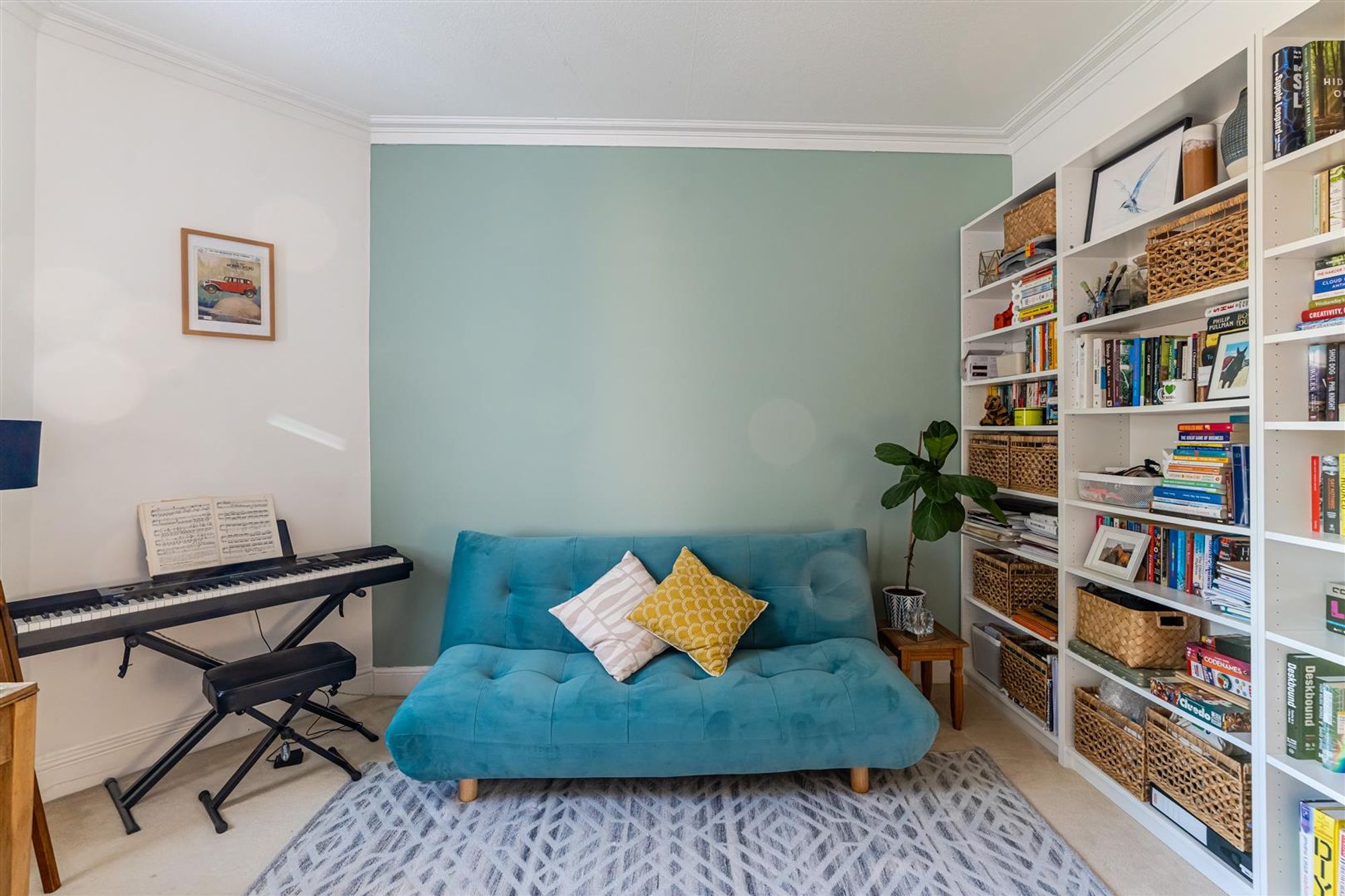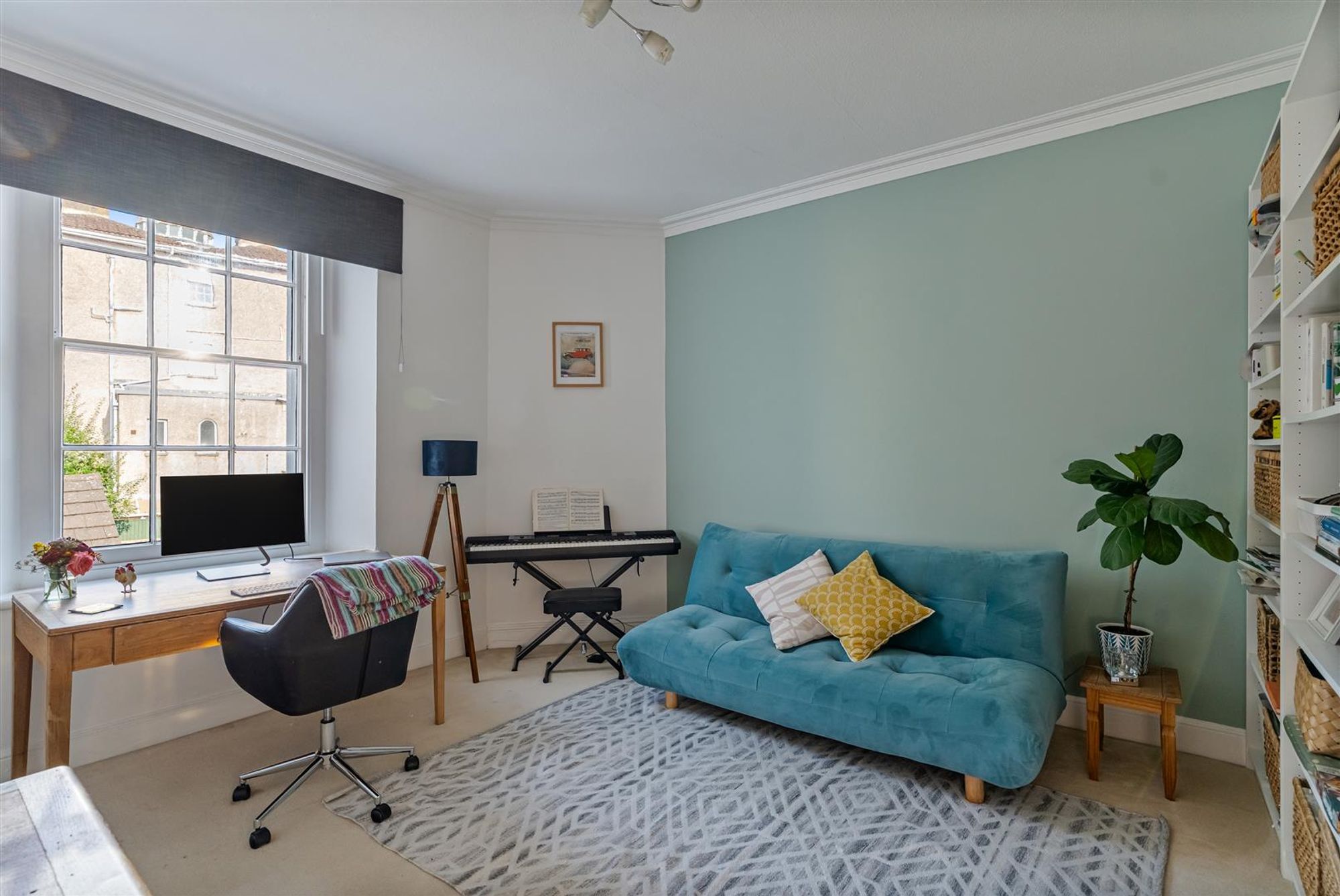 The generous principal bedroom features soft carpeting underfoot, built-in wardrobes, and another sash window bringing in plenty of light. An en suite with shower and w/c is a useful addition. The second bedroom, also well-sized, is currently set up as a home office but easily accommodates a double bed and storage furniture.
