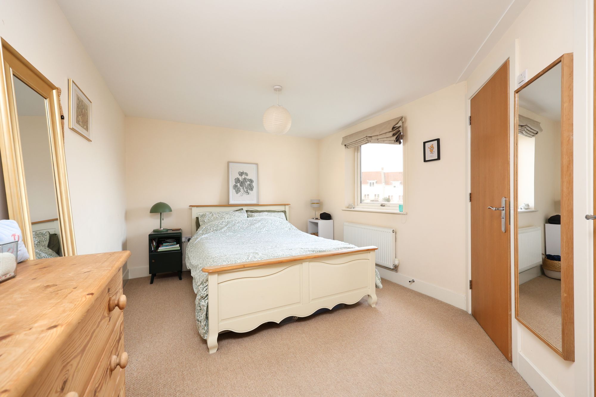 Leading off the hallway, the light and bright main bedroom features built-in wardrobes, a double glazed window and a doorway leading to an en-suite shower room with a modern suite, walk-in shower, and tiled splash-backs. The adjacent second double bedroom shares the same outlook and is currently used as a guest bedroom/home office. The property further benefits from ample storage in the hallway from two large cupboards. Completing the accommodation is a smartly finished bathroom with a contemporary suite, tiled splash-backs, a heated towel rail, and stainless steel fittings.