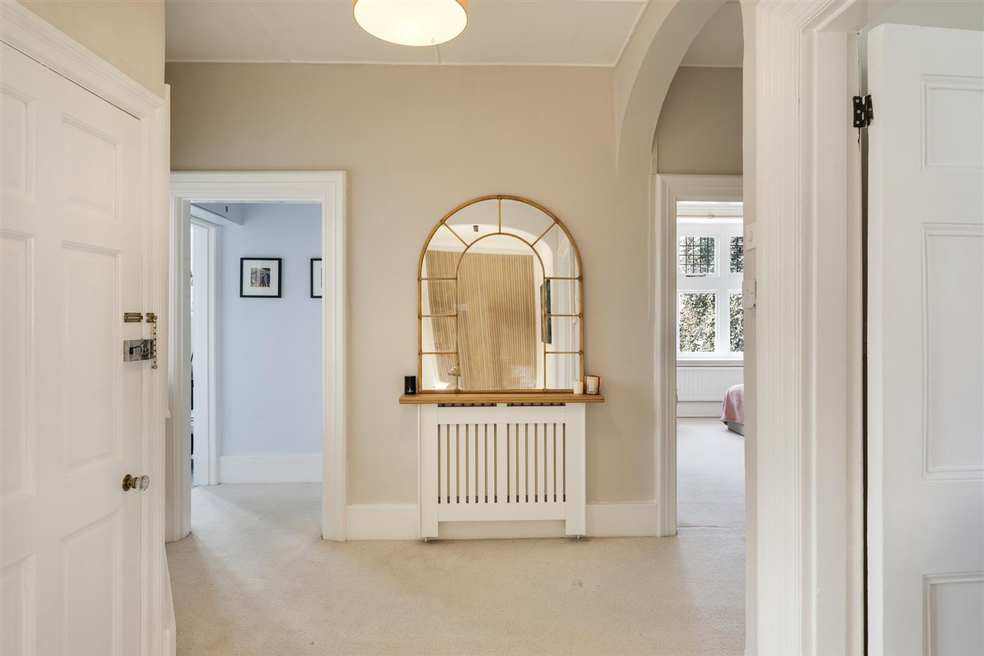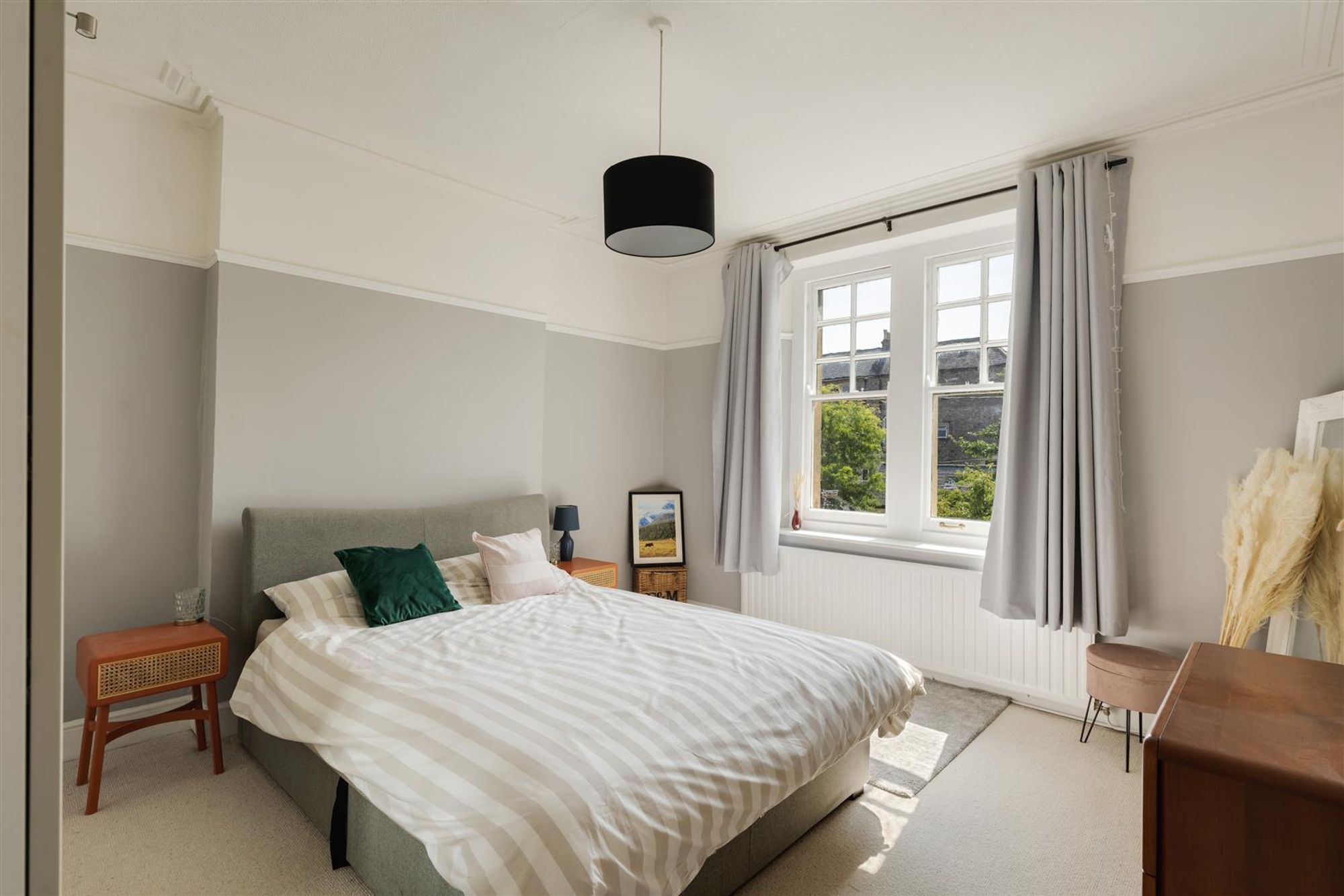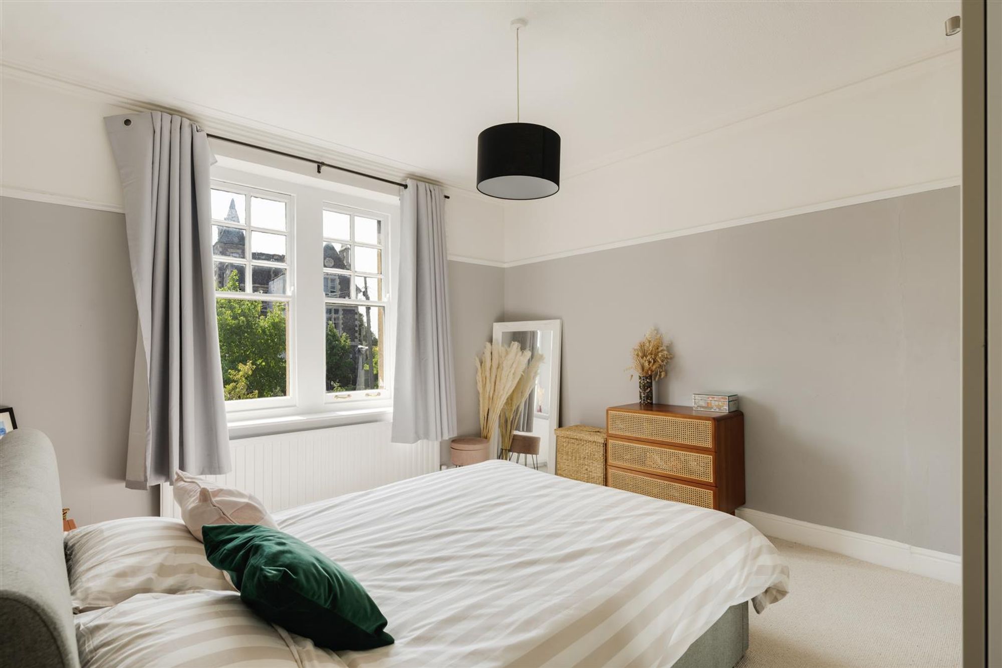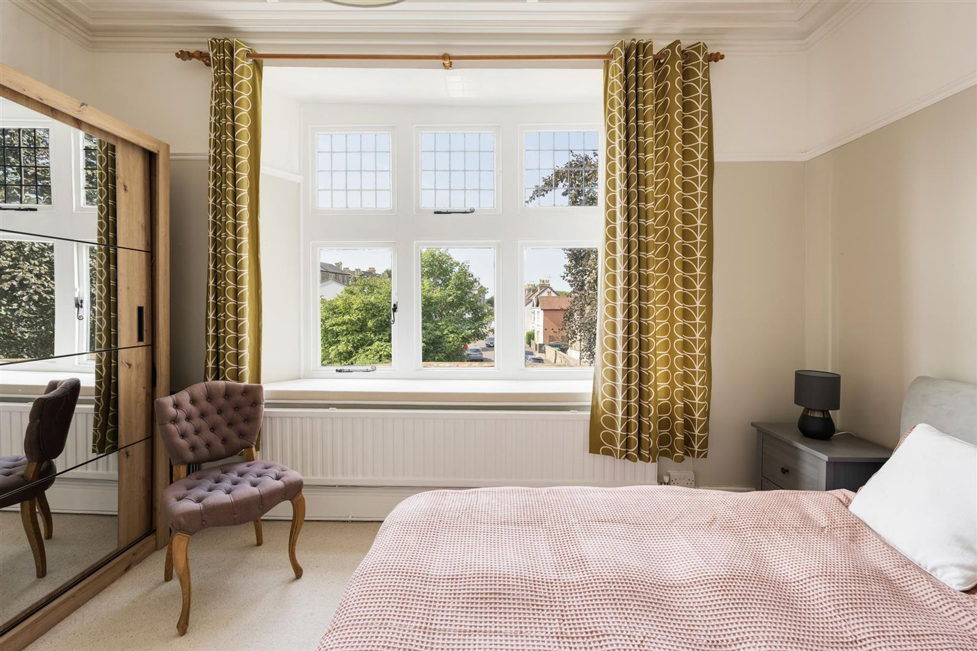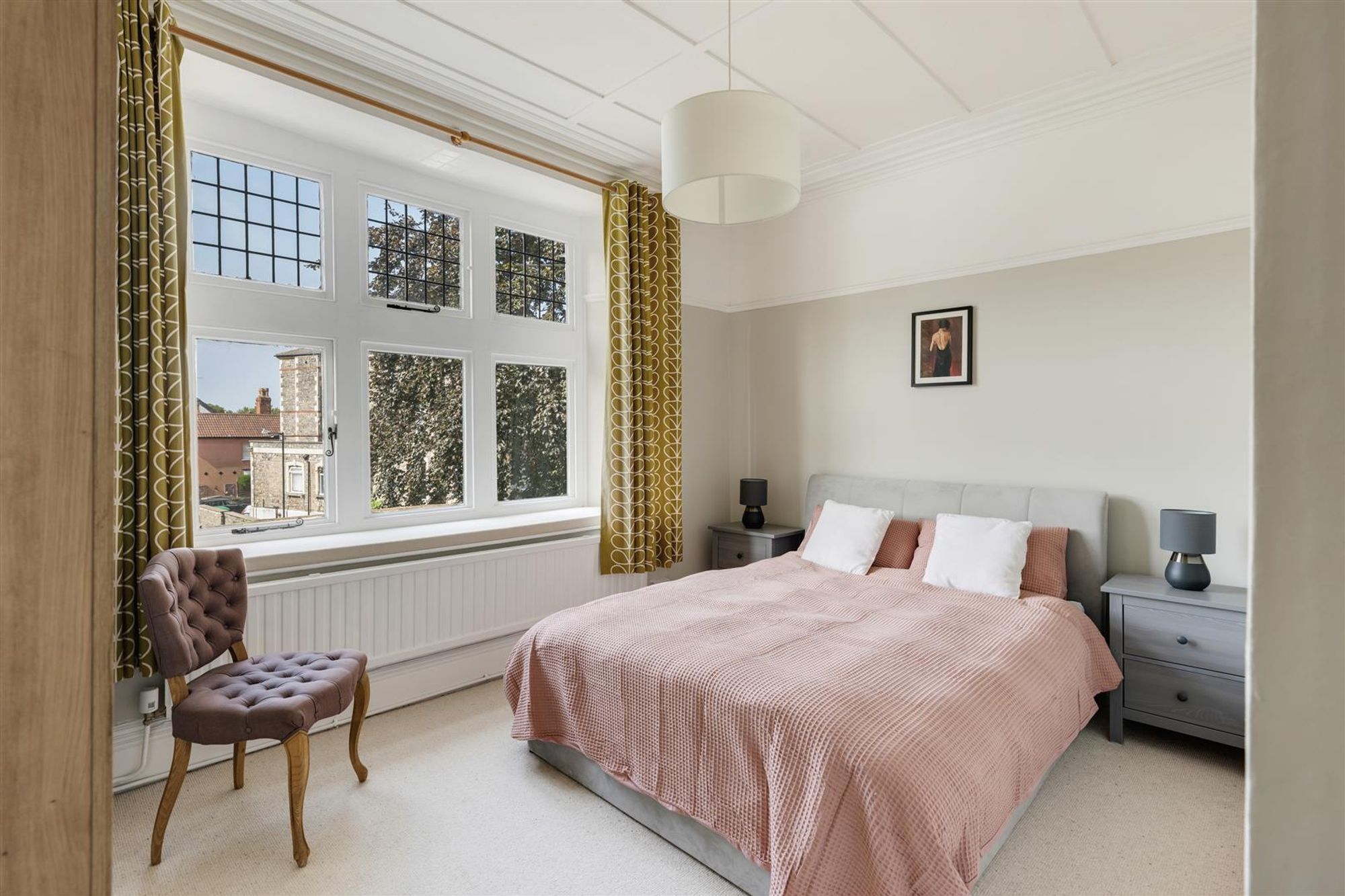 The primary bedroom is a calm and restful space, with a panelled ceiling adding character and windows bringing in plenty of natural light. Neutral tones and generous proportions ensure there is ample room for wardrobes and additional furniture. The second bedroom is similarly bright and spacious, with sash windows and classic detailing, while the third bedroom is currently arranged as a study. With a charming leaded window, it offers flexibility to serve as a guest room or nursery.