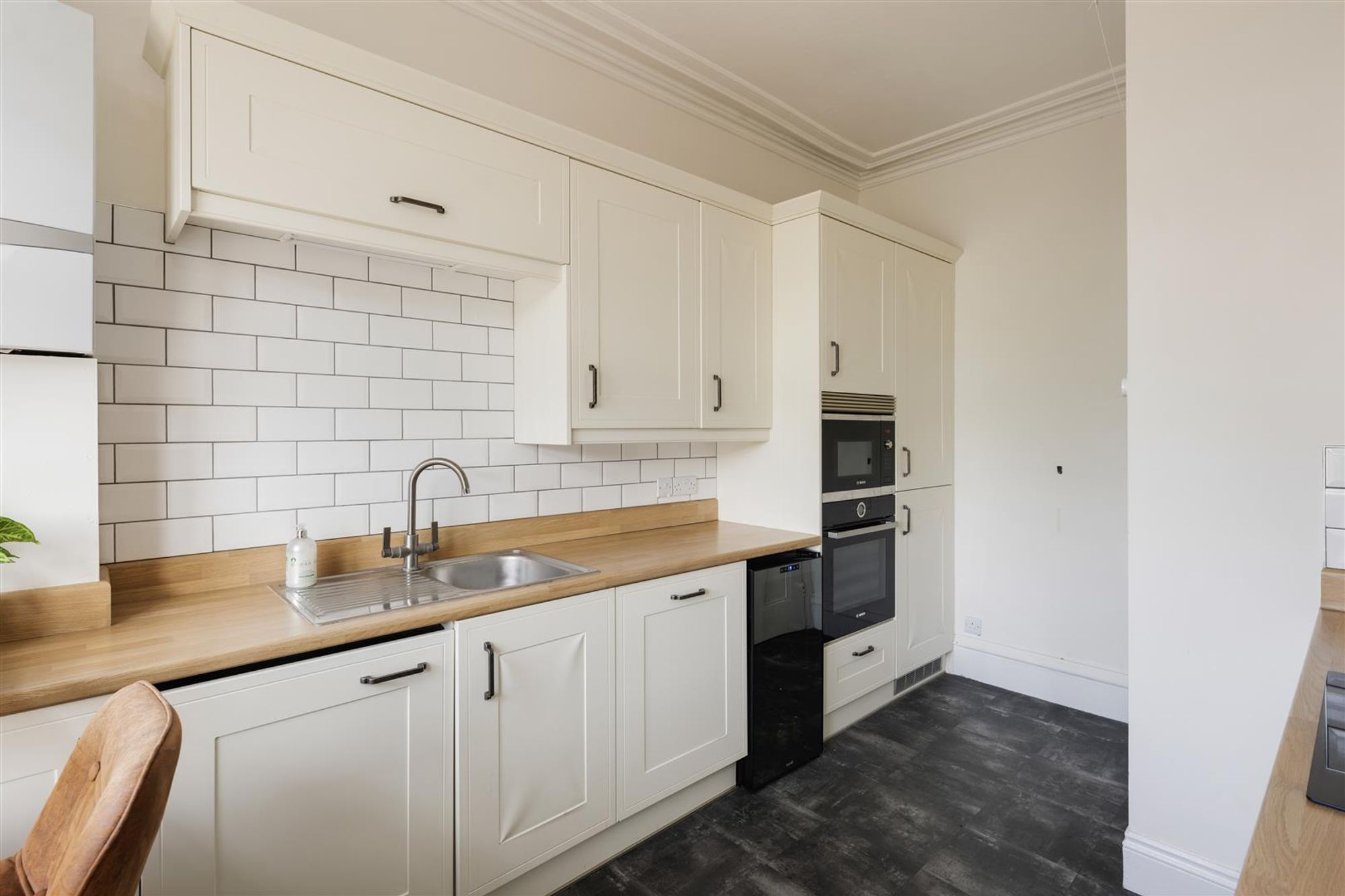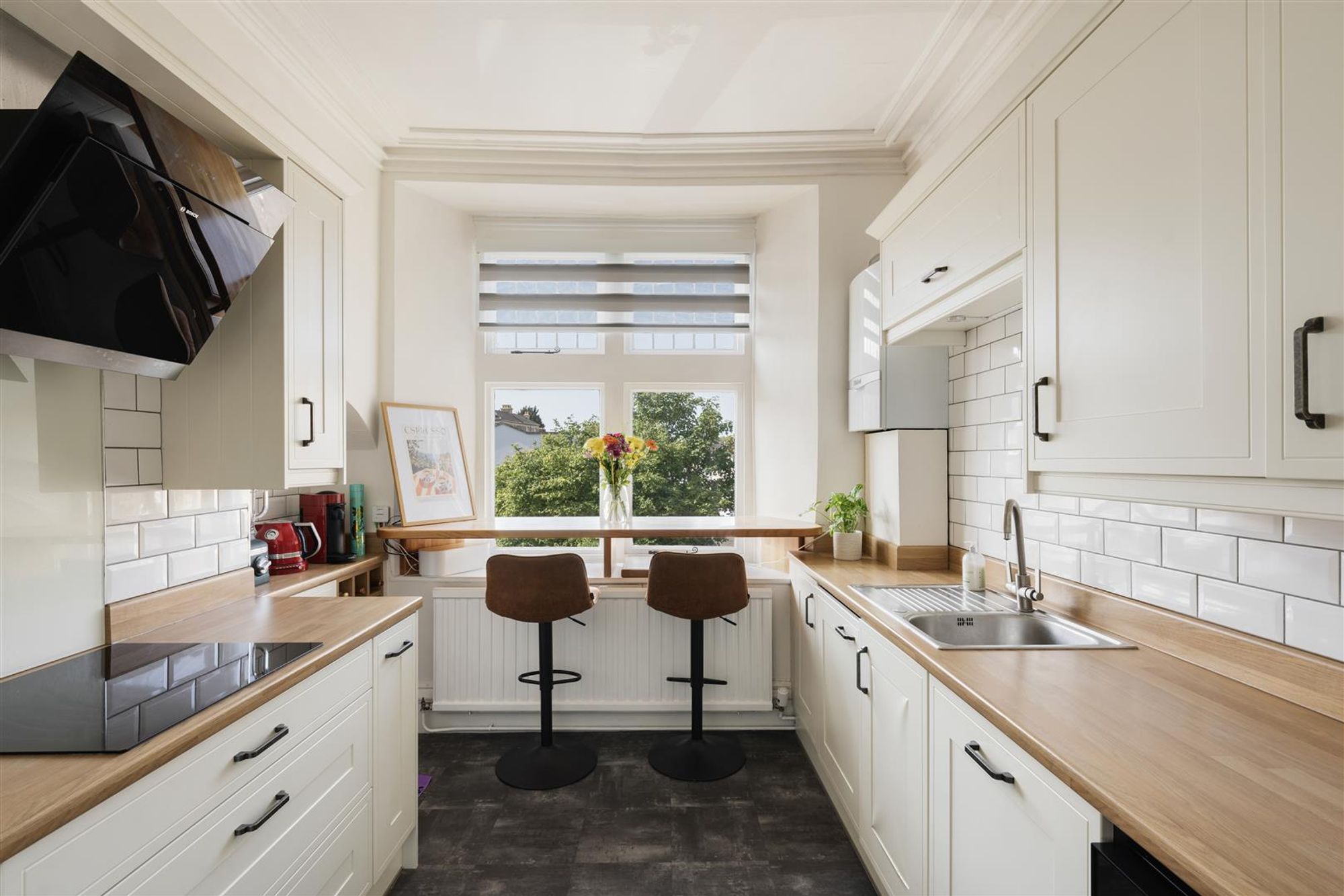 The kitchen is bright and well configured, with cream shaker-style cabinetry and wooden worktops. White subway tiles give a modern edge, while wall and base units provide plenty of storage alongside integrated appliances. A neat breakfast bar set in front of the window creates a sunny corner to enjoy morning coffee.