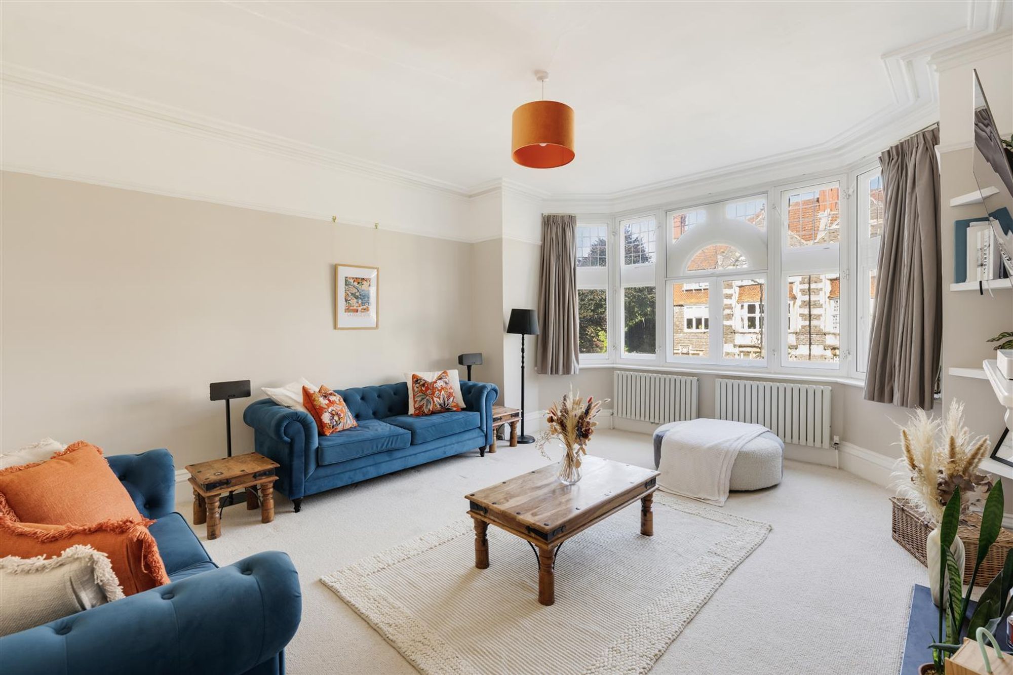 The living room is a spacious and light-filled room at the front of the building. A large bay window allows natural light to flood this room, while ornate cornicing and a period fireplace add warmth and character. Built-in shelving in one of the alcoves provides a practical addition without compromising style.