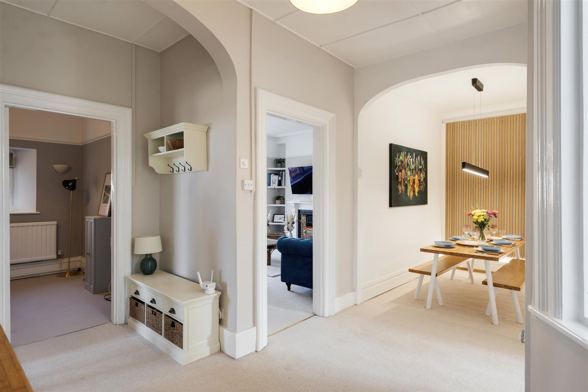 Adjacent, the wide hallway has been cleverly utilised to create a dining area. Wooden panelling, ambient and pendant lighting help create a stylish and practical space which is an ideal spot for entertaining.