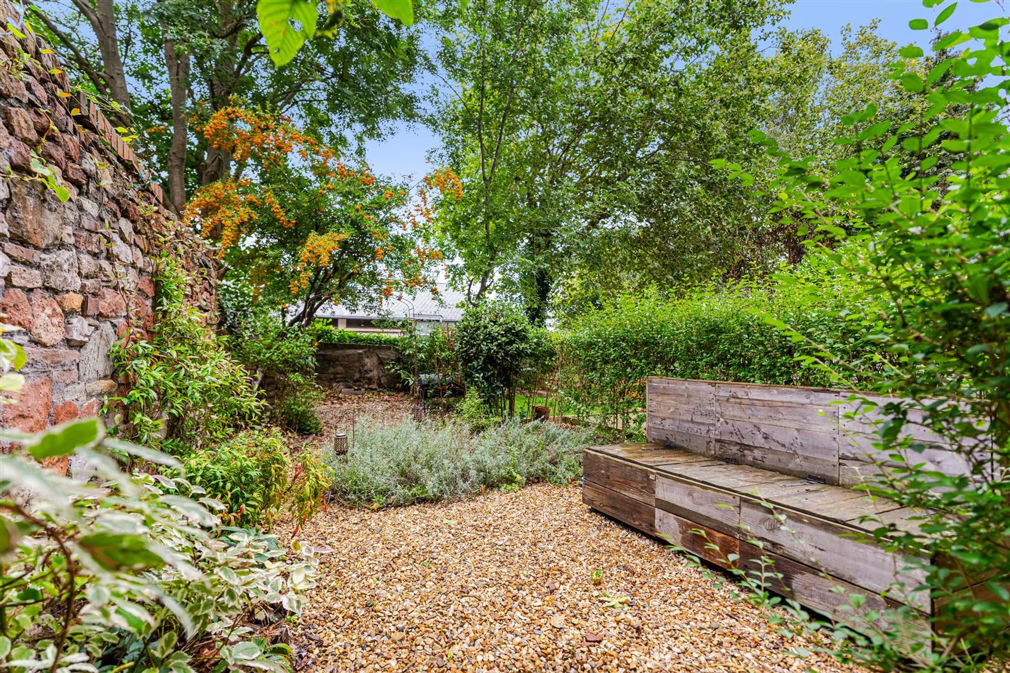 At the rear, the private garden feels secluded and peaceful, surrounded by mature trees. Built-in wooden seating makes it a perfect spot for relaxing or entertaining.