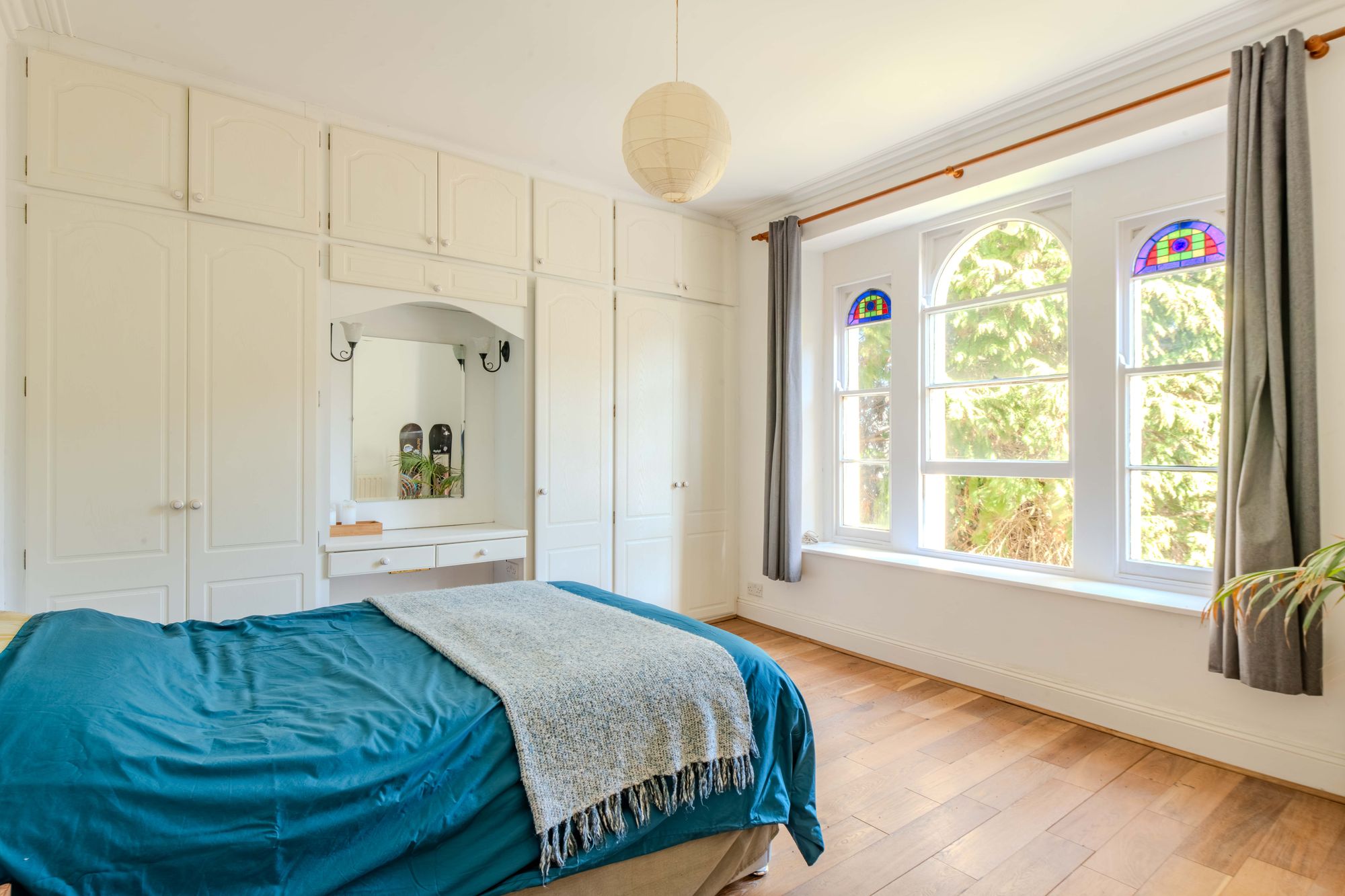 The principal bedroom sits at the front of the building and is particularly well proportioned. Original sash windows, high ceilings and built-in wardrobes combine to create a calm and comfortable room with good natural light.