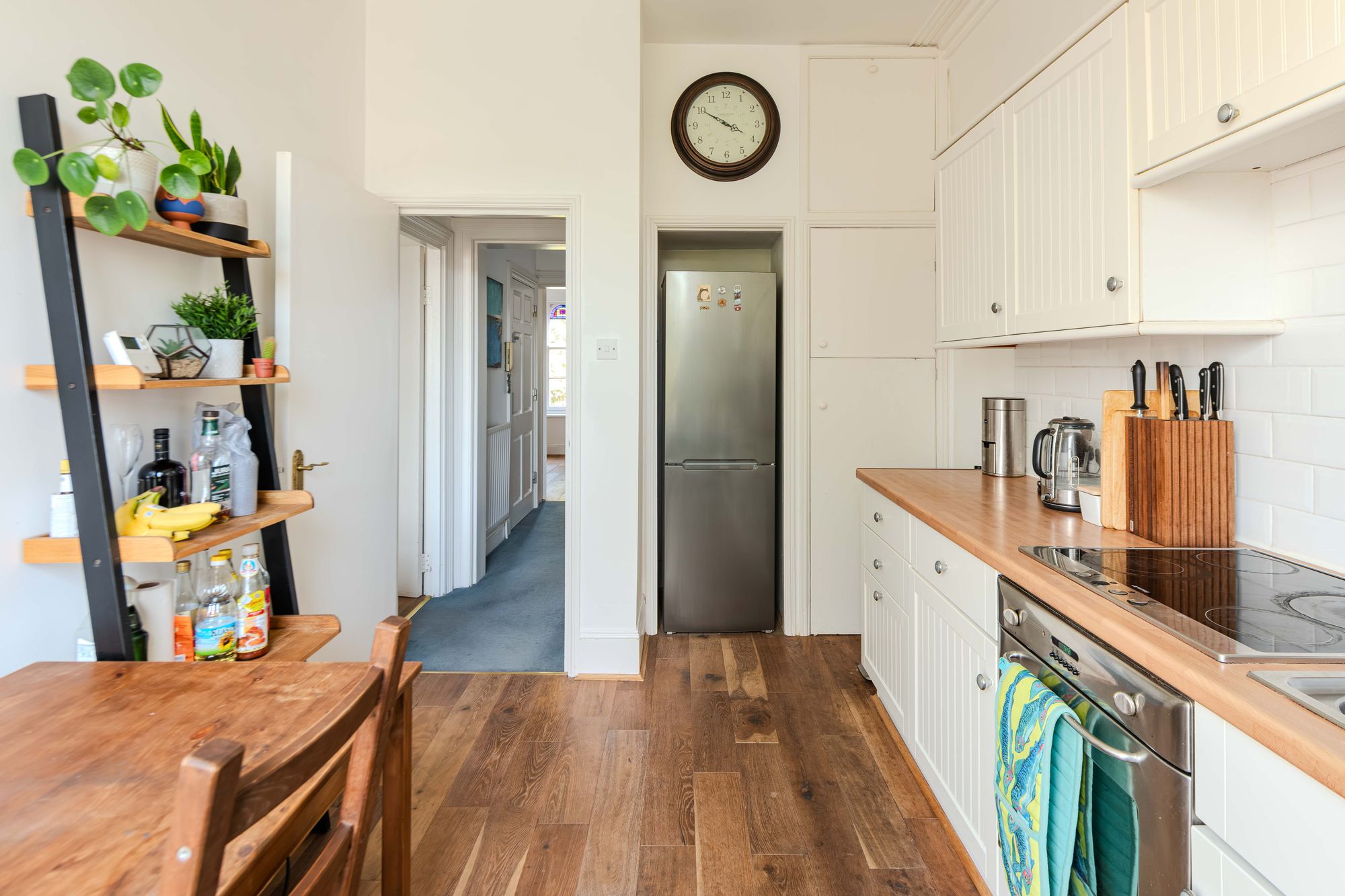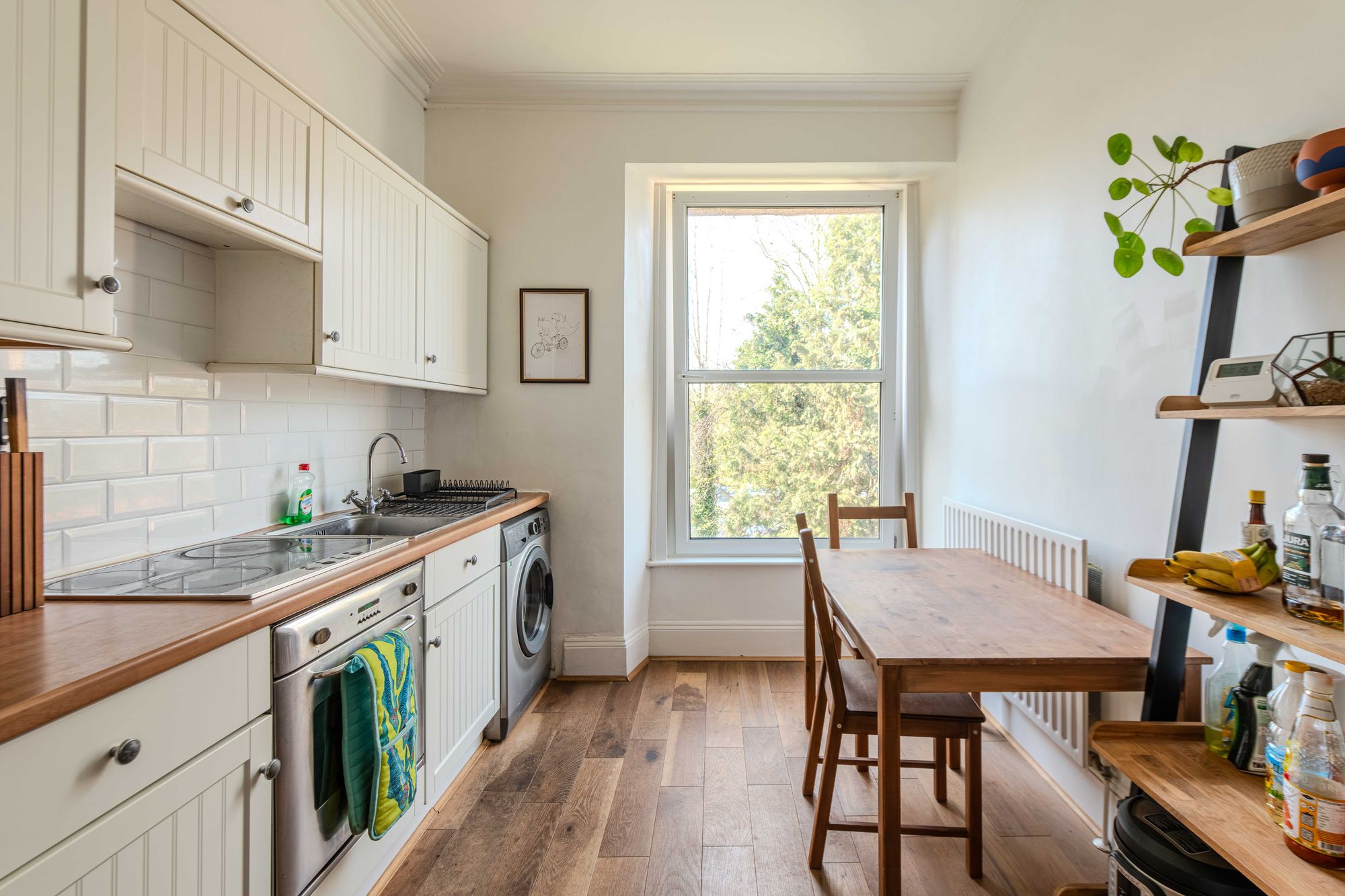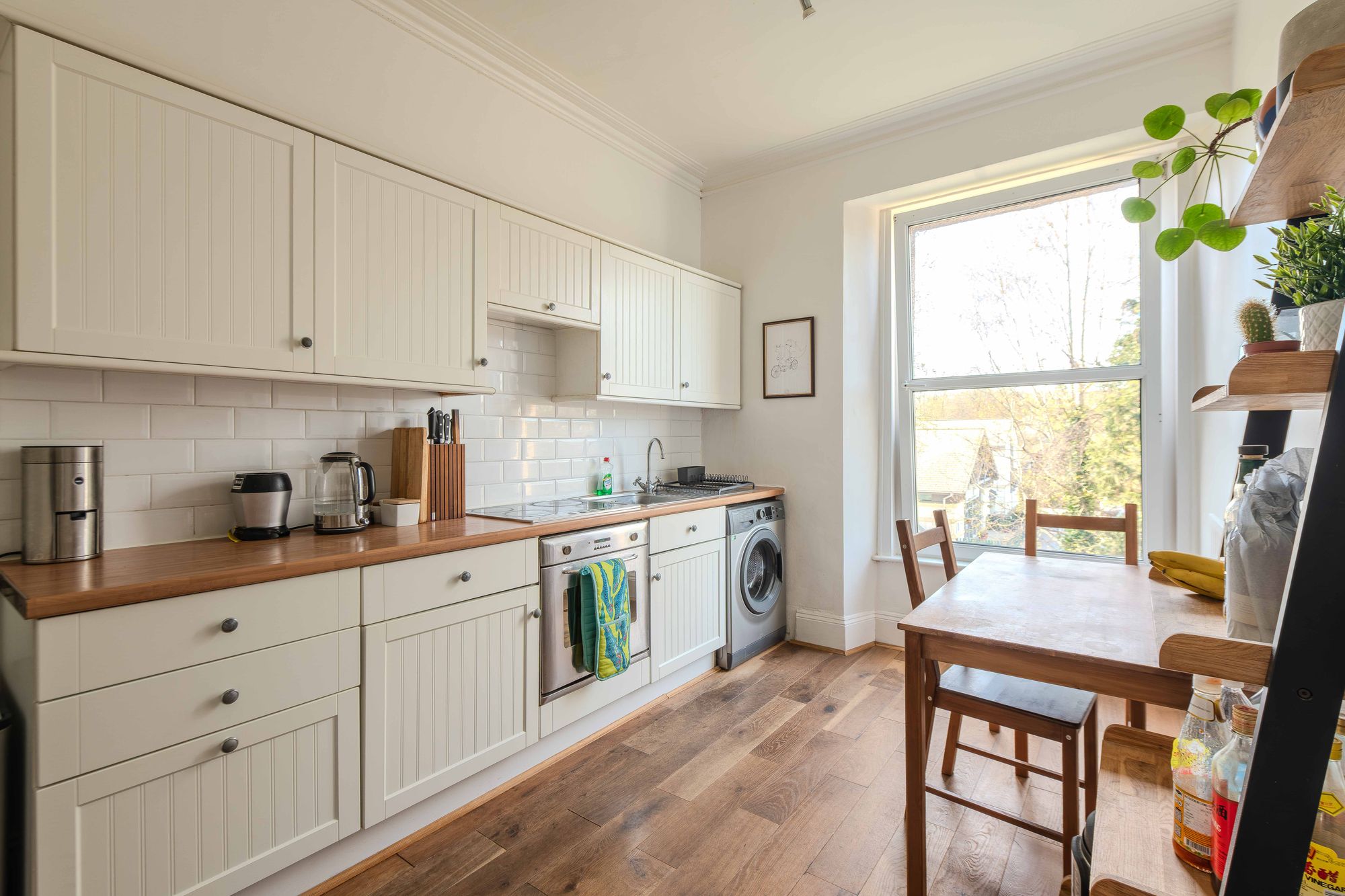 To the rear, both the kitchen and living space benefit from a green, open outlook. The kitchen is arranged to allow space for dining, with white cabinetry, metro-tiled splashbacks and contrasting worktops. A large built in cupboard provides additional storage.