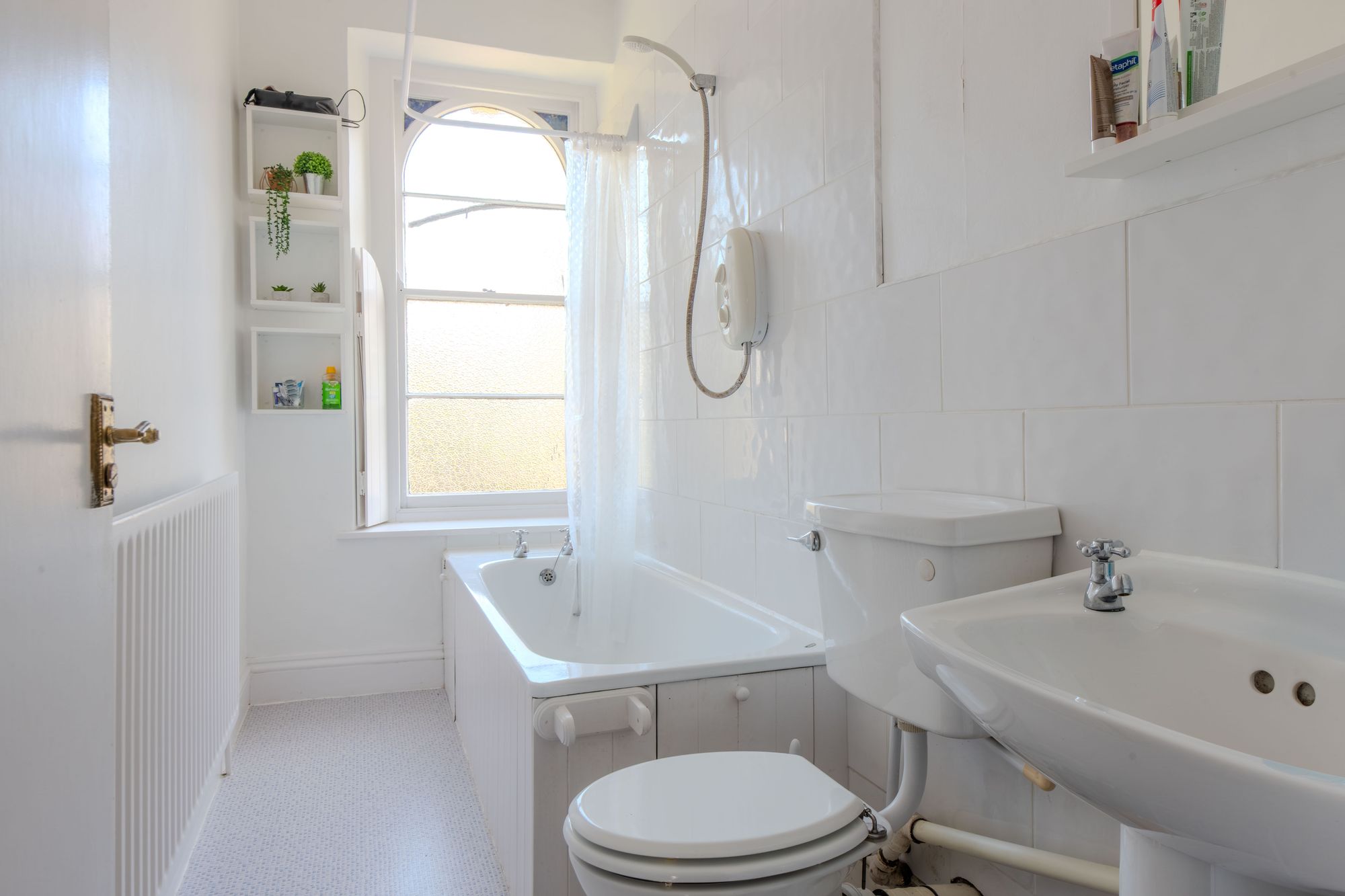 Also positioned at the front, the bathroom is simply finished with a white suite, tiled splashbacks and a sash window, maintaining a clean and functional feel.
