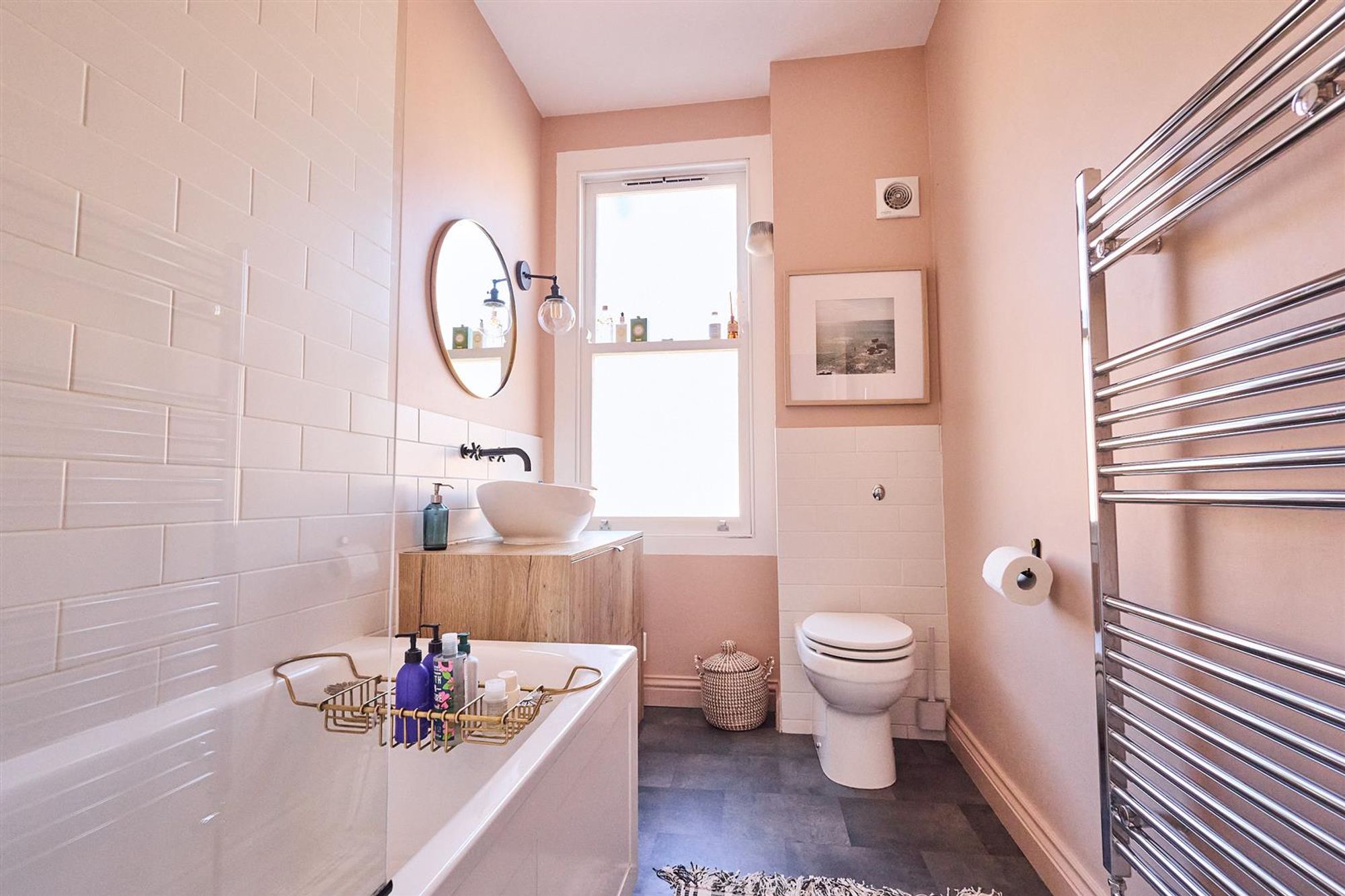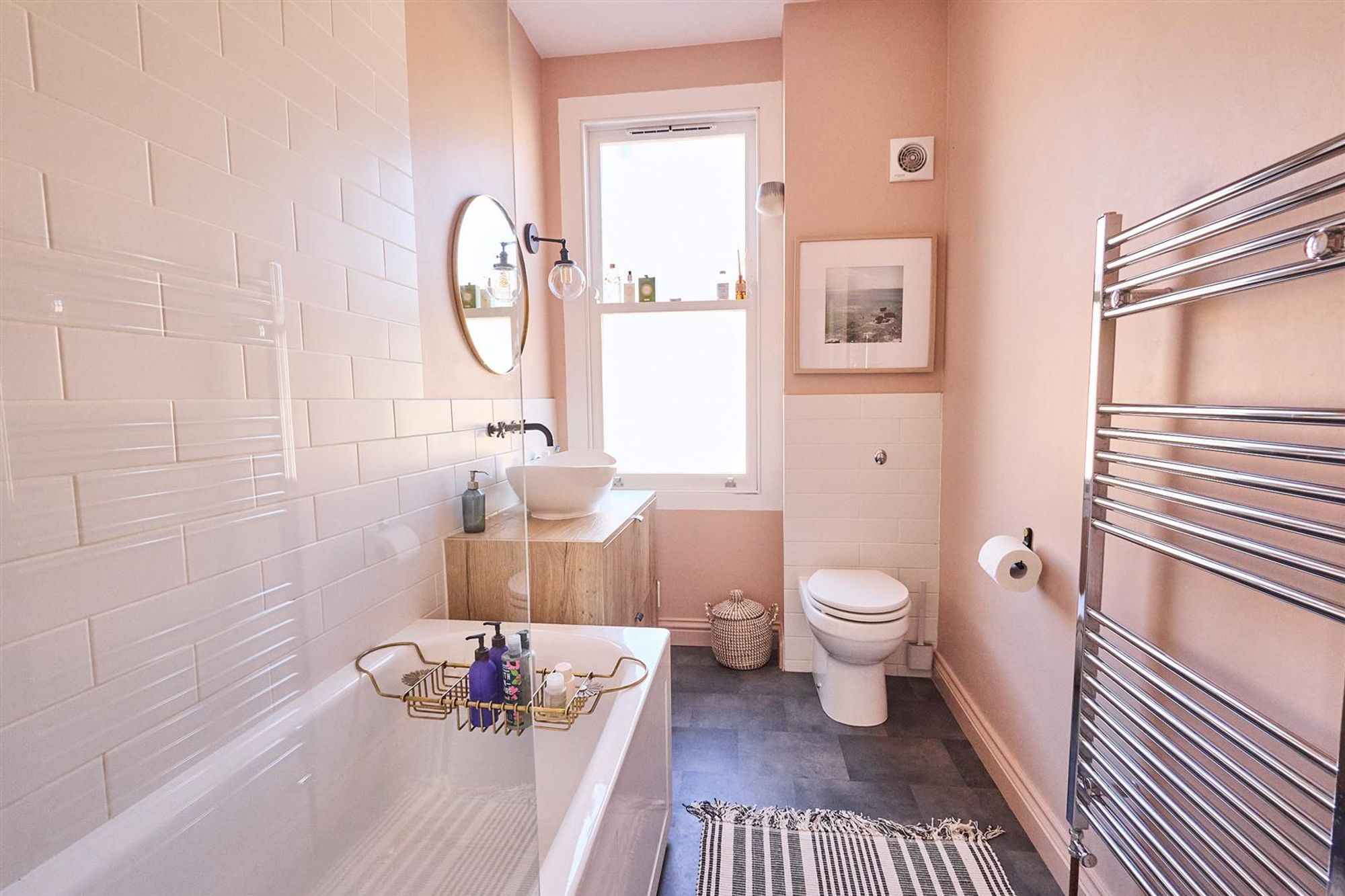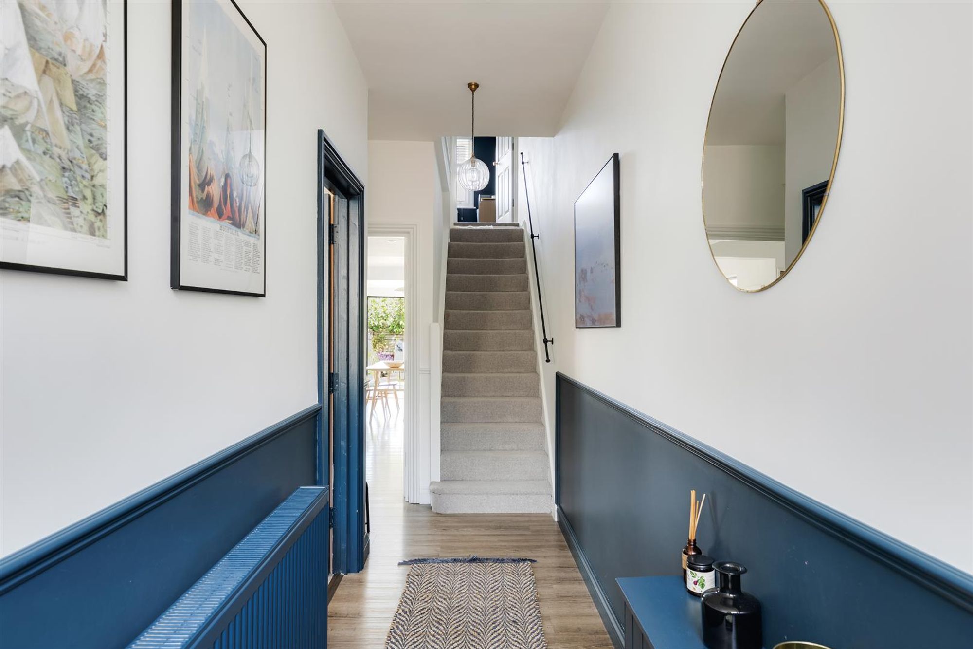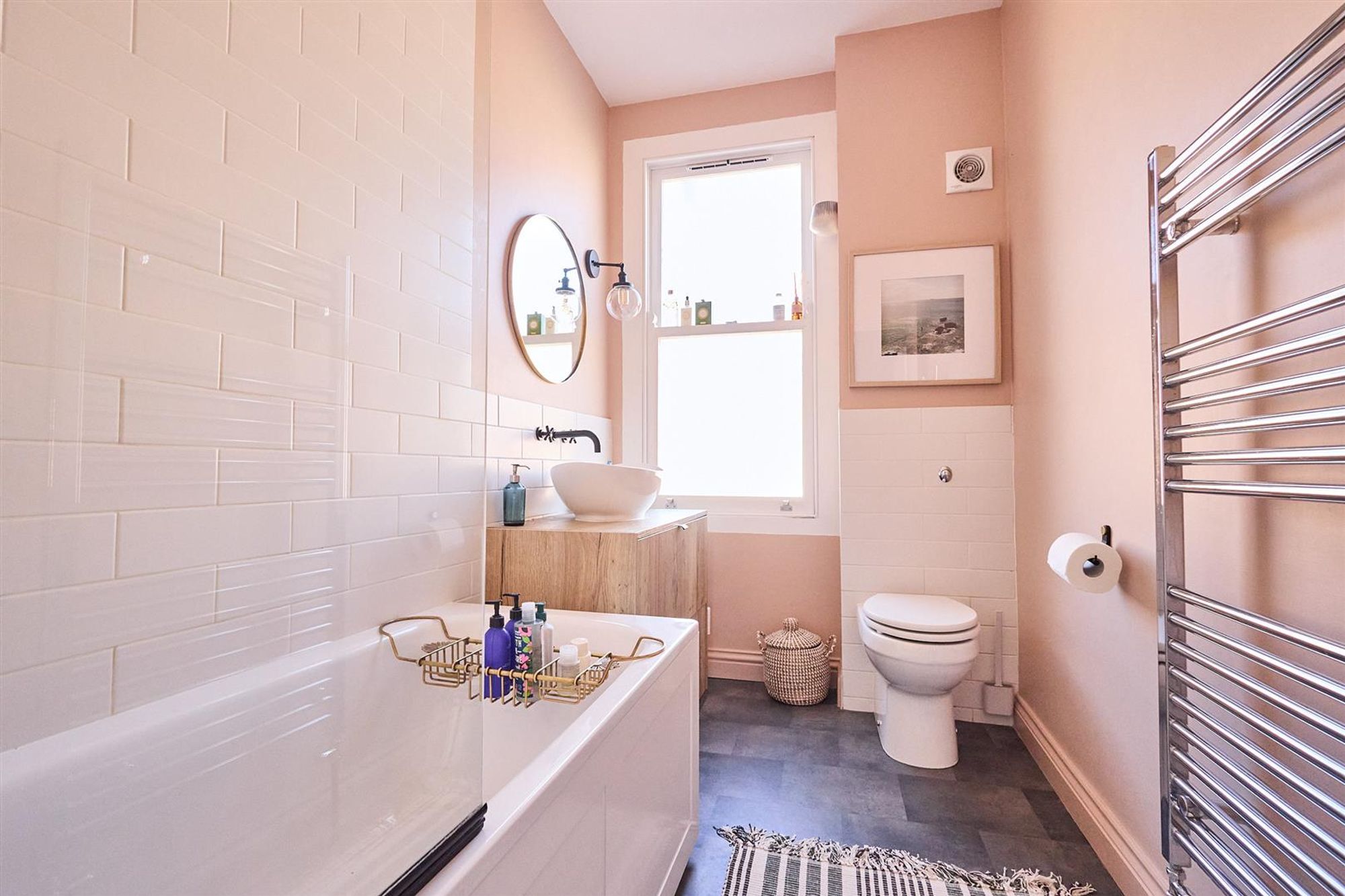 A staircase leads up to the first floor to three bedrooms and a family bathroom. At the front of the house bedroom one benefits from double glazed timber-framed sash windows, cornice and a stripped wooden floor. Next door is a smartly finished bathroom featuring a modern white suite with matte black fittings, floor to ceiling tiled splash-backs and a heated towel rail.