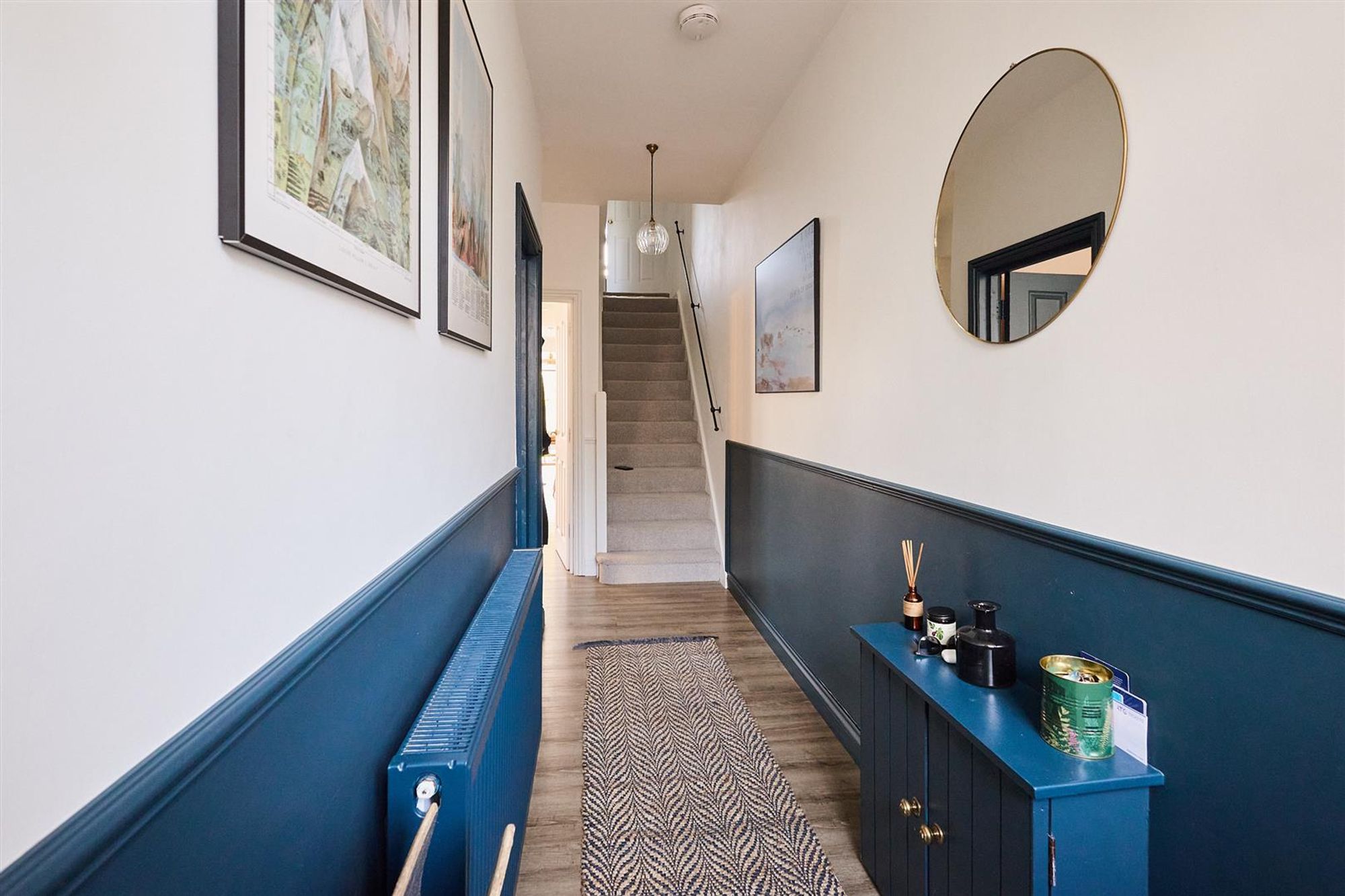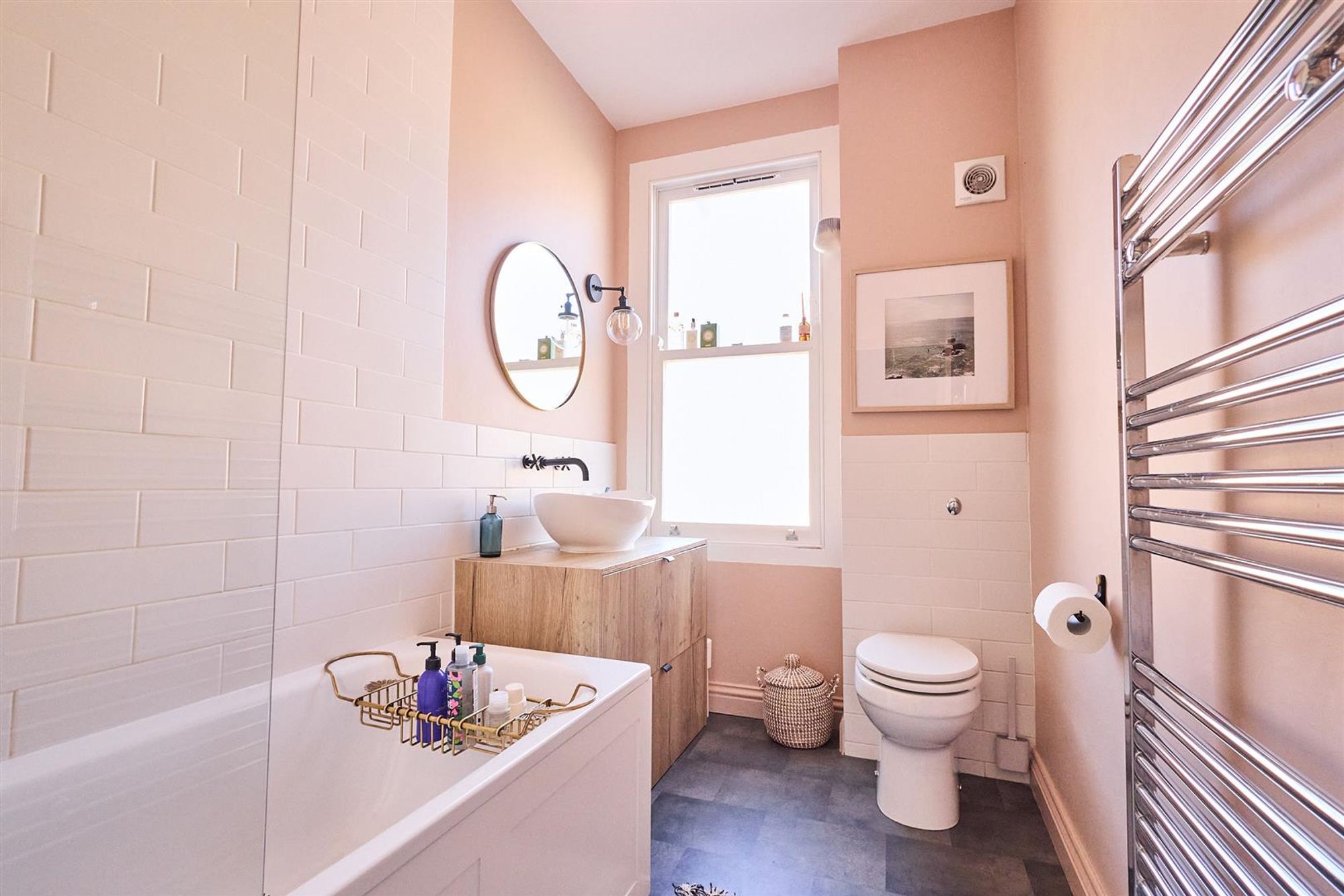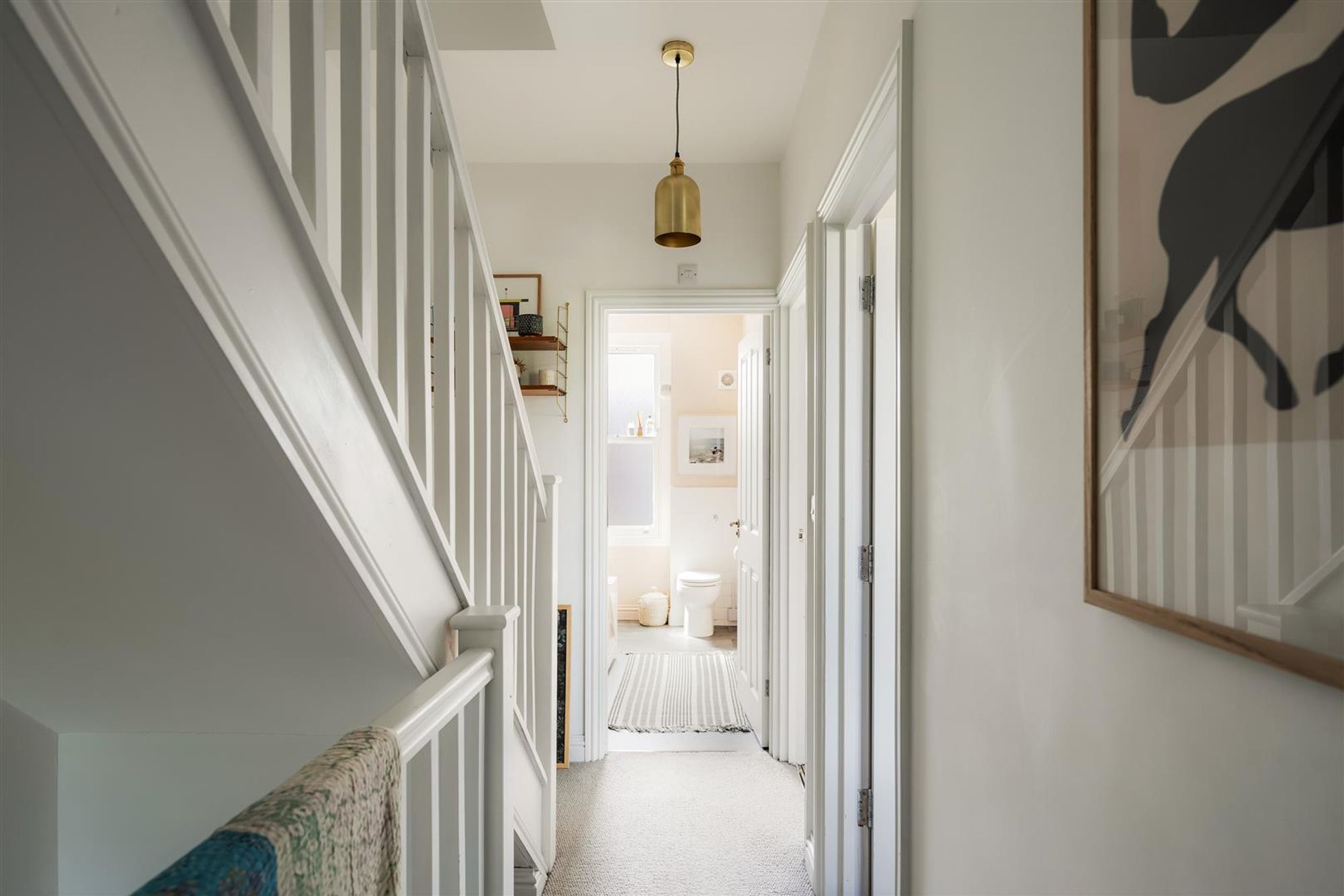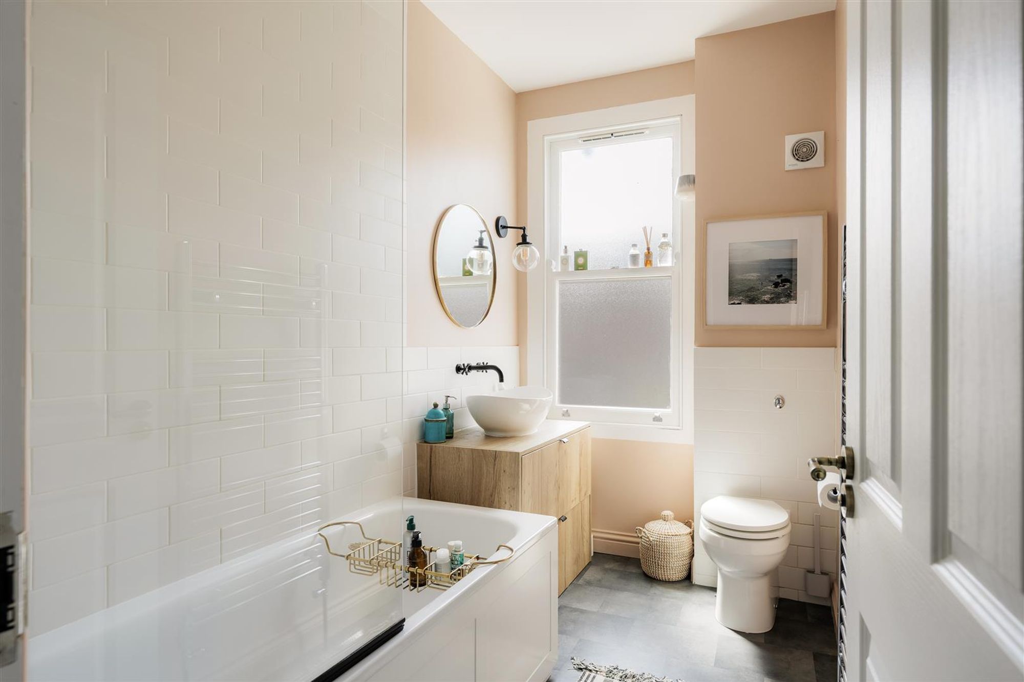 A staircase leads up to the first floor to three bedrooms and a family bathroom. At the front of the house bedroom one benefits from double glazed timber-framed sash windows, cornice and a stripped wooden floor. Next door is a smartly finished bathroom featuring a modern white suite with matte black fittings, floor to ceiling tiled splash-backs and a heated towel rail.