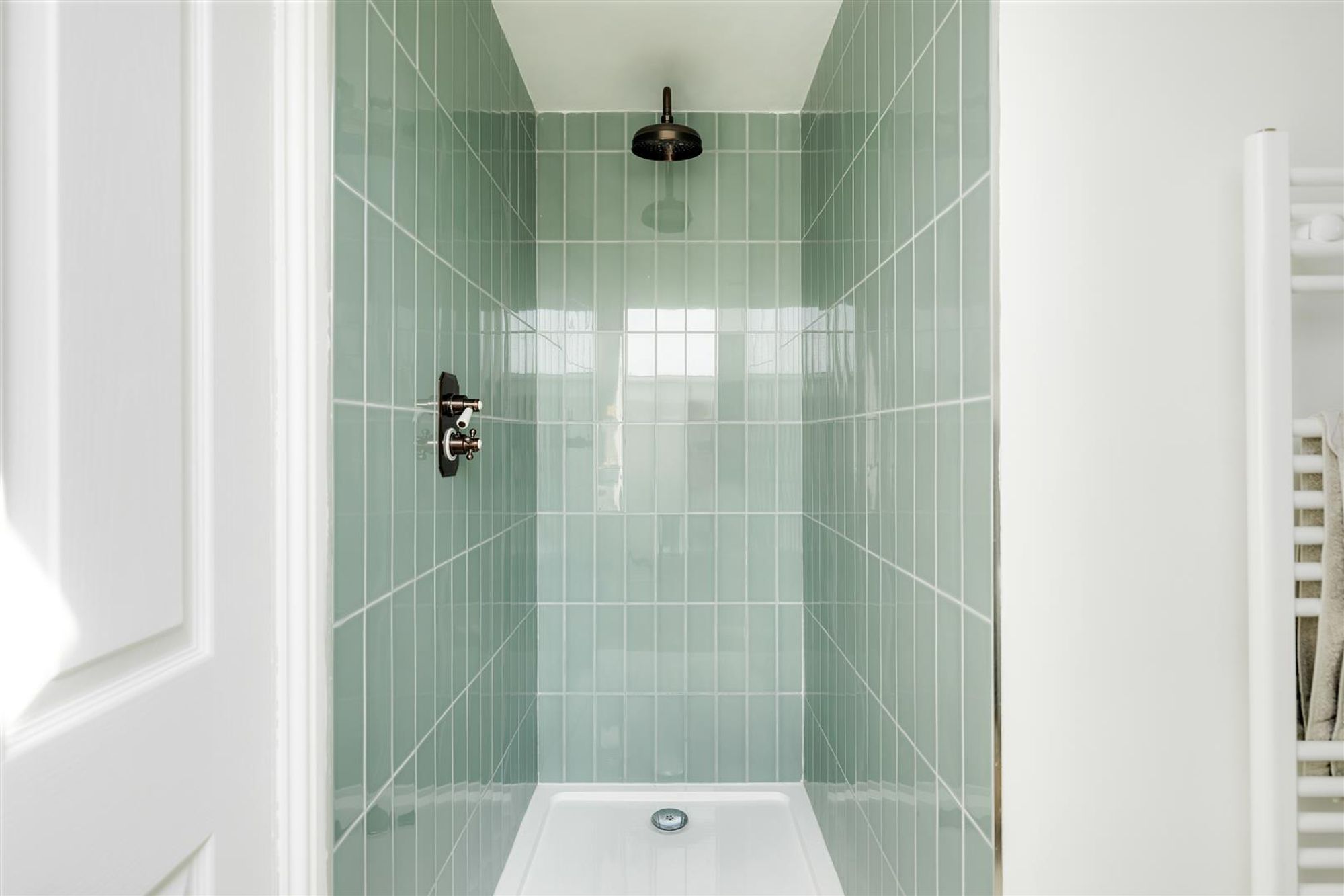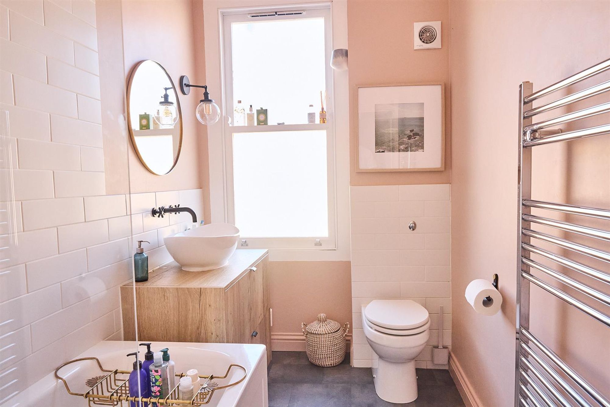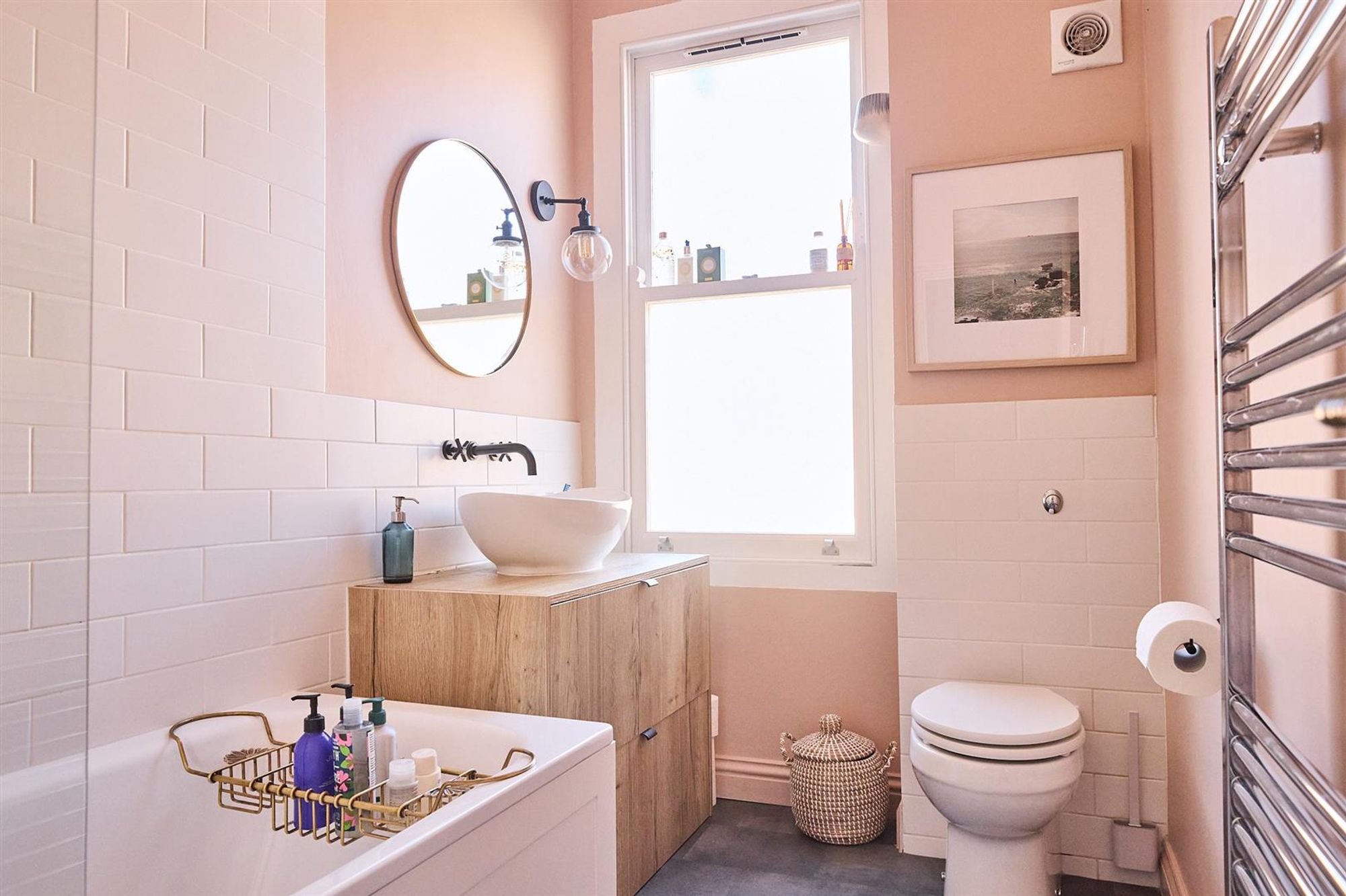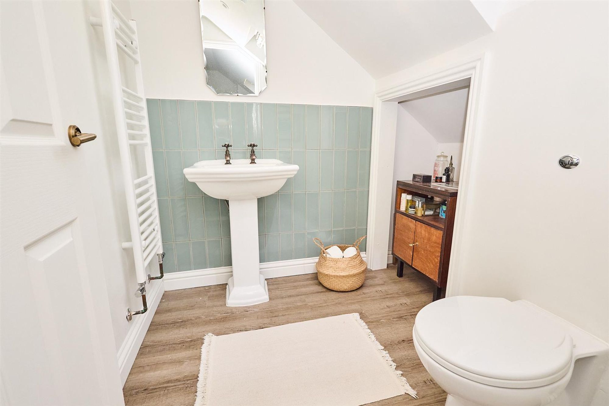 A staircase leads up to the first floor to three bedrooms and a family bathroom. At the front of the house bedroom one benefits from double glazed timber-framed sash windows, cornice and a stripped wooden floor. Next door is a smartly finished bathroom featuring a modern white suite with matte black fittings, floor to ceiling tiled splash-backs and a heated towel rail.