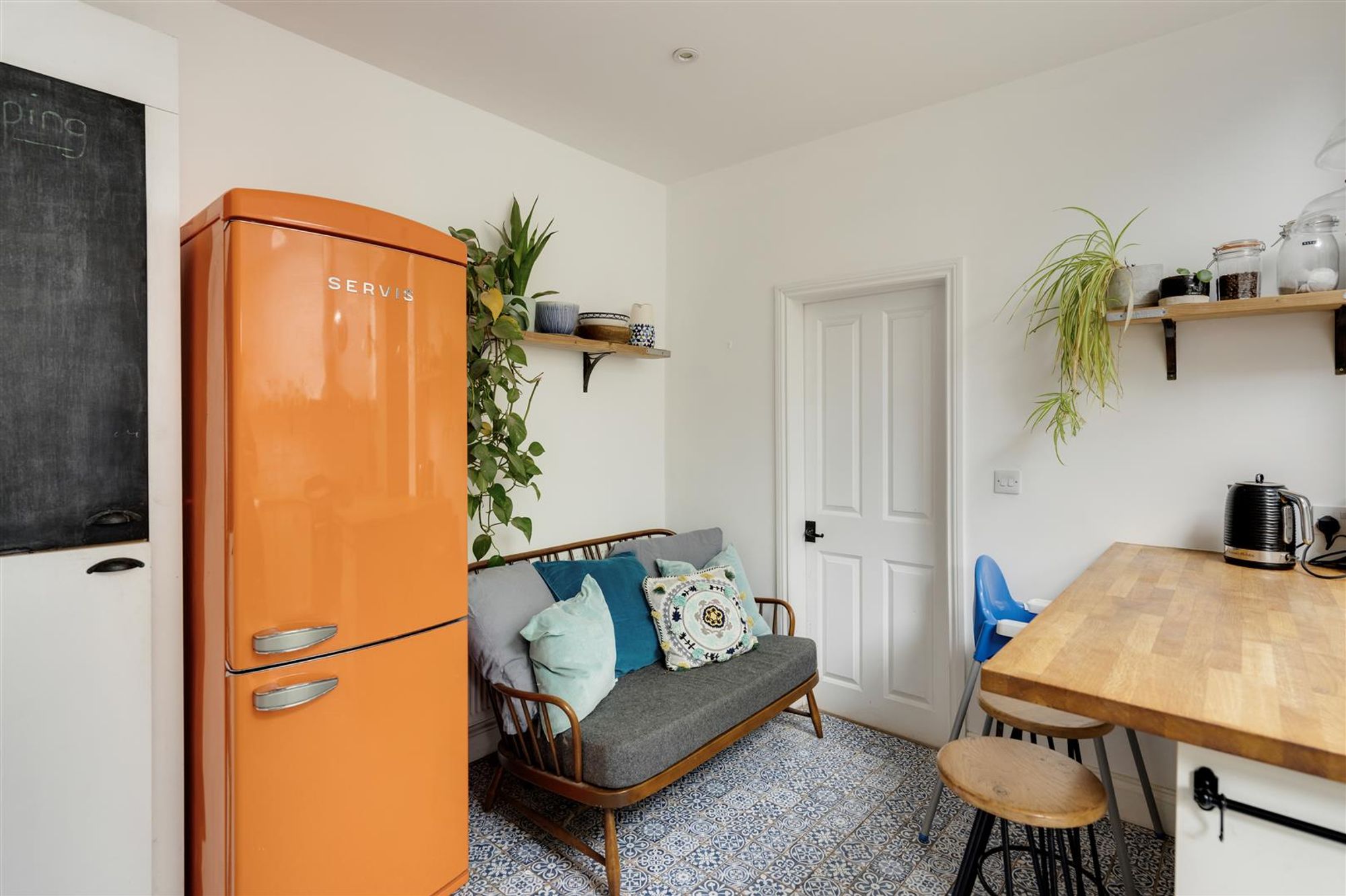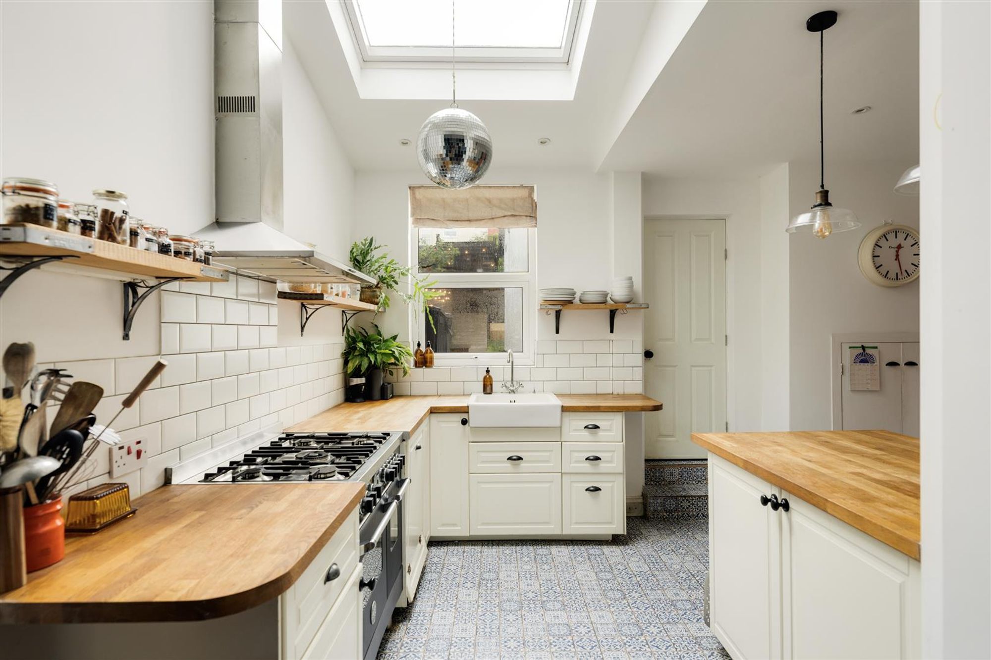 The second reception room is currently used as a dining room and benefits from a striking colour scheme with contrasting bespoke book shelves, an open fireplace with exposed brickwork and a rustic timber surround. An archway leads through into a light and bright kitchen/diner which incorporates a central island/breakfast bar. The kitchen has been fitted with a range of shaker style base units, with solid wood work surfaces, open shelving and metro style tiled splash-backs. Recessed spotlights, and a geometric tiled floor compliments the overall look. There is also plenty of space for a sofa or dining table if required. Located beyond the kitchen is a useful separate utility room offering ample extra storage and a downstairs w/c. At the rear of the ground floor is a garden room with bi-folding doors providing a seamless connection to the sunny rear garden.