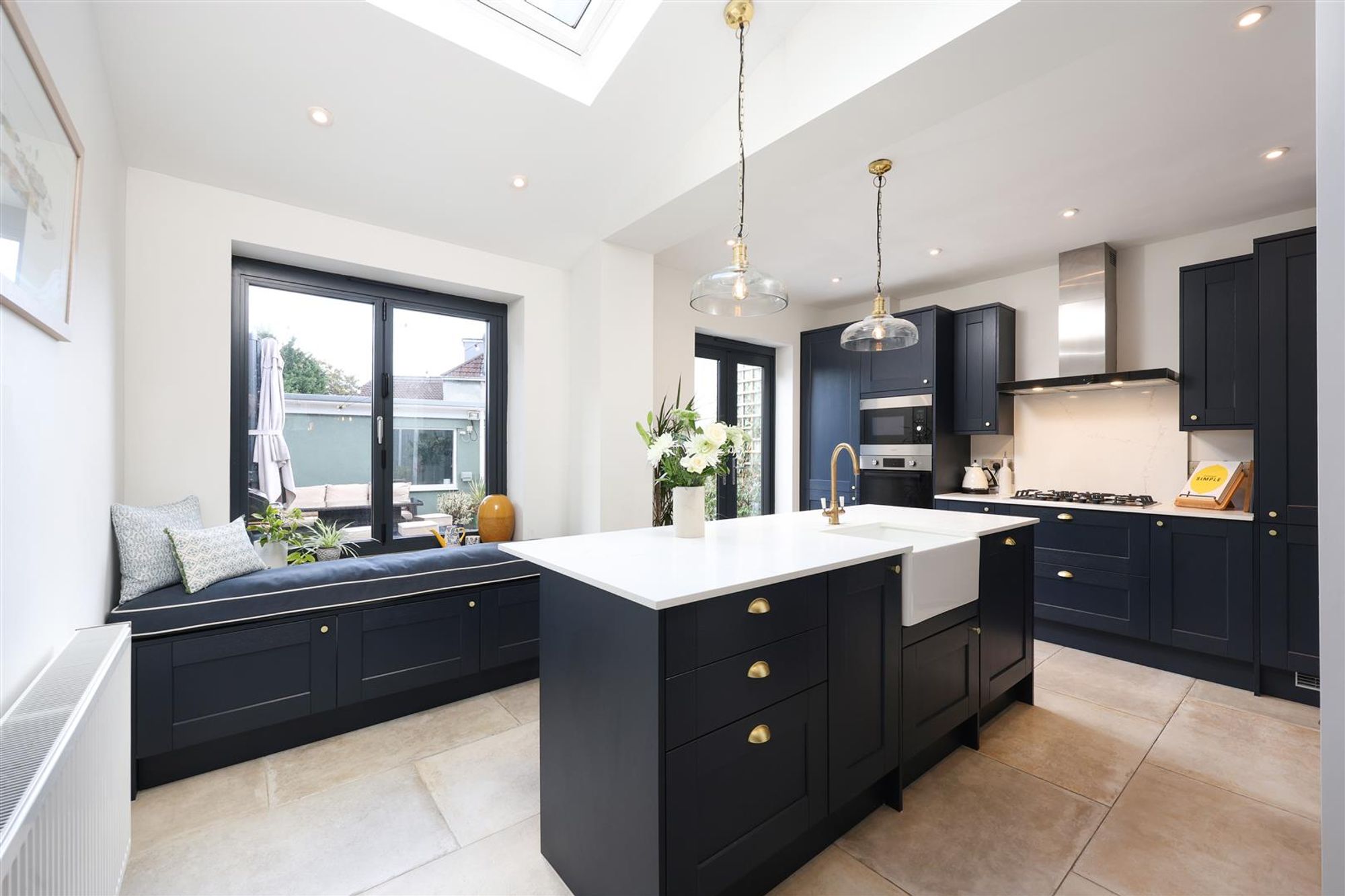 Ground floor accommodation comprises a vestibule that leads into an entrance hall with stripped wood floors, stairs that lead to the first floor with a W/C and space for a washing machine tucked beneath beneath. At the front of the property, is the living room benefitting from a bay with double glazed windows and shutters, stripped wood floors, panelled walls and ceiling cornice. Adjacent, the second reception room has been opened into the kitchen, creating a large open plan kitchen/dining space/family space. The dining room itself also benefits from stripped wood floors with tiled hearth, before opening on to an impressive kitchen/breakfast room flooded with natural light from a skylight window. The kitchen has been tastefully finished with navy wall and base units with quartz worktops, and fitted with a range of integrated appliances. Sitting centrally, there is a kitchen island creating the social hub of the home, perfect for entertaining, benefitting a Belfast sink, dishwasher and plenty of seating space. French doors seamlessly connect to the rear garden while bi-fold windows provide a pleasant view, with a seat and storage beneath.