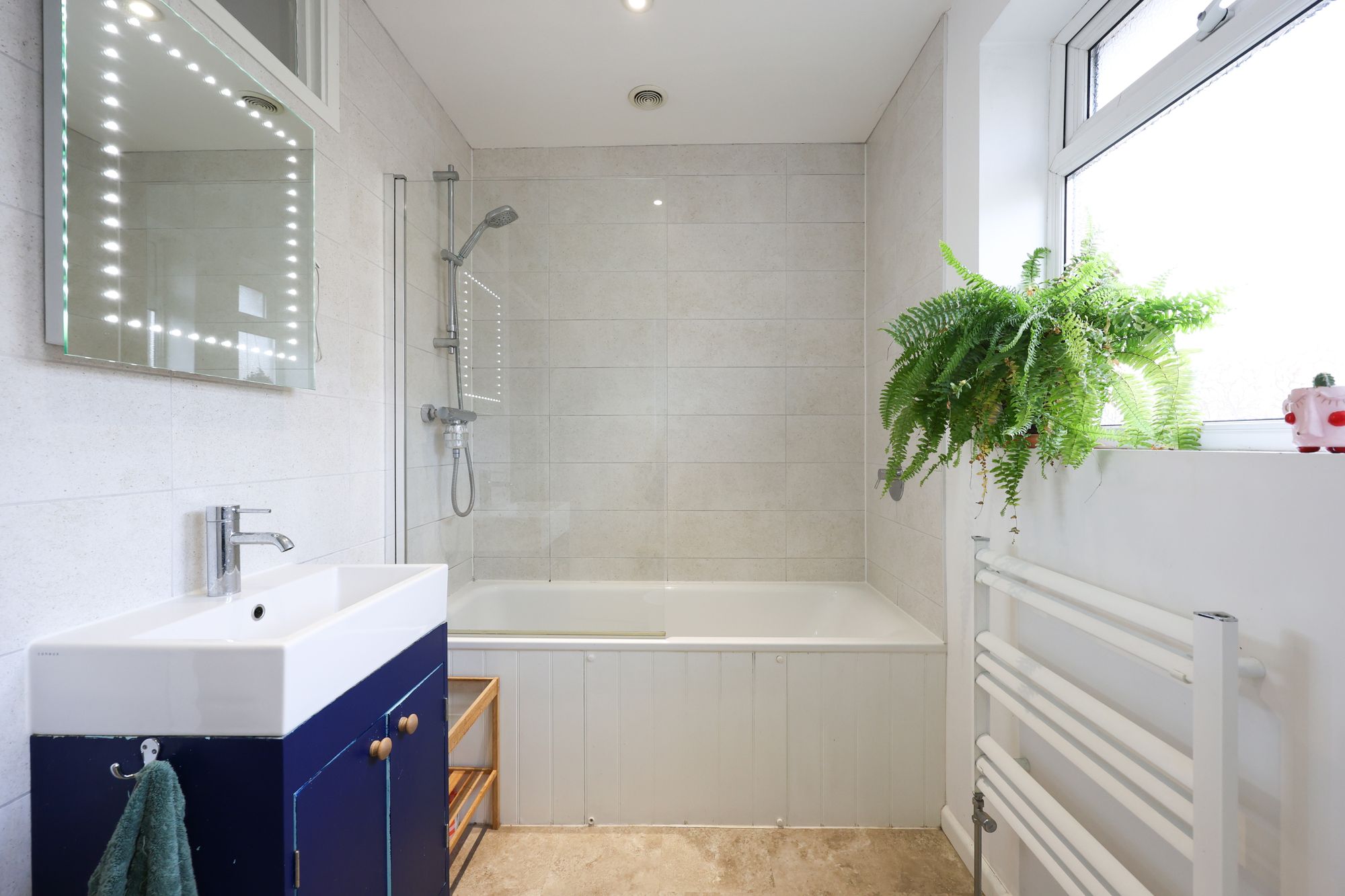 The stylish family bathroom features a modern suite, attractive tiling, a heated towel rail and a shower-over-bath.